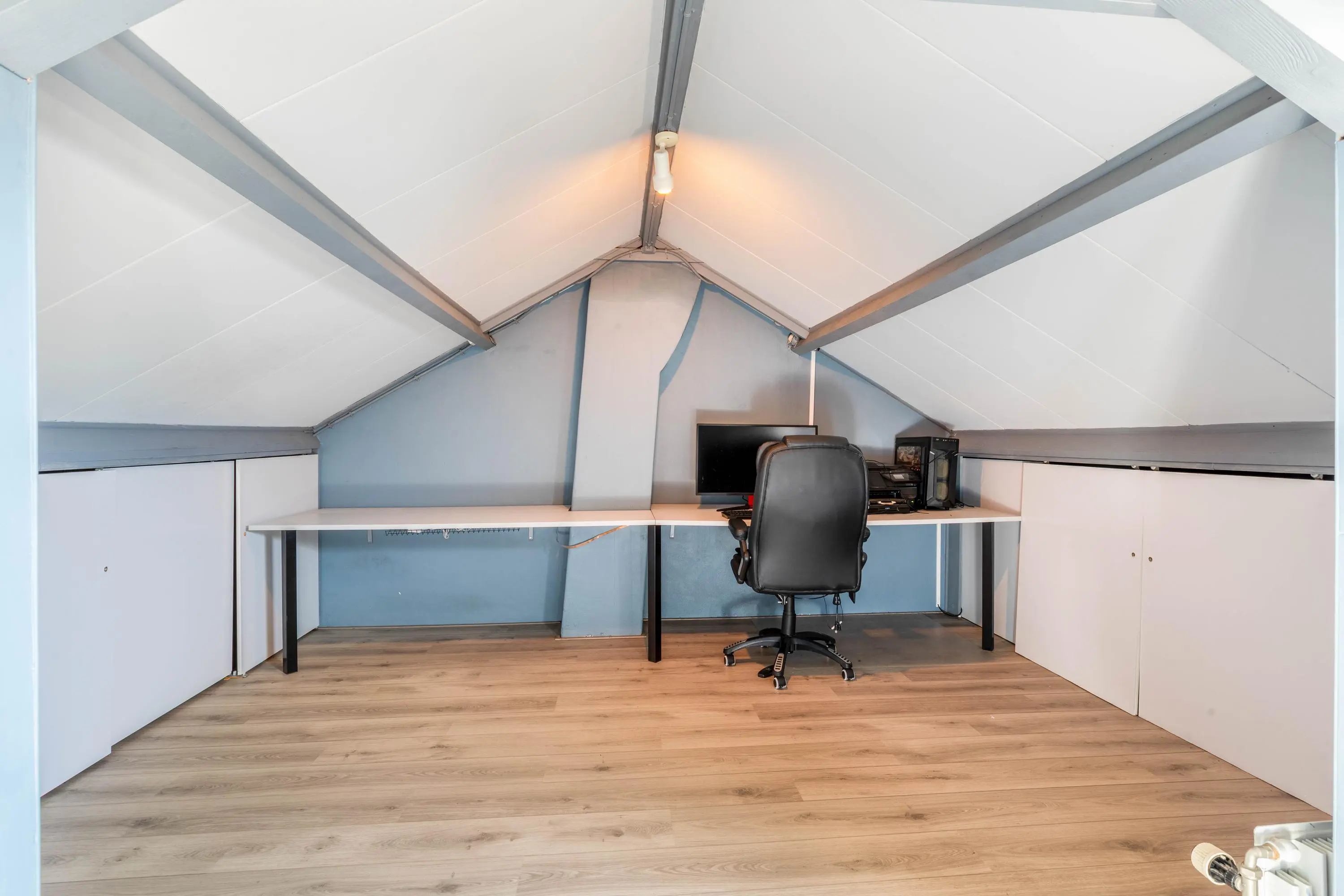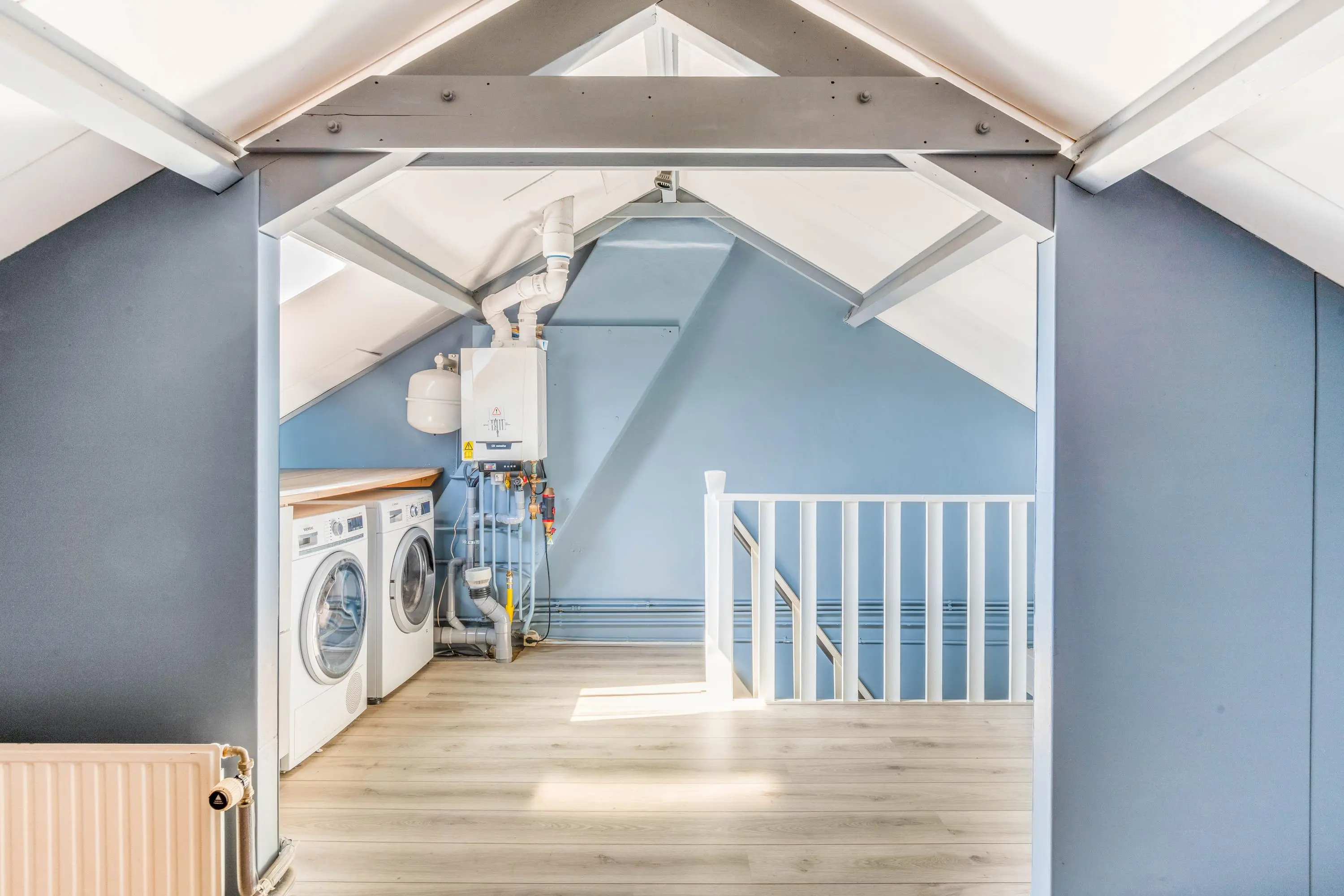 Op de eerste verdieping bevinden zich drie goed bemeten slaapkamers en een nette badkamer met inloopdouche en wastafel. De tweede verdieping biedt een ruime voorzolder met aansluitingen voor wasmachine en droger, evenals een royale vierde slaapkamer die volop mogelijkheden biedt voor bijvoorbeeld een werkplek, hobbykamer of logeerkamer.