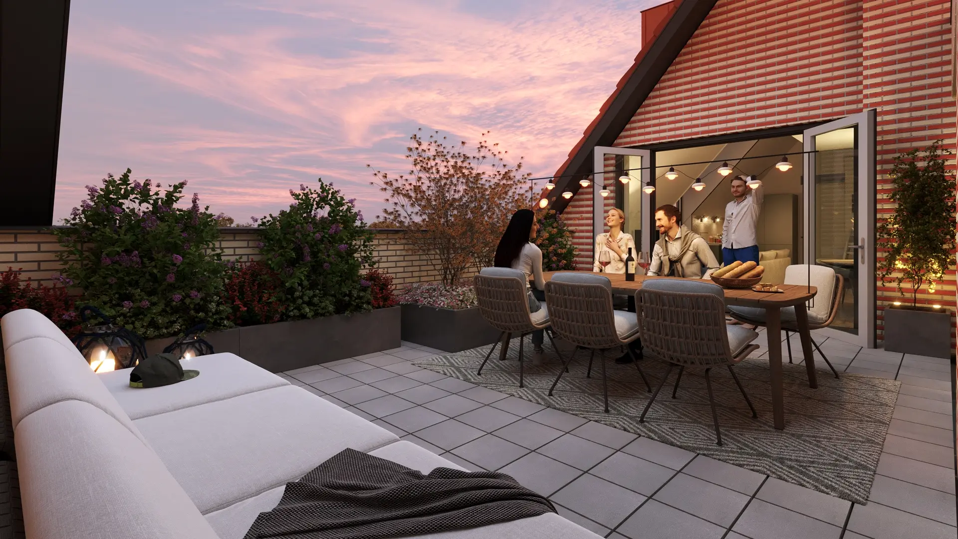 eigen ruime hoekterras op: een rustige plek om te ontspannen of buiten te eten.