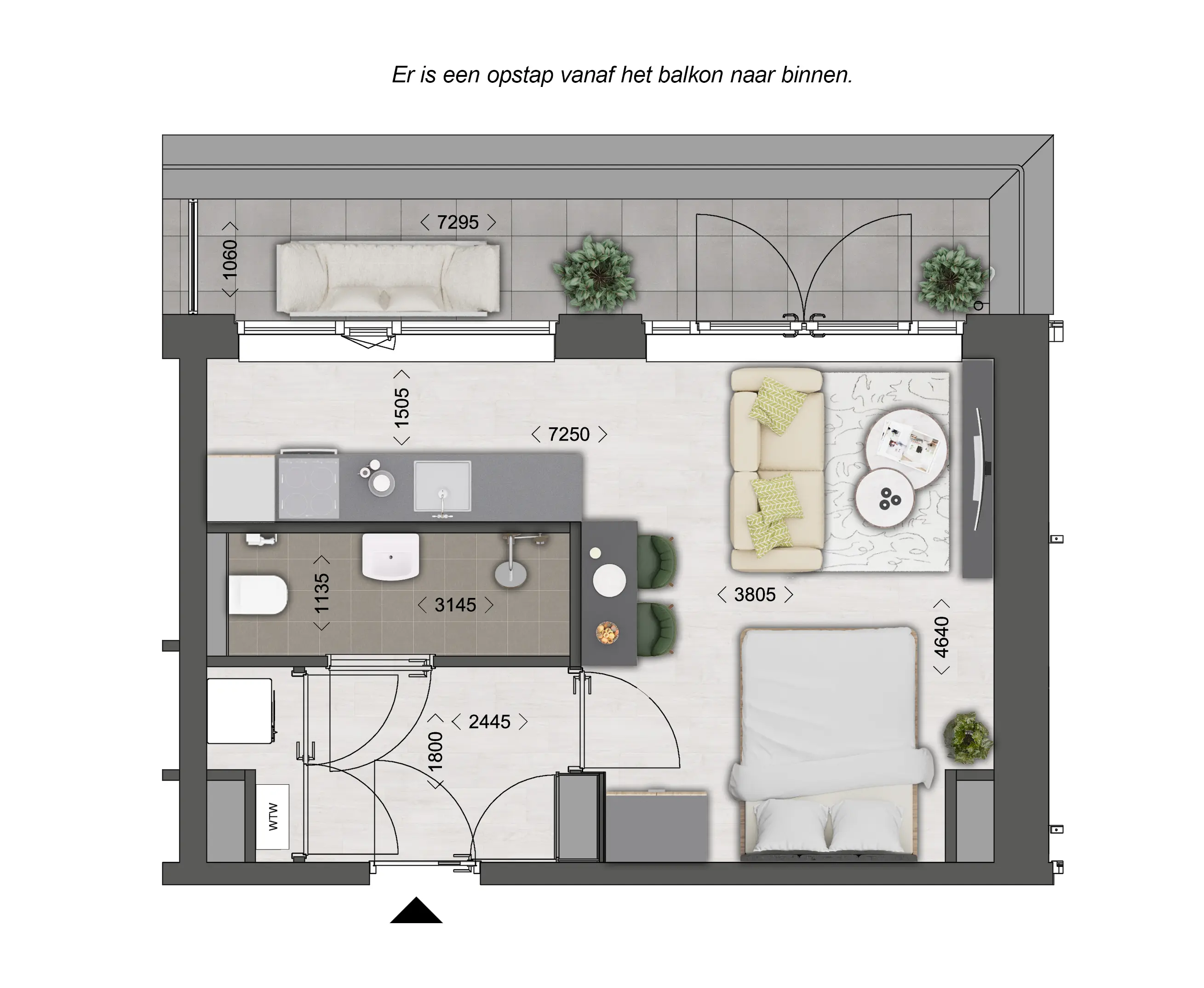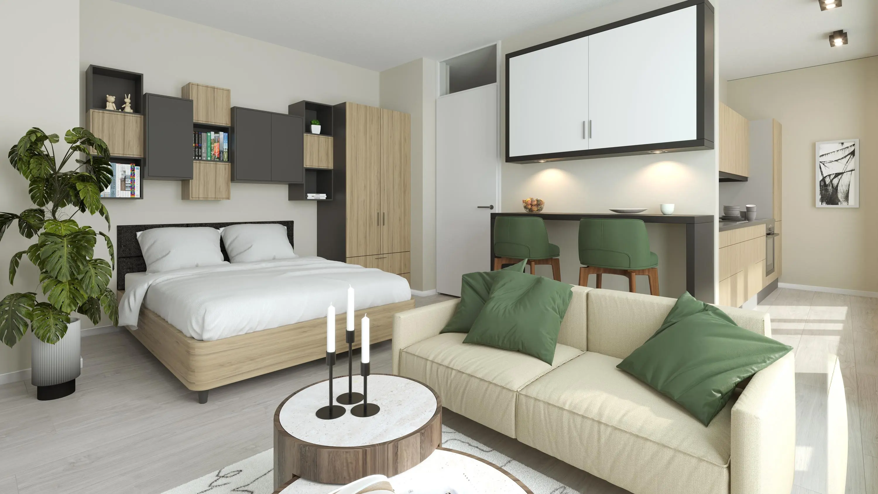 Deze studio is slim ontworpen en biedt alles wat je nodig hebt binnen handbereik. Dankzij de efficiente indeling voelt de ruimte open en licht aan, ideaal voor wie houdt van comfortabel en onderhoudsarm wonen. De woon- en slaapruimte lopen vloeiend in elkaar over en vormen samen een sfeervol geheel. De keuken is compact, maar biedt ruimte voor een complete keuken. Perfect om een snelle maaltijd te bereiden of uitgebreid te koken voor visite. Vanuit de grote ramen geniet je van veel daglicht en stap je zo het balkon op, een fijne plek om buiten te zitten met een kop koffie of een goed boek. De badkamer is eigentijds afgewerkt en voorzien van een douche, wastafel en toilet. Of je nu na een drukke dag tot rust wilt komen, wilt werken vanuit huis of juist graag de gezelligheid van de stad opzoekt, in deze studio woon je comfortabel, modern en met alles binnen handbereik.