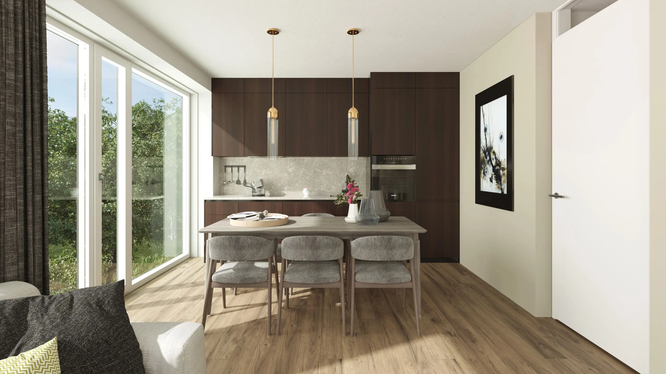 De woonkamer met open keuken vormt het hart van het appartement. Hier kun je koken, eten en ontspannen in één lichte, open ruimte. Dankzij de grote ramen valt veel daglicht binnen en geniet je van een ruimtelijk gevoel. Via de deur stap je het balkon op, een heerlijke plek om buiten te zitten, te borrelen of gewoon even te genieten van de frisse lucht.