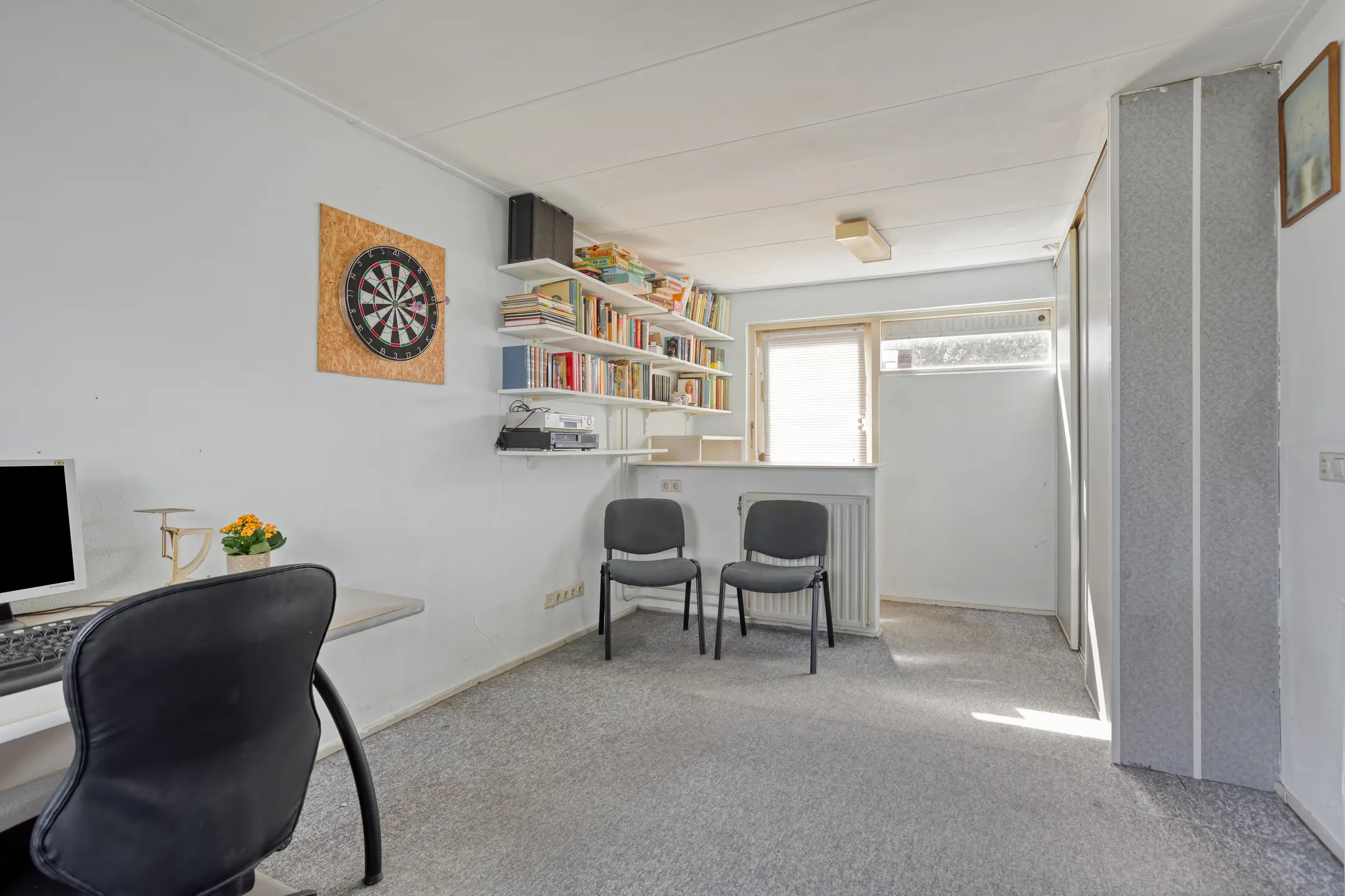 De woonkamer is zo’n ruimte waar je op een luie zondagmiddag neerploft op de bank, een goed boek openslaat en even alles om je heen vergeet. De uitbouw is nu ingericht als werkkamer, maar is ook levensloopbestendig als slaapkamer te gebruiken.