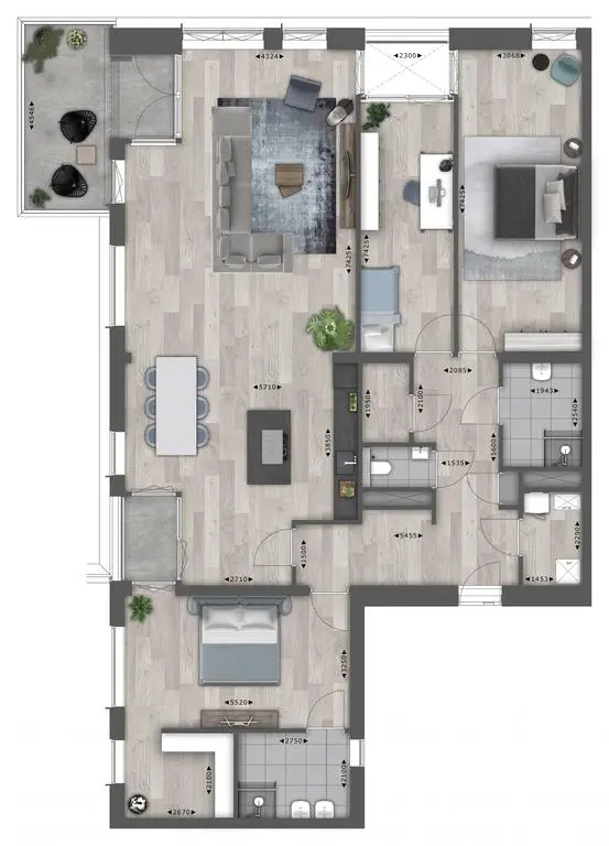 Upon entering, the spacious layout and abundance of natural light immediately stand out. The living room is the heart of the home: bright, open, and featuring two balconies on different sides – perfect for enjoying the outdoors at any time of day. The luxury kitchen with a cooking island is equipped with high-end built-in appliances and offers plenty of workspace and storage. This is not just a place to cook – it's a place to live.