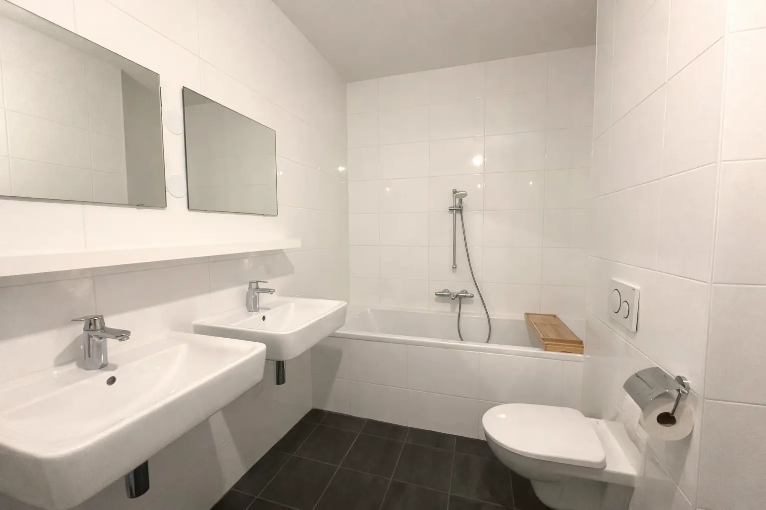 Entrance hall with access to all rooms. Technical room / laundry room with connections for a washing machine and dryer. Two bedrooms. Bathroom with shower, bathtub, double washbasin, and second toilet. Living room with sliding doors to the south-east facing balcony. Open kitchen equipped with built-in appliances: gas hob, extractor hood, combination oven, refrigerator, freezer, and dishwasher.