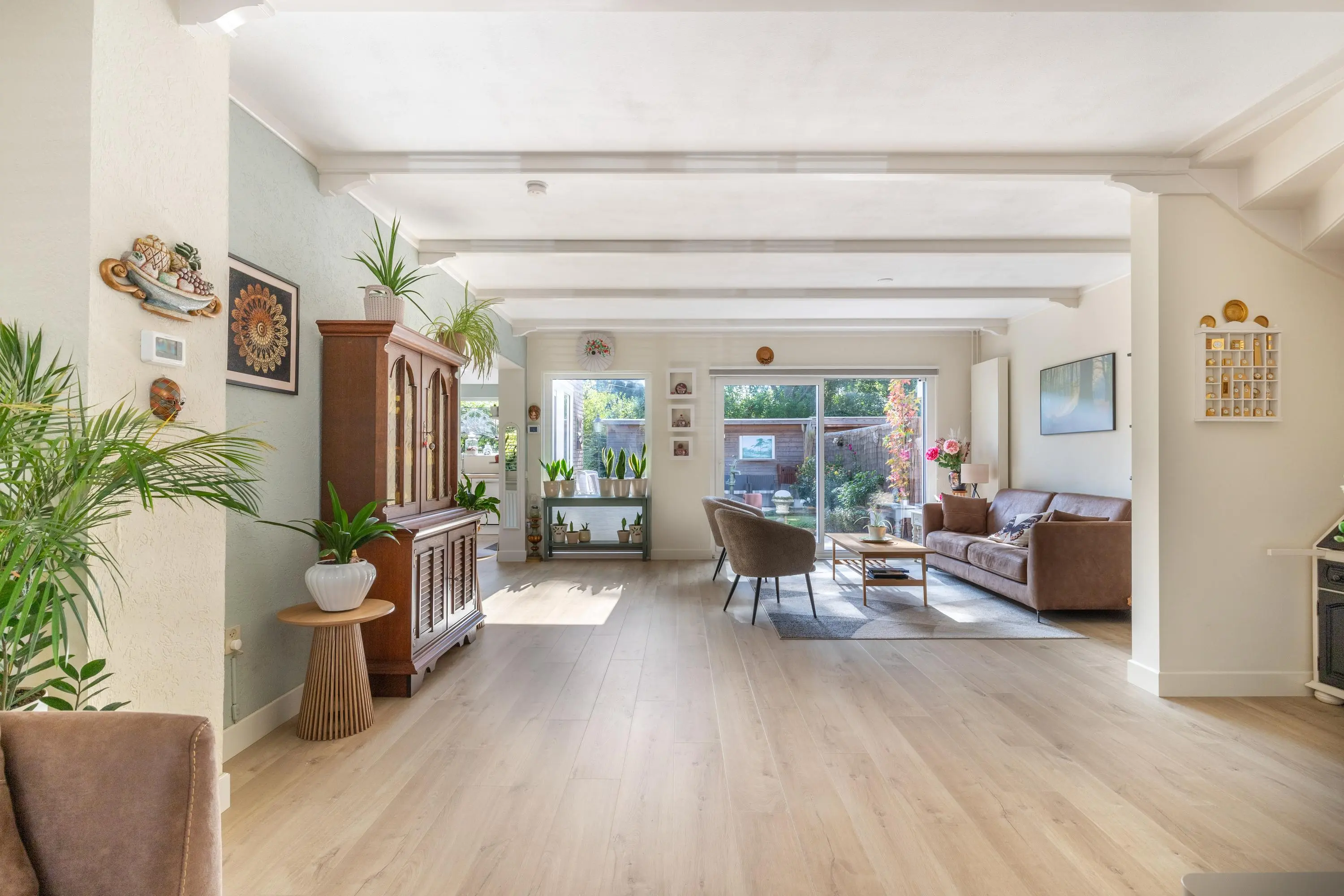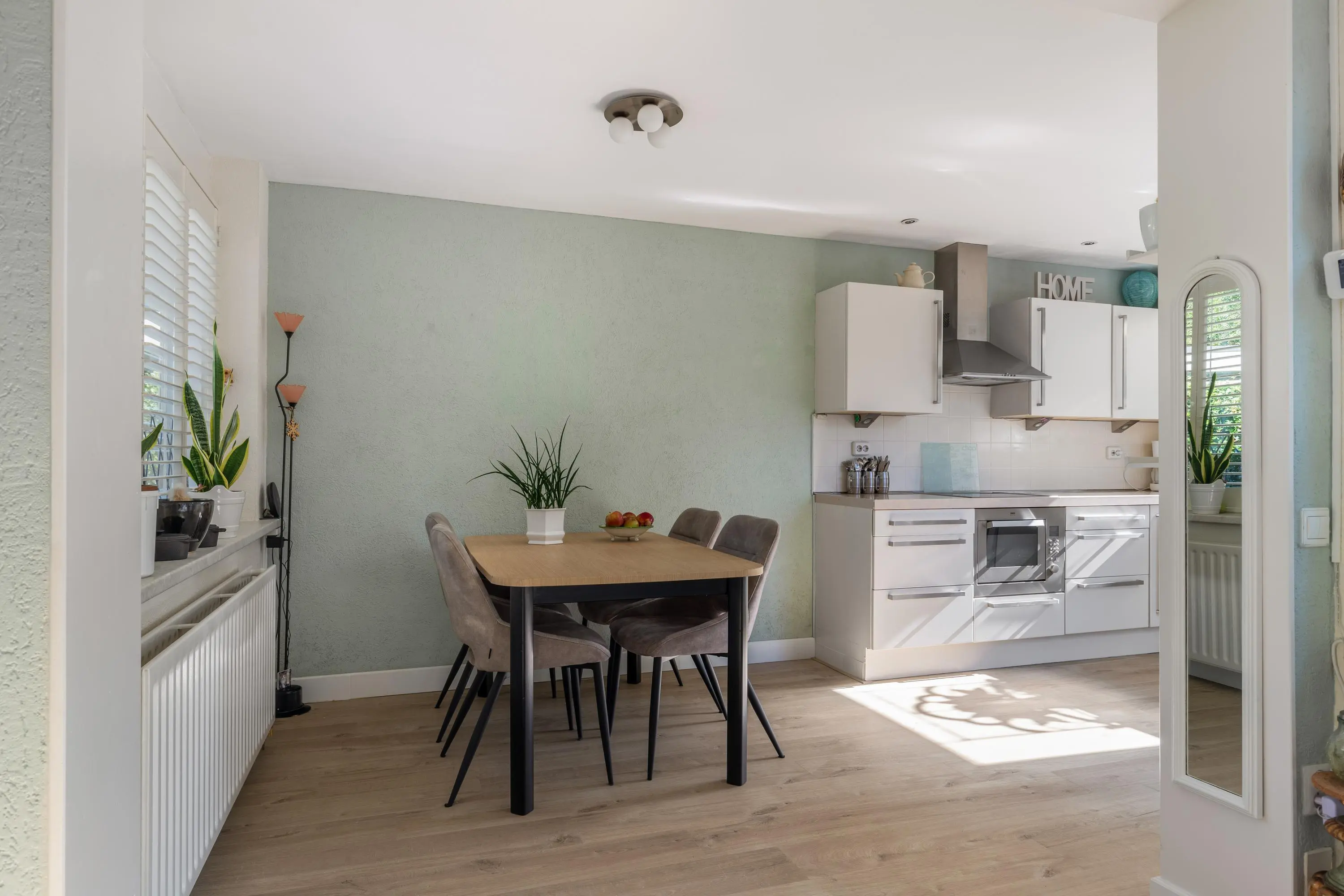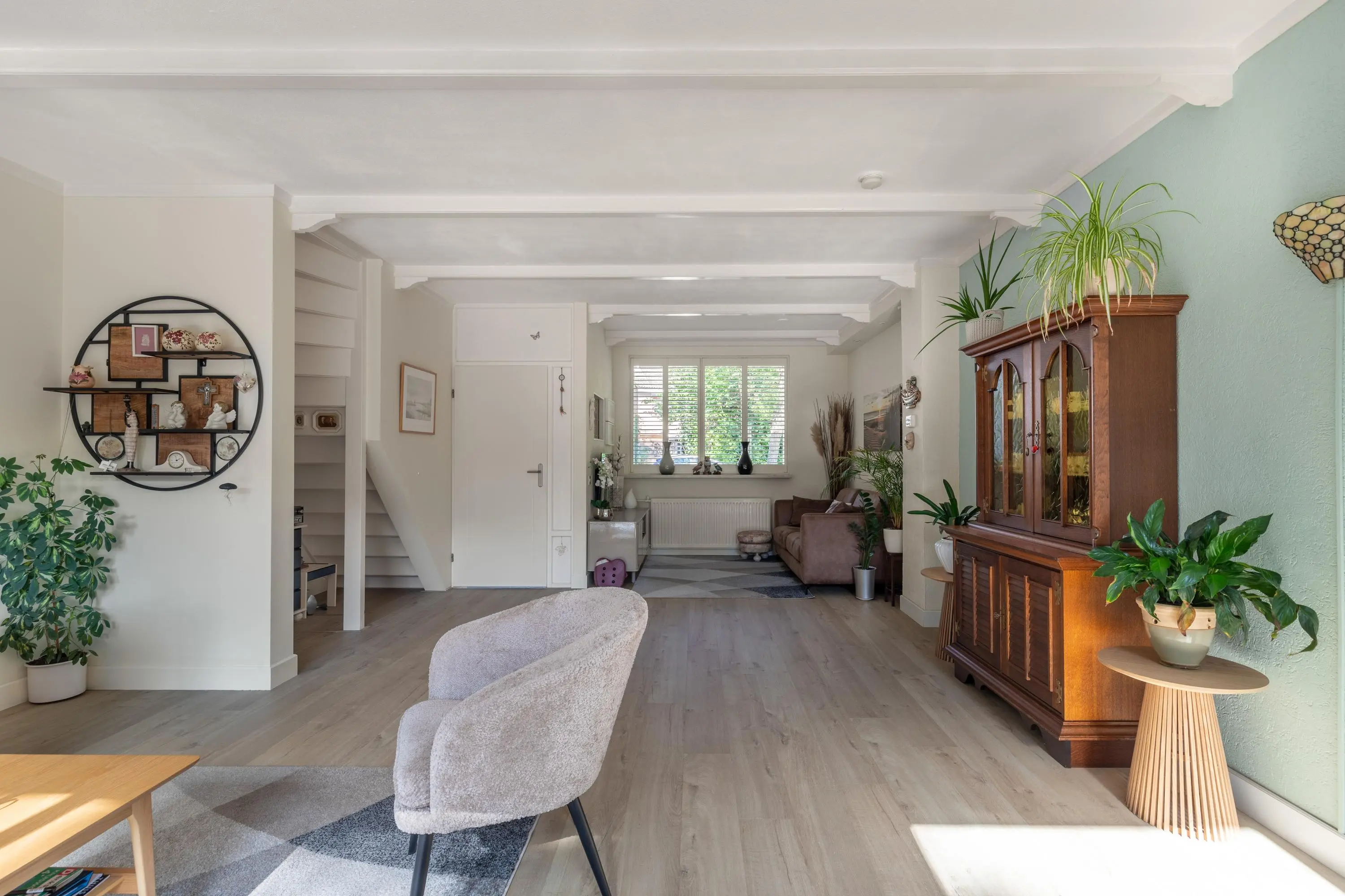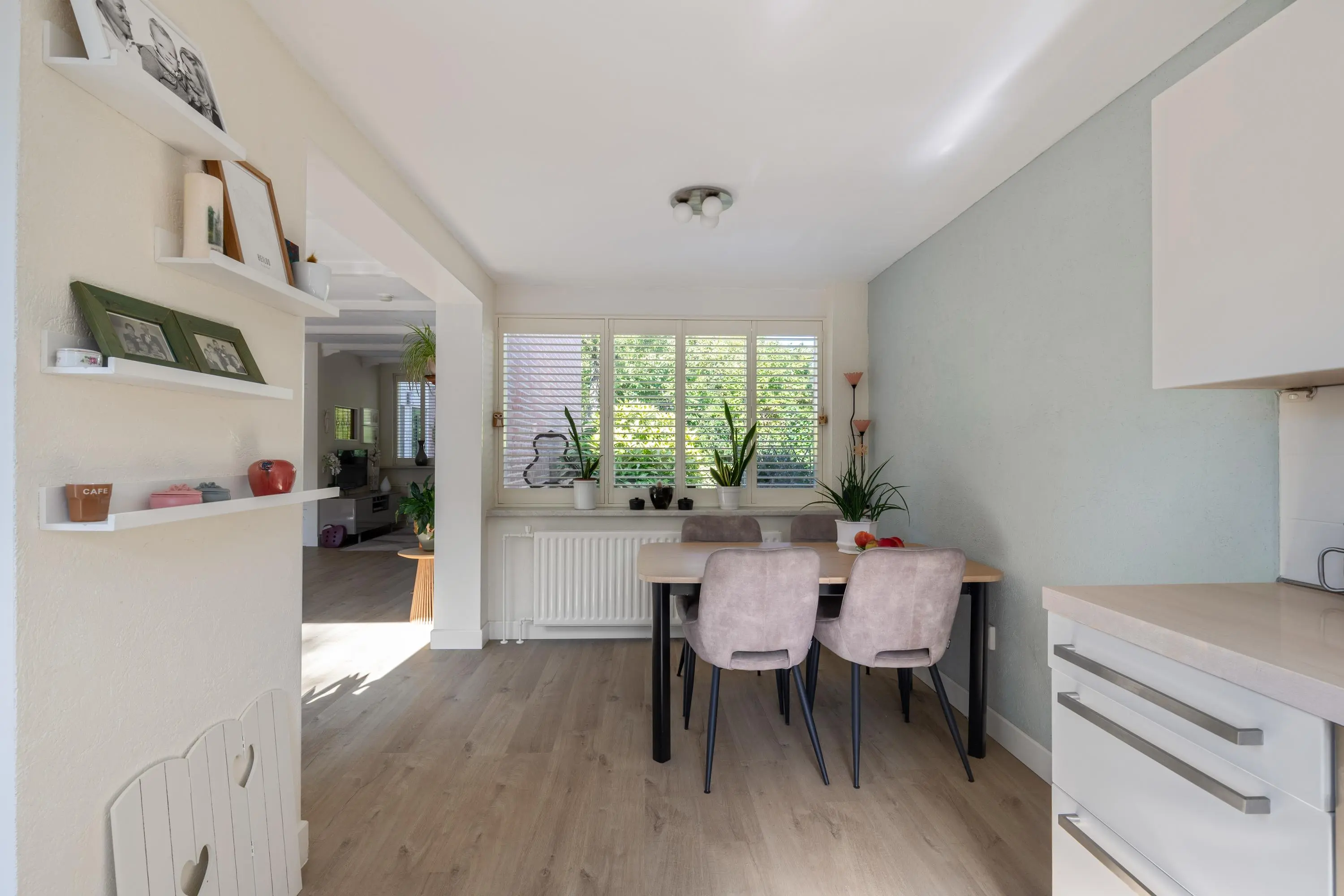 Bij binnenkomst tref je de hal met meterkast, toilet en de praktische berging met wasmachineopstelling. De royale woonkamer verrast door het vele daglicht, dankzij de ramen in de zijgevel vanwege de gunstige hoekligging en de schuifpui in de achtergevel (geplaatst in april dit jaar). De woonkamer loopt soepel over in de uitgebouwde keuken, die niet alleen veel ruimte biedt maar ook praktisch is ingericht. Hier kun je gemakkelijk met meerdere personen koken of gezellig met het gezin aan de eettafel zitten. Via de schuifpui bereik je de diepe achtertuin met ligging op het zuiden, waardoor je bijna de hele dag zon hebt. Achter in de tuin staat een aparte berging met genoeg ruimte voor fietsen of tuingereedschap. Parkeren doe je eenvoudig op de openbare weg.