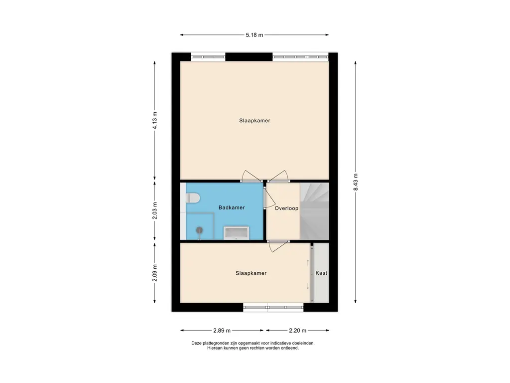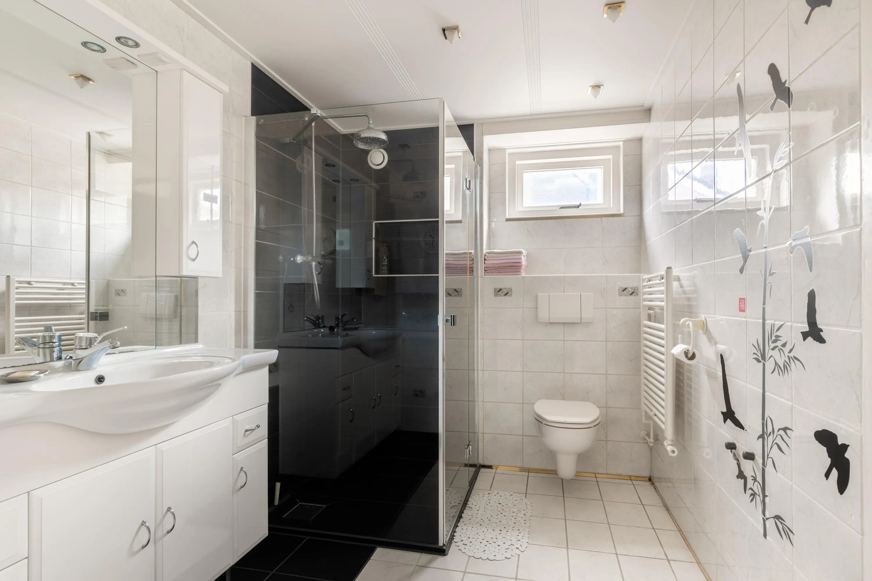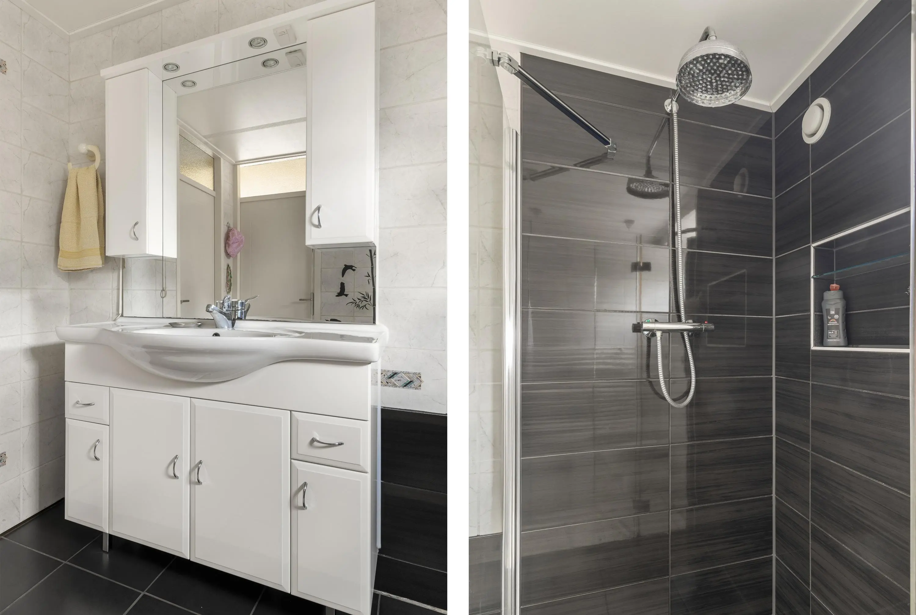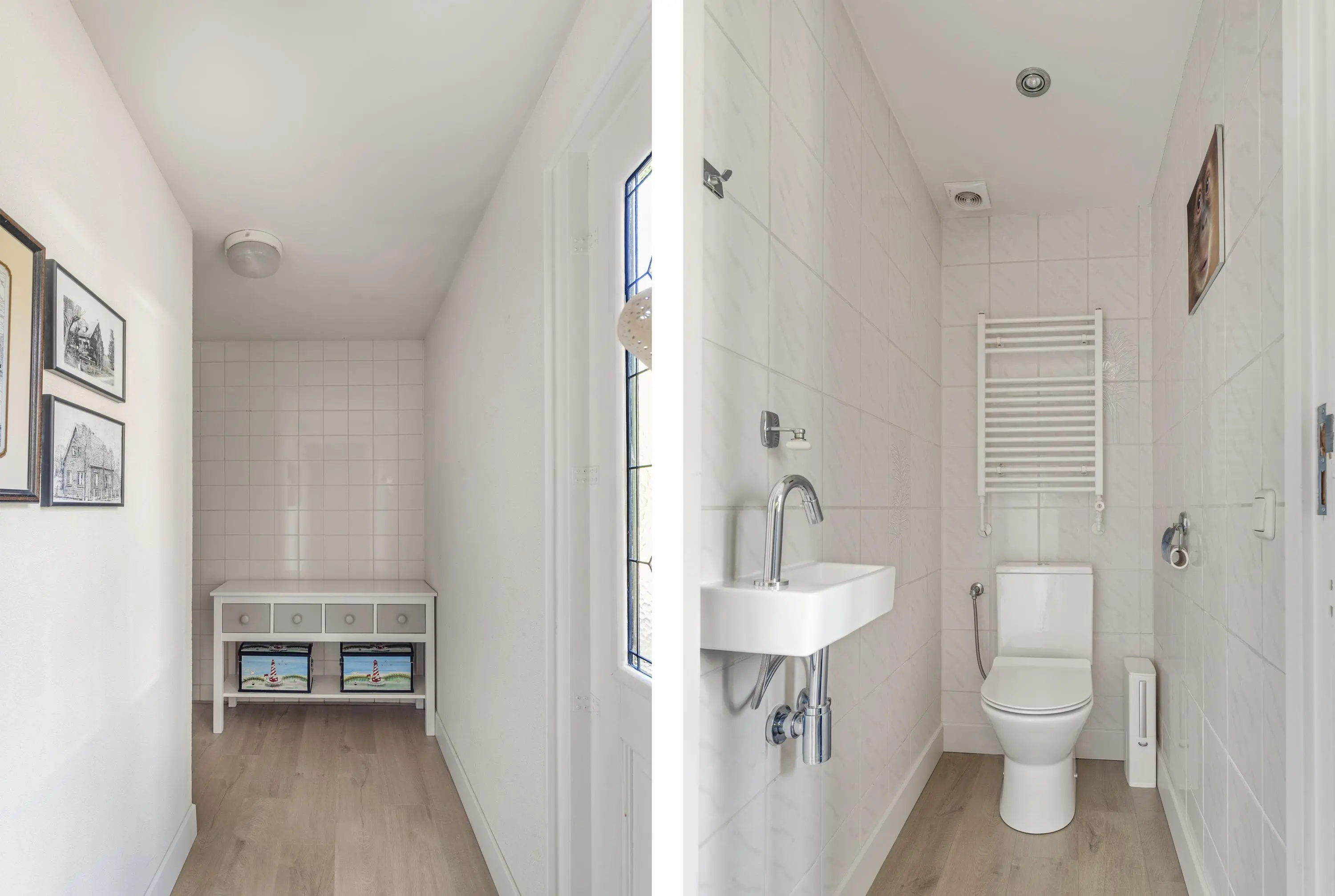 De eerste etage is momenteel ingedeeld met twee slaapkamers en een vergrote badkamer. Behoefte aan een derde slaapkamer? De oorspronkelijke indeling kan eenvoudig in ere worden hersteld. De keurige badkamer beschikt over een toilet, douche en badkamermeubel.