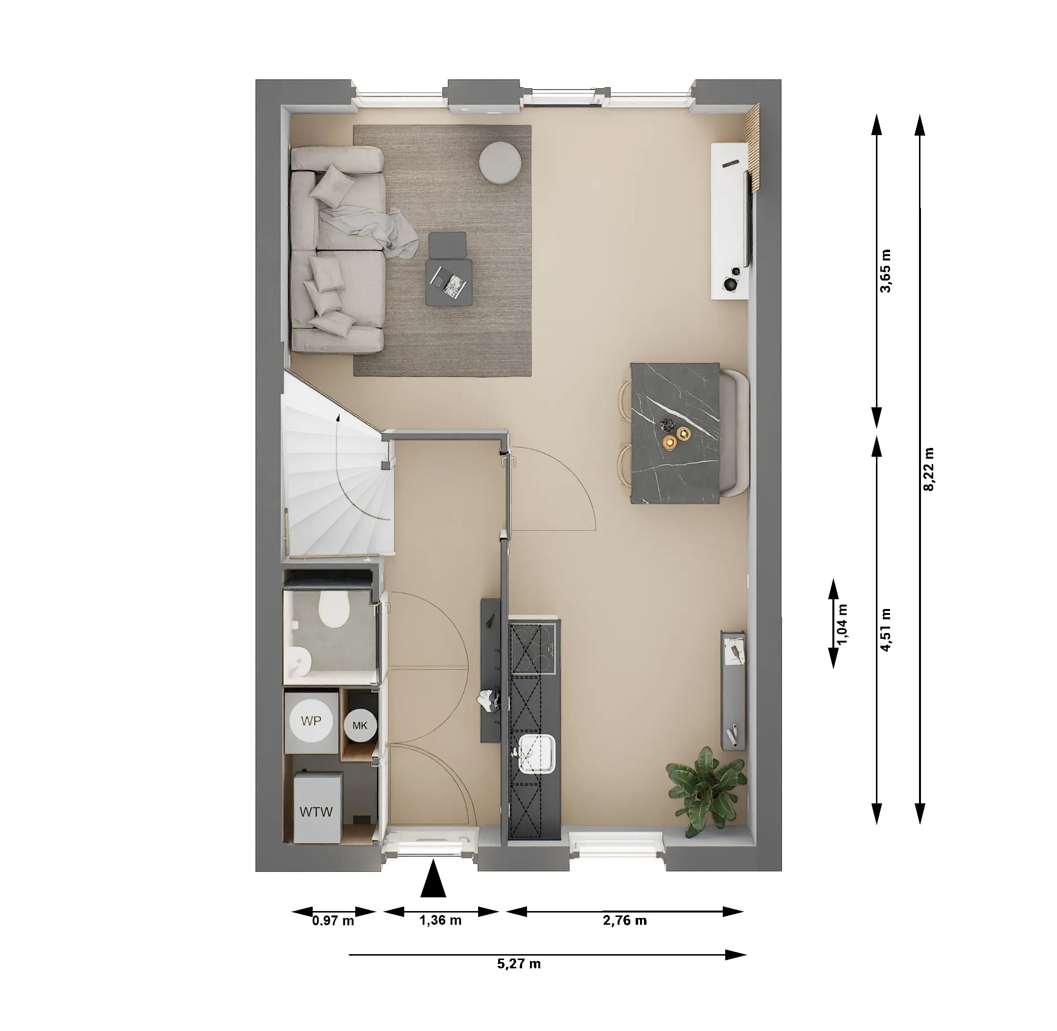Op de begane grond bevindt zich de leefruimte met open keuken. De eerste verdieping biedt plaats aan drie slaapkamers en de badkamer. De zolder biedt extra ruimte die geschikt is als werk-, hobby- of bergruimte. Deze ruimte is ook ideaal om in te richten als vierde slaapkamer.