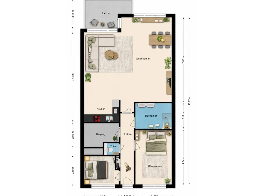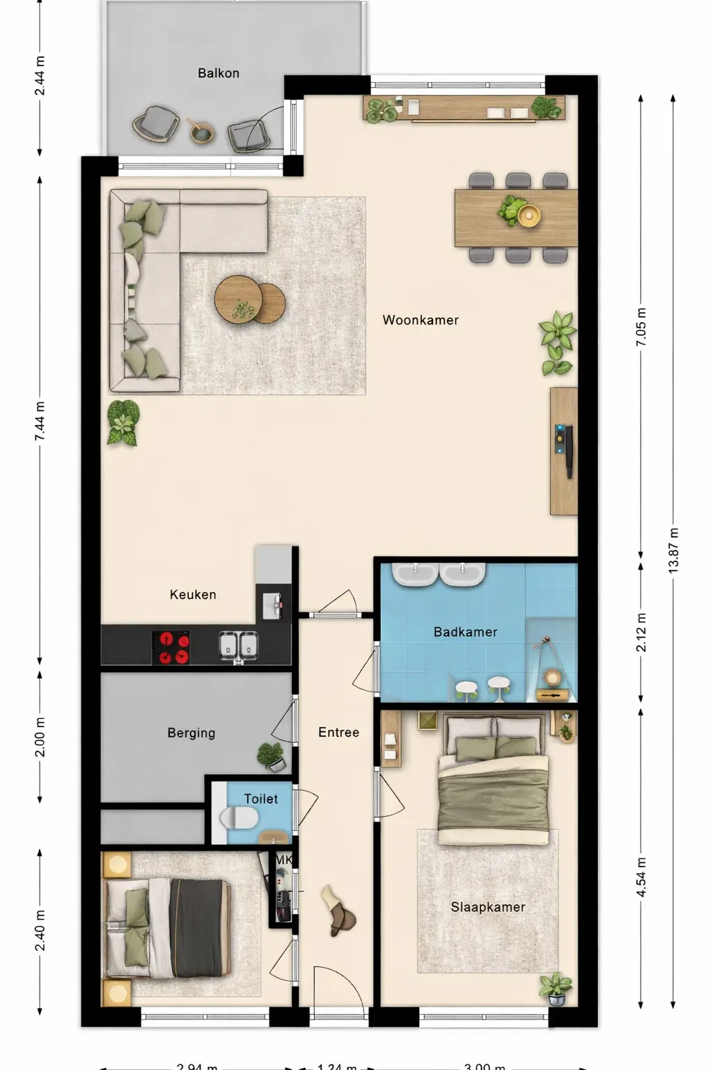 Het appartement beschikt over twee slaapkamers, beide van goed formaat. De badkamer is praktisch ingedeeld en uitgerust met een dubbele wastafel en een douche. Het toilet is apart en deze is vanuit de hal bereikbaar. Daarnaast beschikt de woning ook over een aparte bergruimte in de woning met de aansluitingen voor de wasmachine en droger. Het appartement beschikt daarnaast over een berging voor de fiets en een eigen parkeerplaats op het afgesloten parkeerdek.