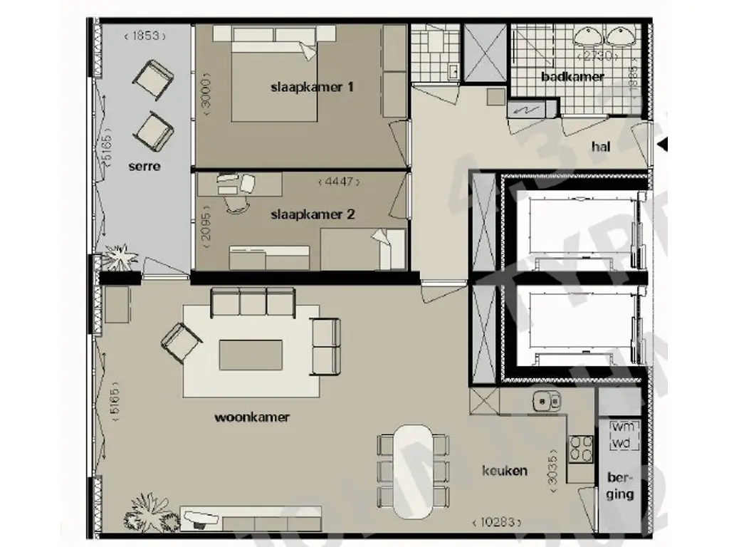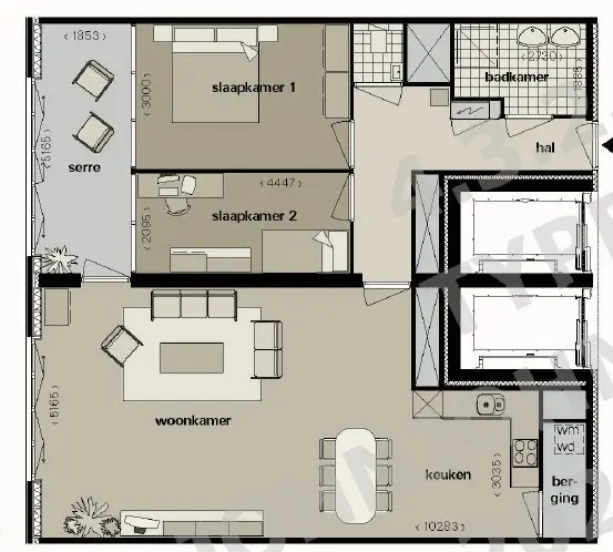 - Twee slaapkamers;