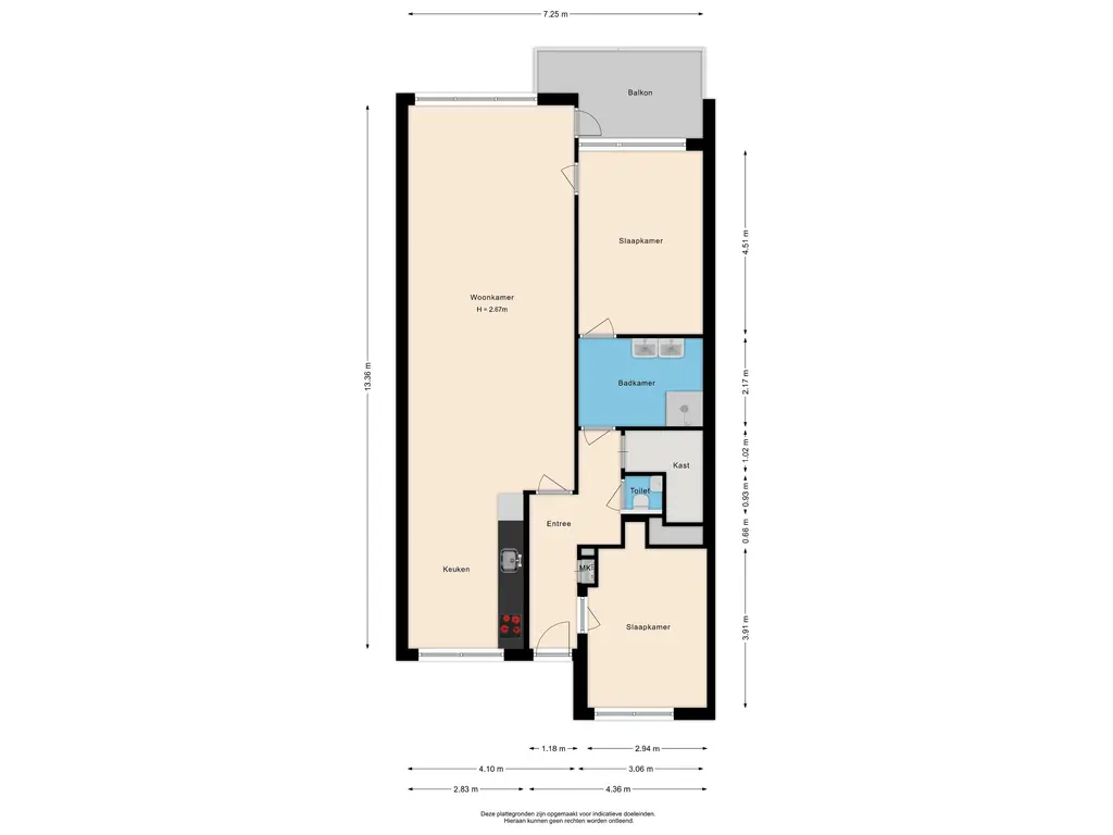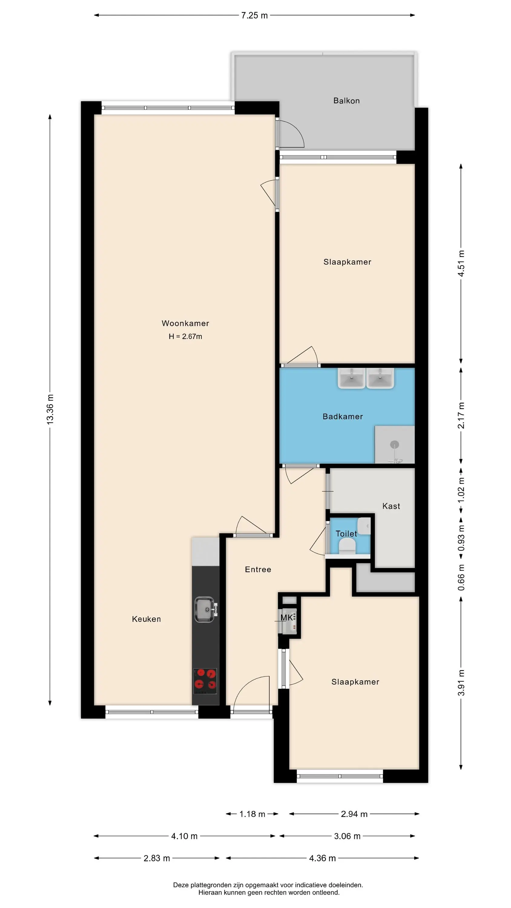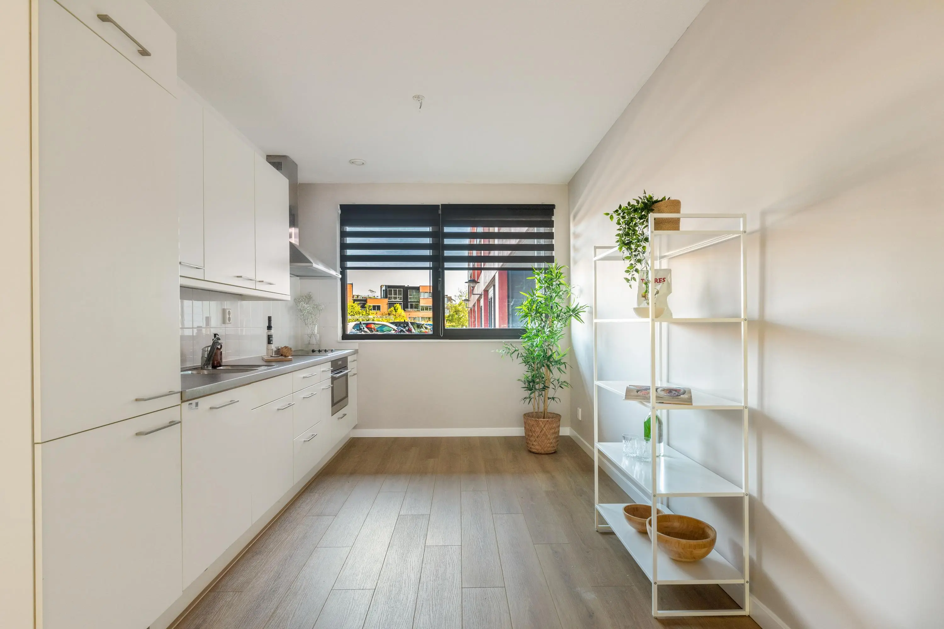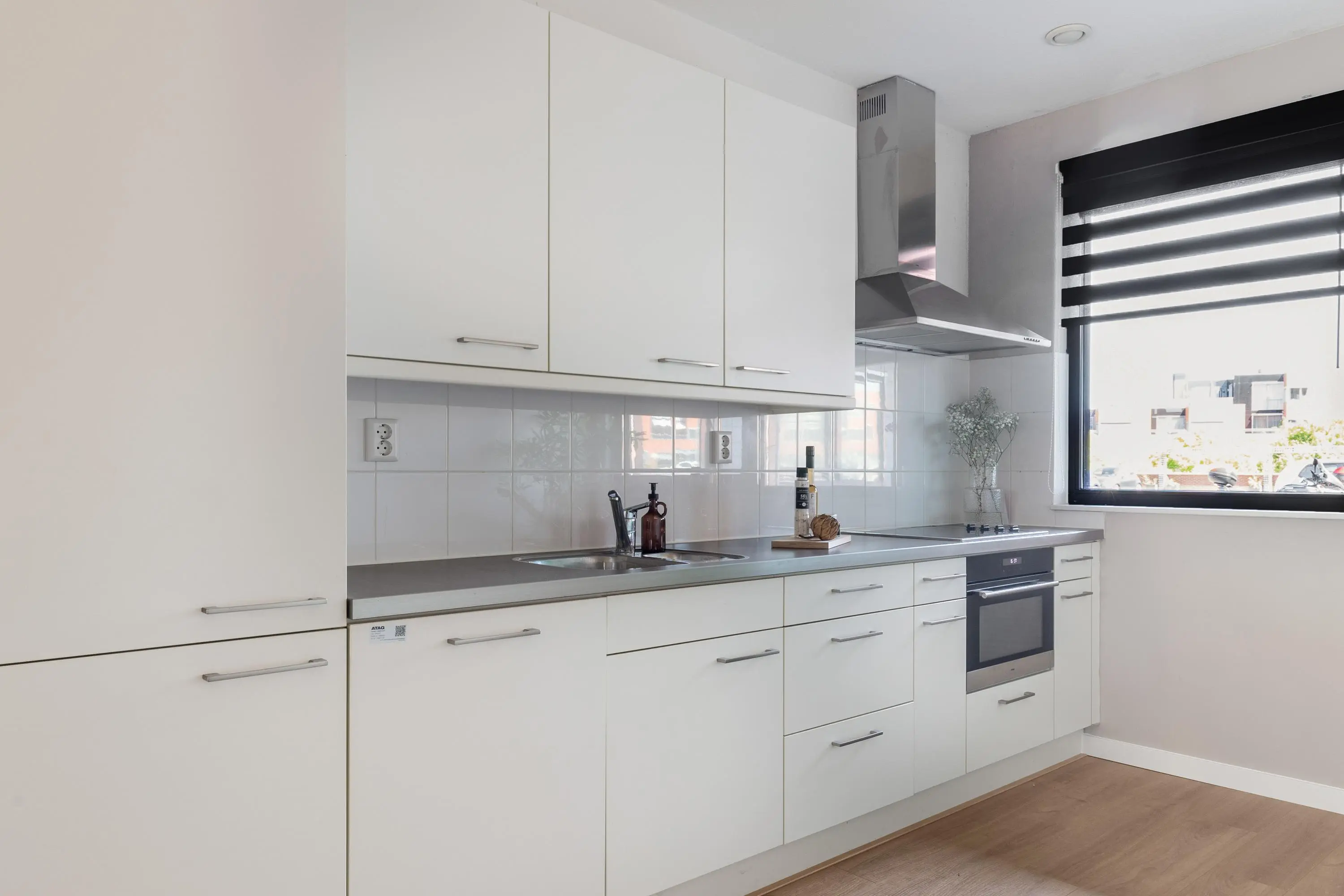 De hal geeft toegang tot alle vertrekken van de woning. De woonkamer is opvallend licht dankzij de raampartijen aan beide zijden – een heerlijke plek om te ontspannen of te dineren. Vanuit de woonkamer heb je toegang tot het balkon, waar je van de zon kunt genieten. De open keuken is voorzien van diverse inbouwapparatuur.