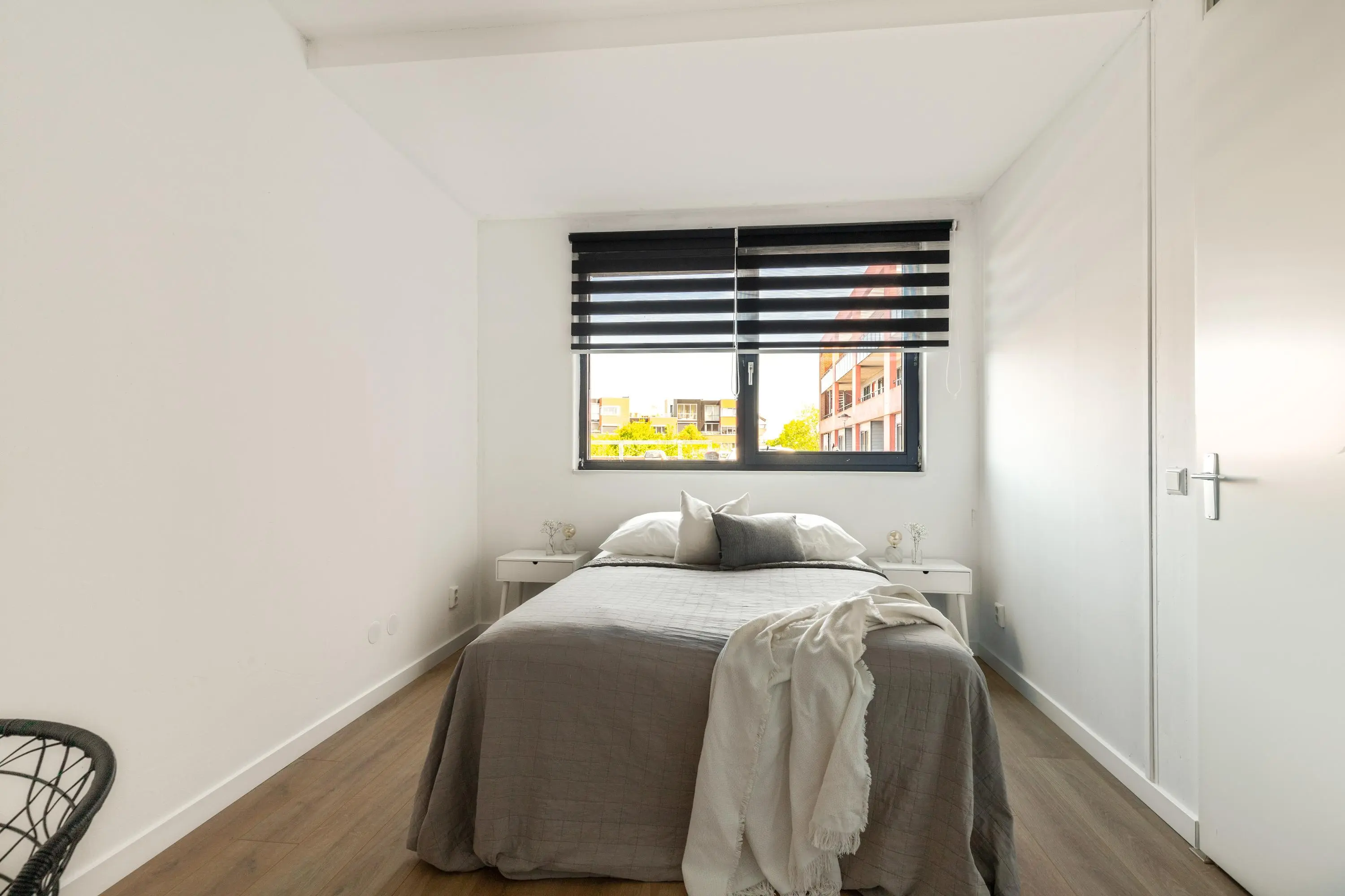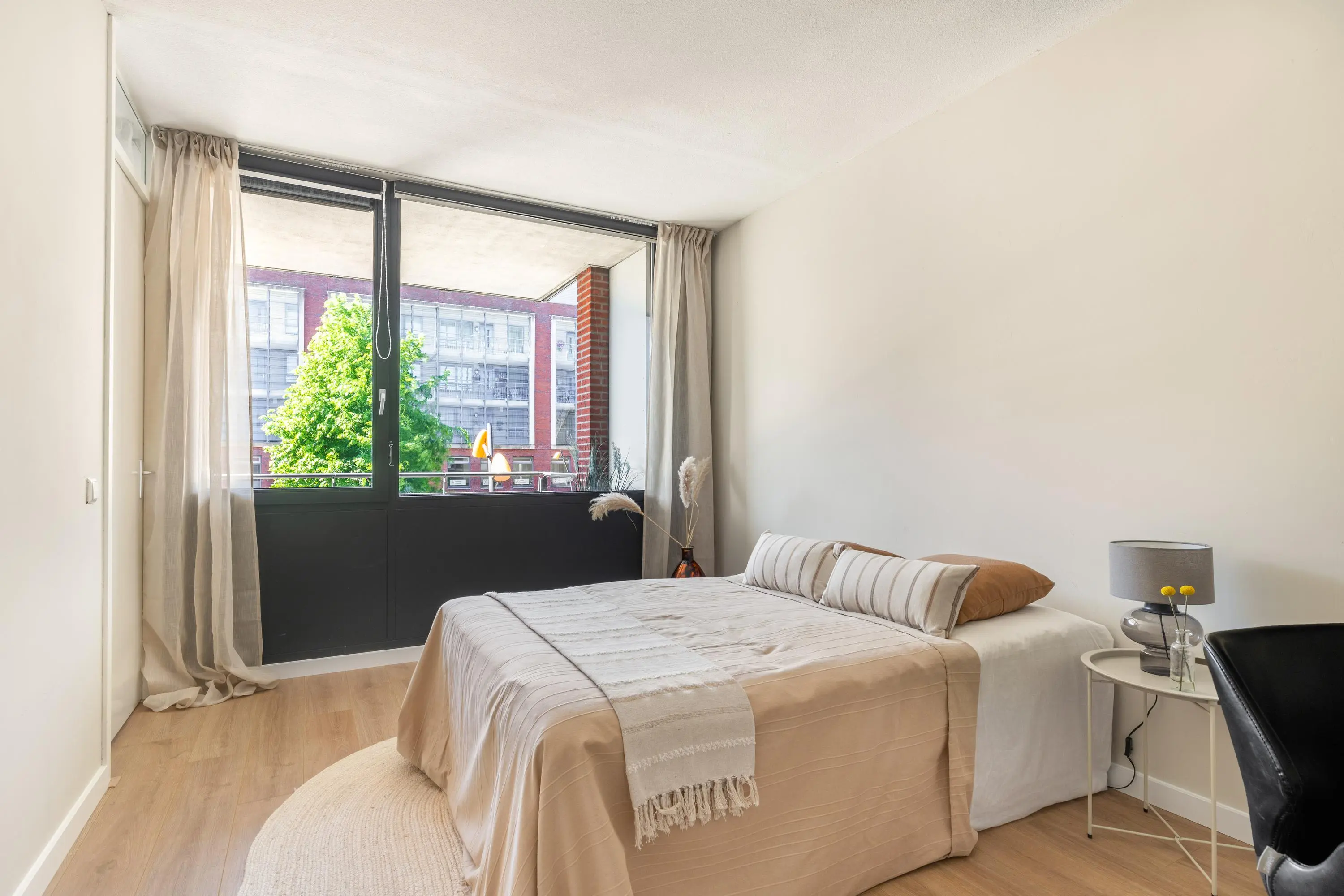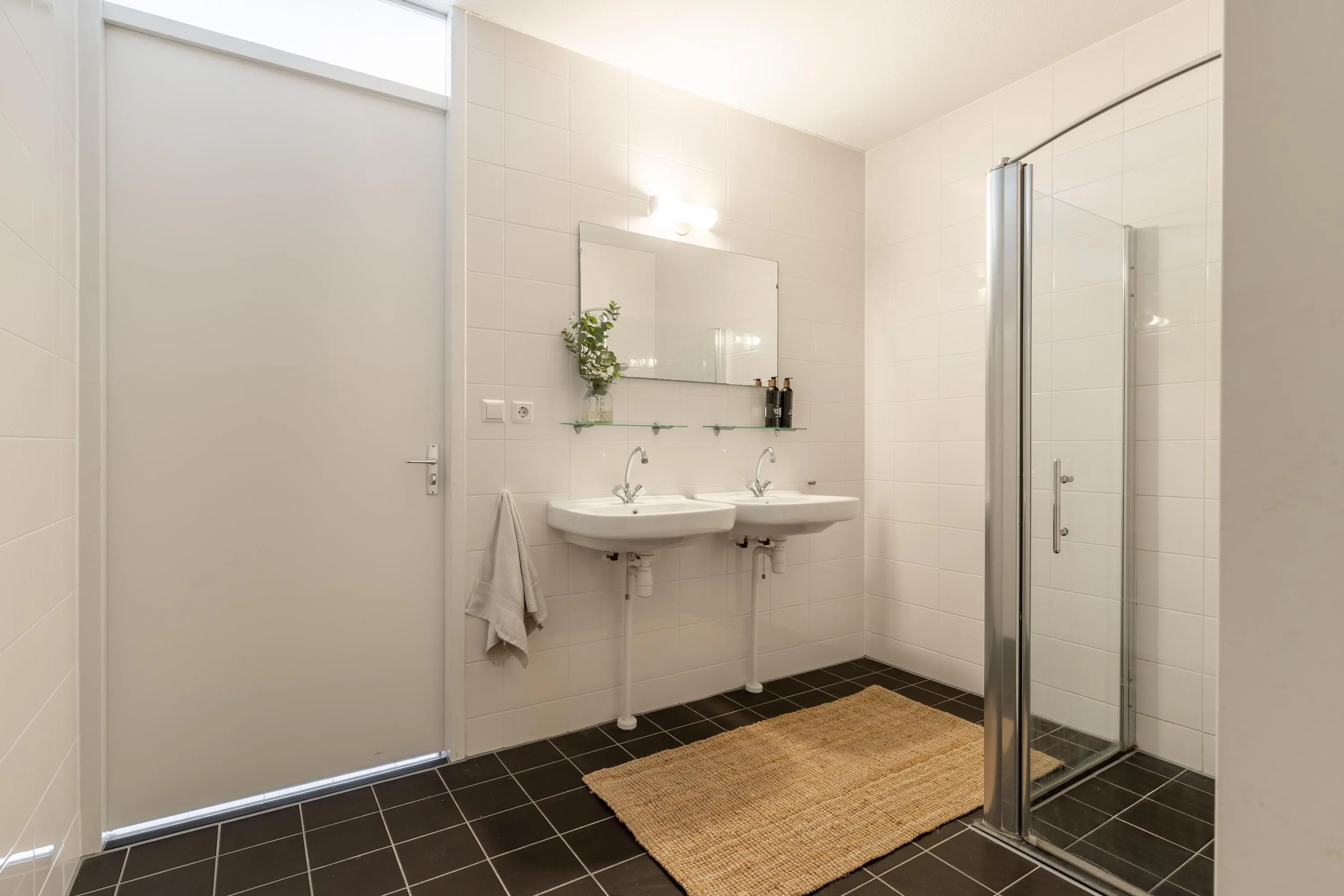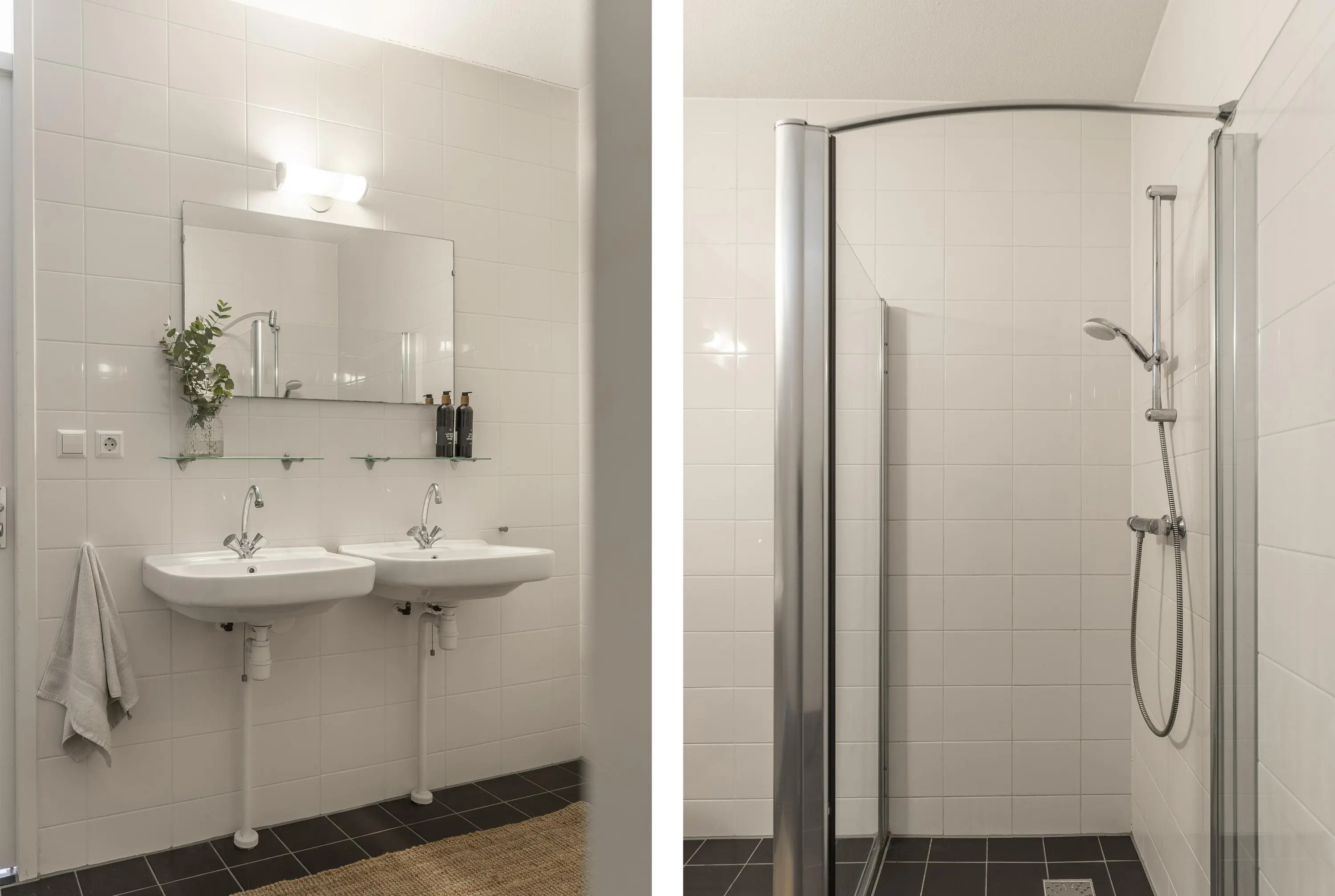 Het appartement beschikt over twee slaapkamers, waarvan één bereikbaar is via zowel de woonkamer als de badkamer. De ruime badkamer is voorzien van een dubbele wastafel, radiator en douche. Daarnaast is er een separaat toilet aanwezig.