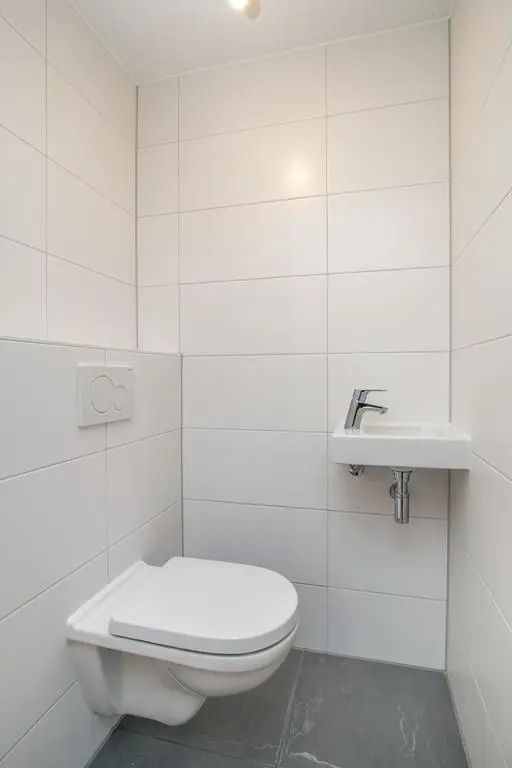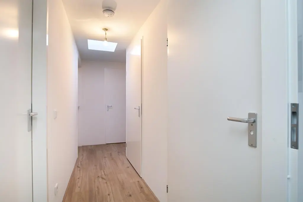 The apartment has a private staircase entrance. From the hallway, you enter the bright living room with large windows overlooking Brandsteeg. On the right side, you’ll find the modern open kitchen equipped with a fridge-freezer combination, hob, extractor hood, and dishwasher.