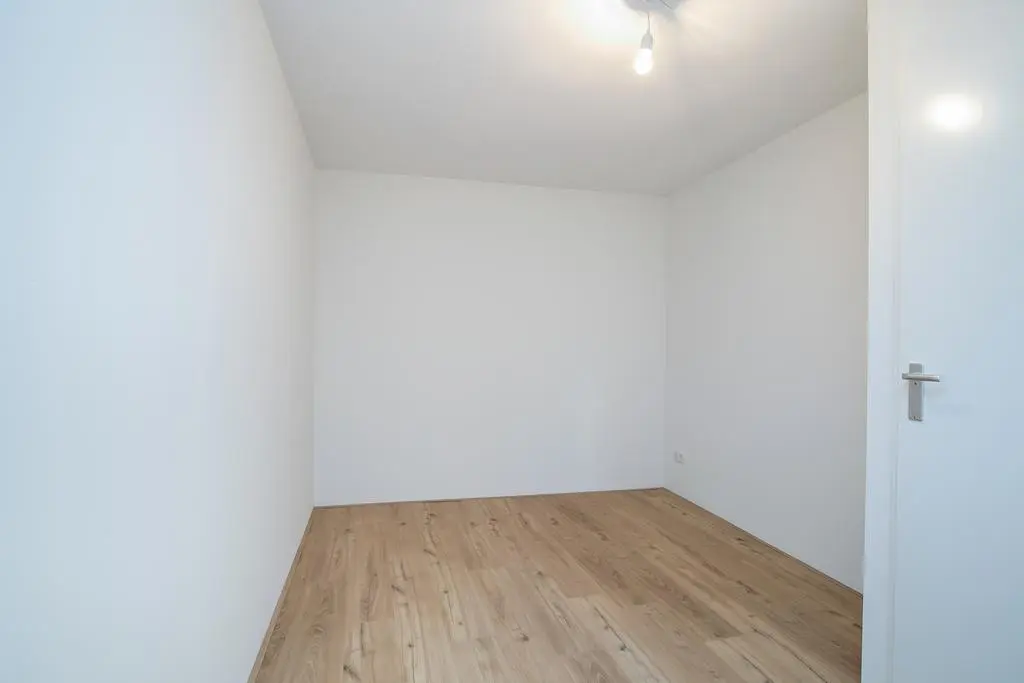 From the kitchen, you enter the hall, which provides access to two bedrooms on the left side. On the right side are the toilet and a storage room with washer and dryer connections. The spacious bathroom includes a walk-in shower, towel radiator, and double washbasin.