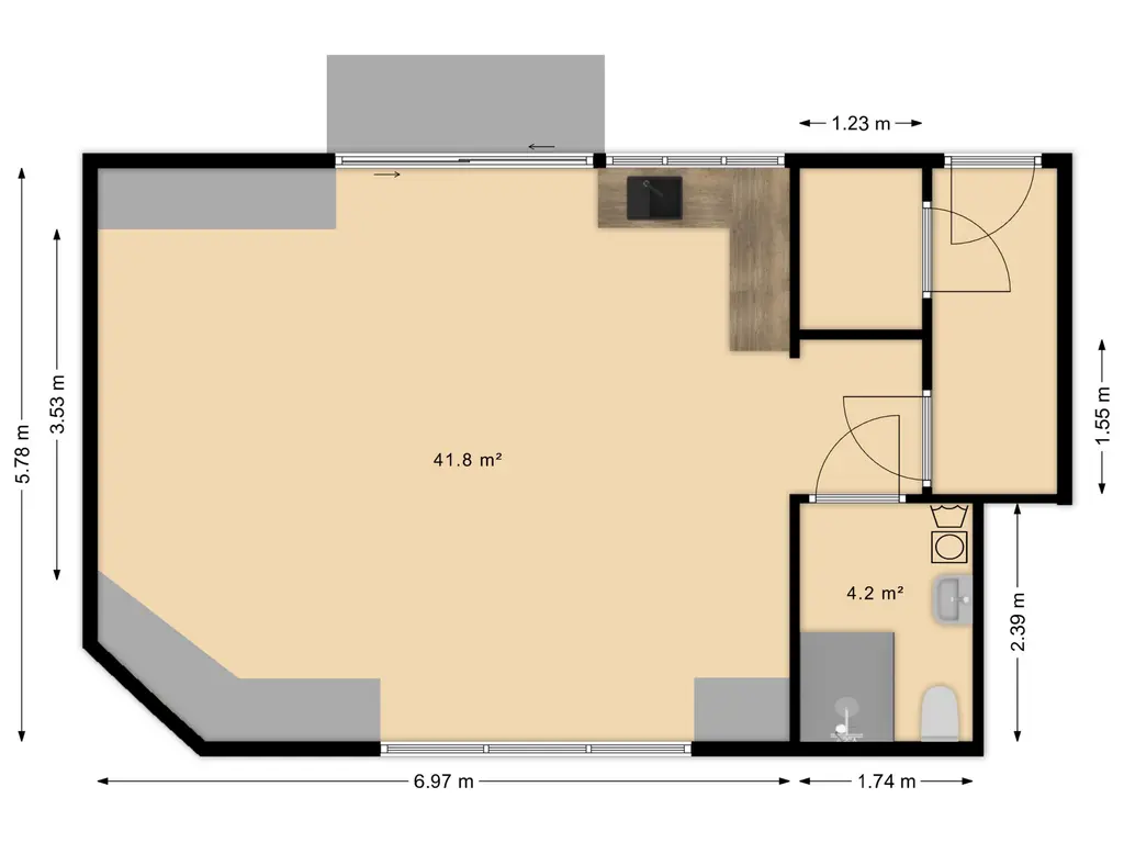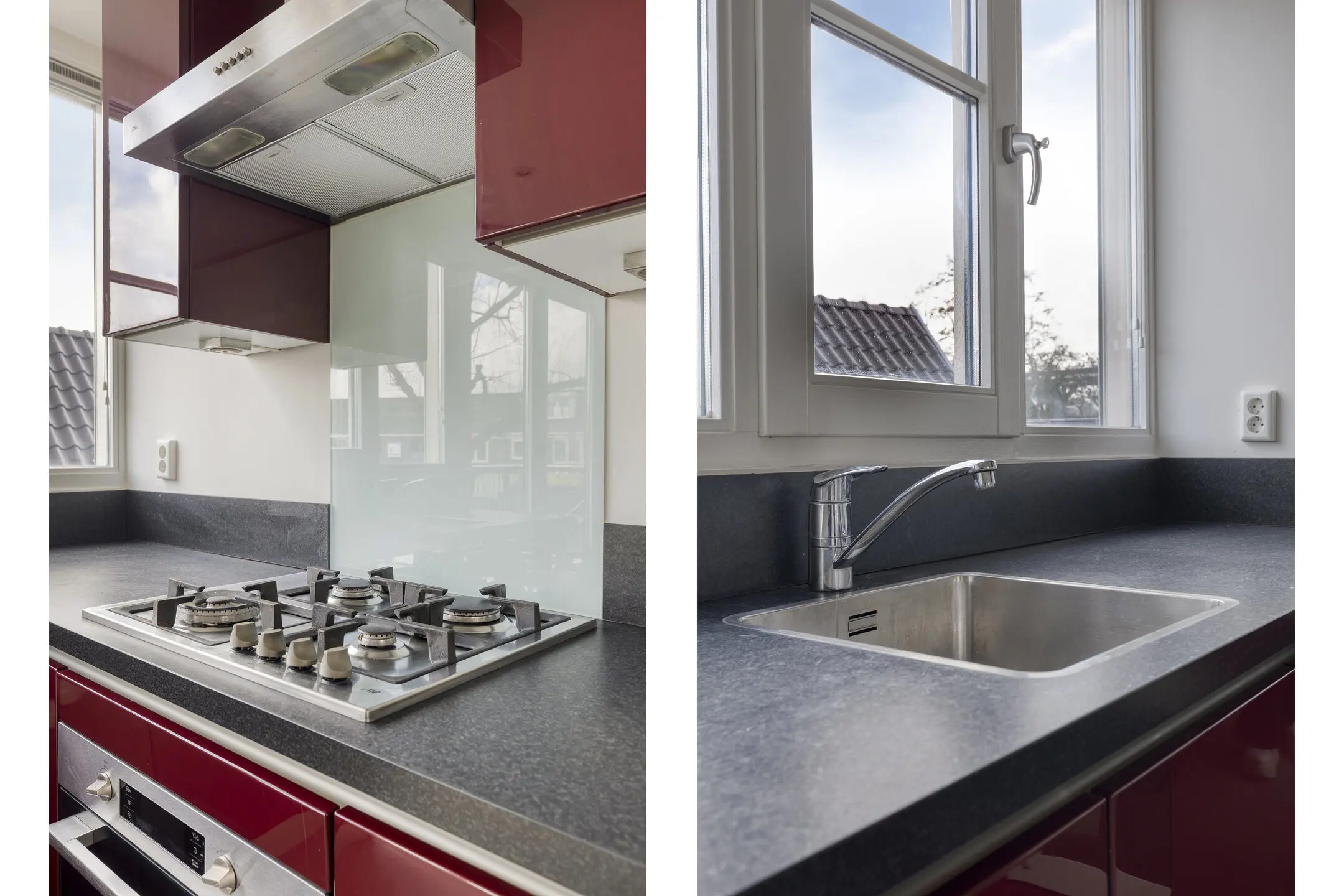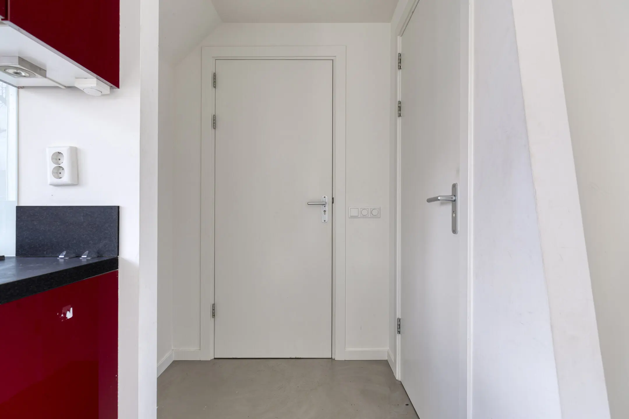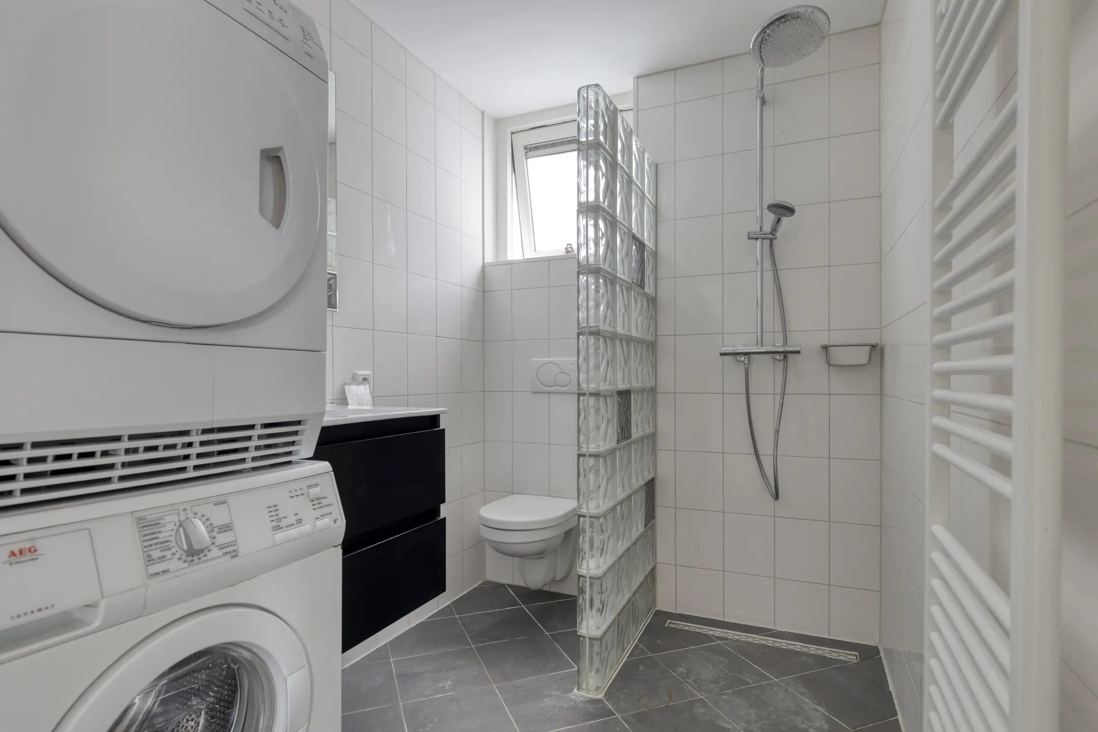 Het bovengelegen zelfstandige bedrijfsappartement (41,8 m²) beschikt over eigen voorzieningen, waaronder een keuken en een badkamer met wasmachine en droger. Separate aansluitingen voor gas, water en elektra zijn aanwezig.