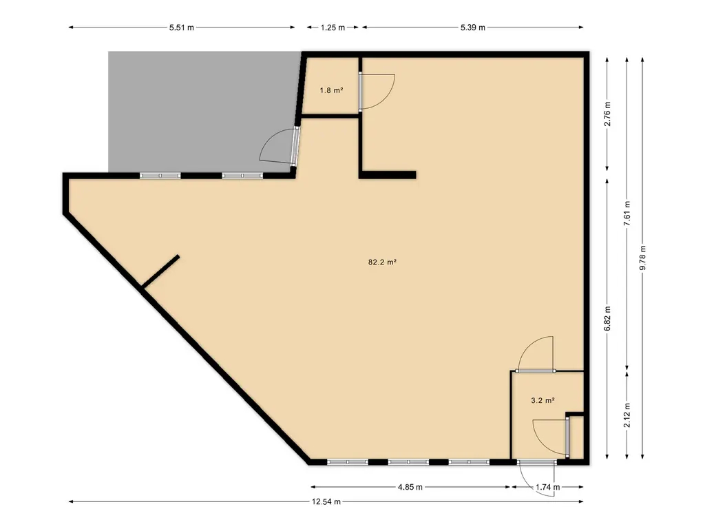 De begane grond (82,2 m² BVO) betreft een open, casco ruimte met een hoofdentree aan de Burgemeester Mooijstraat en een secundaire entree aan de Dorpsstraat. De ruimte is vrij indeelbaar naar wens. Aan de achterzijde is een overkapt buitenterrein van circa 13 m² aanwezig.