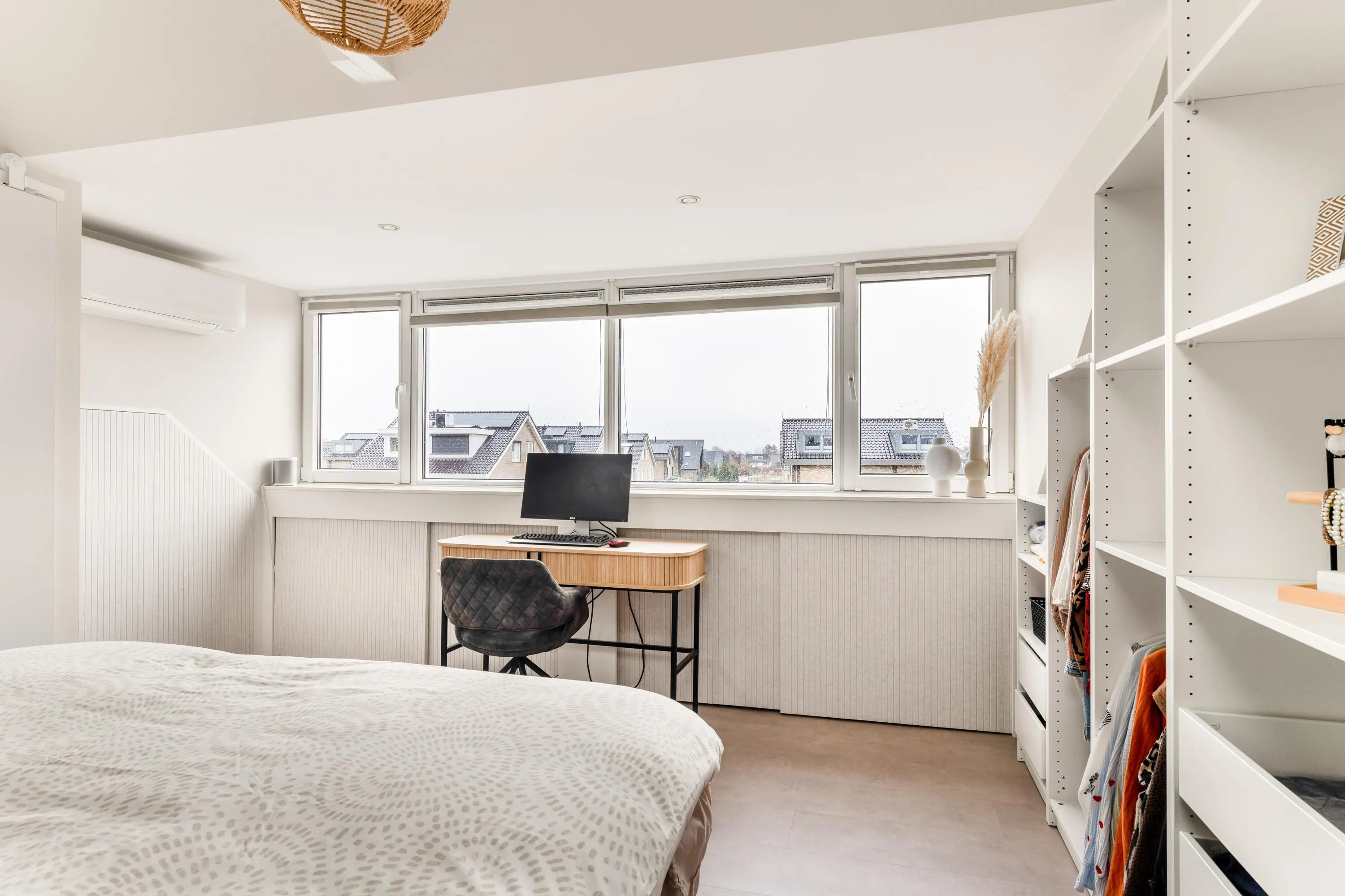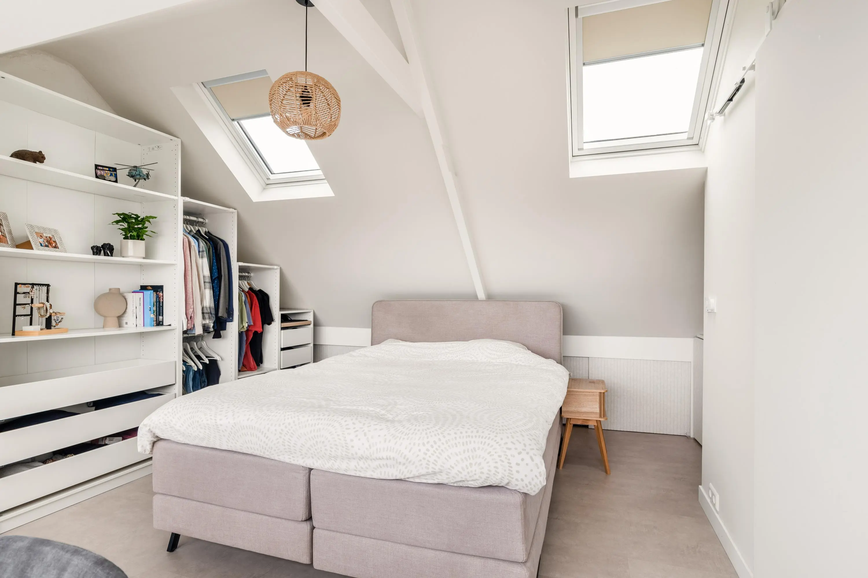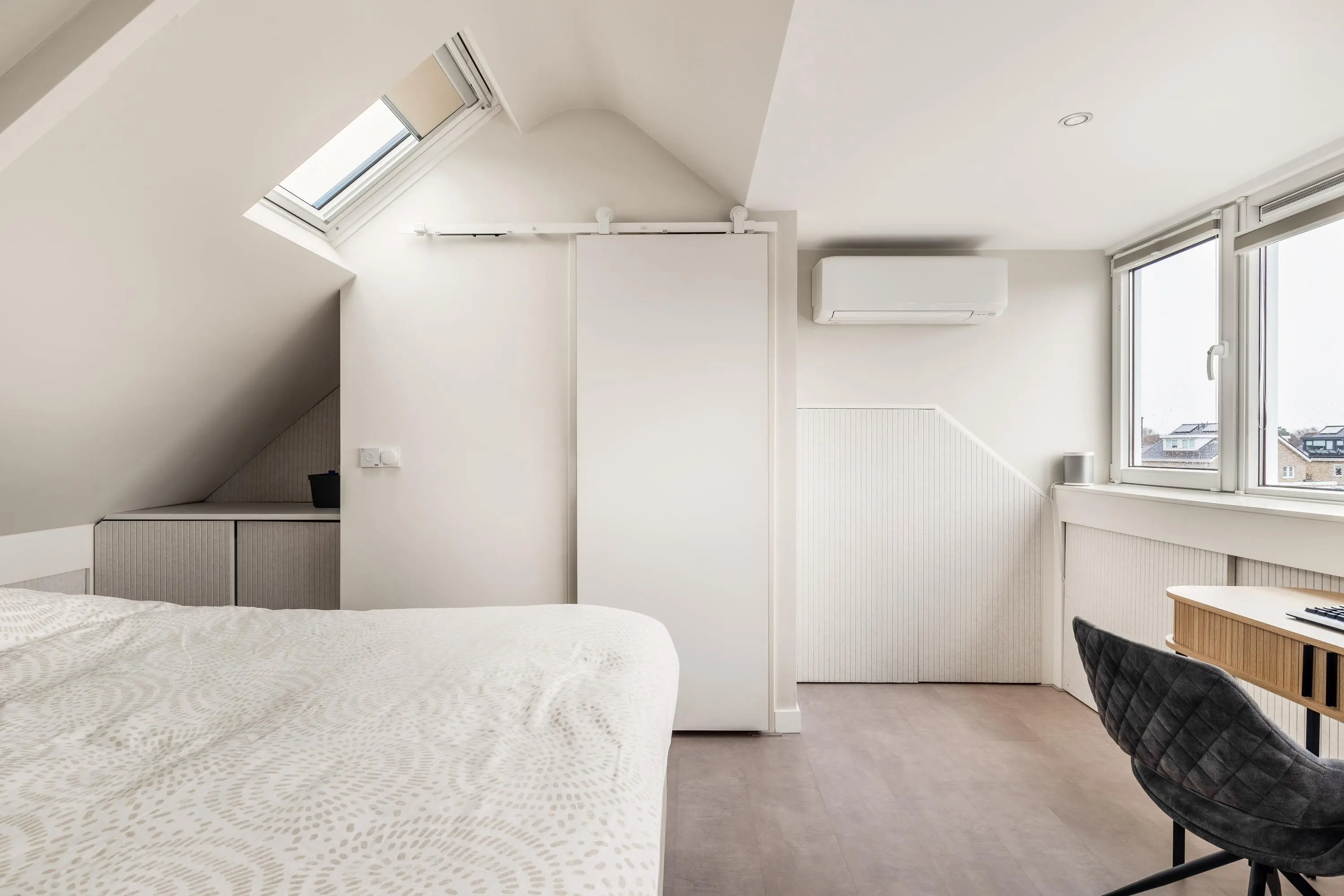 De tweede verdieping is verrassend ruim en beschikt over de derde slaapkamer. Dankzij het dakkapel en twee elektrische dakramen is dit een lichte en comfortabele ruimte die zich uitstekend leent als slaapkamer, werkplek of hobbykamer. Hier bevinden zich ook de aansluitingen voor de wasmachine en droger.