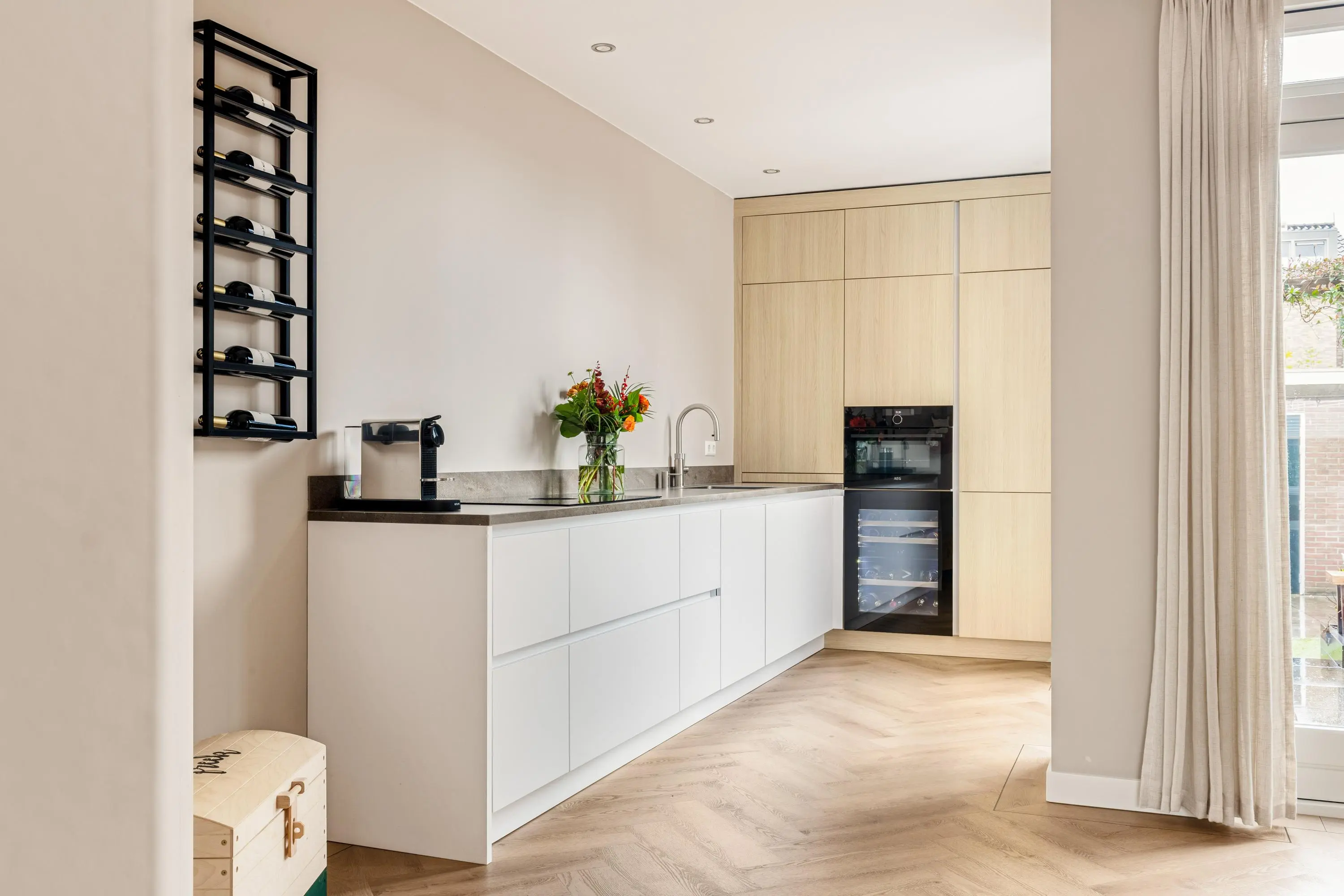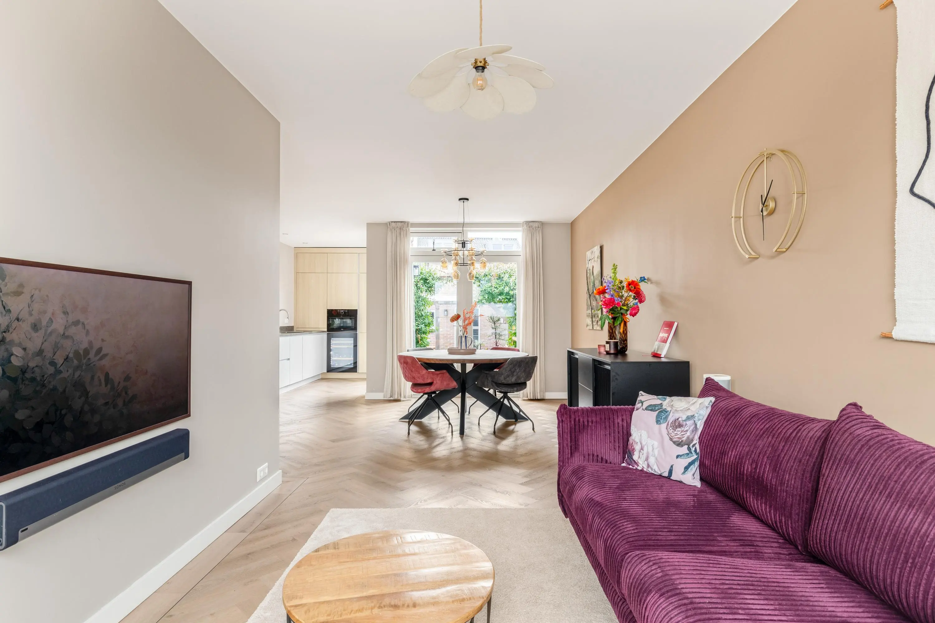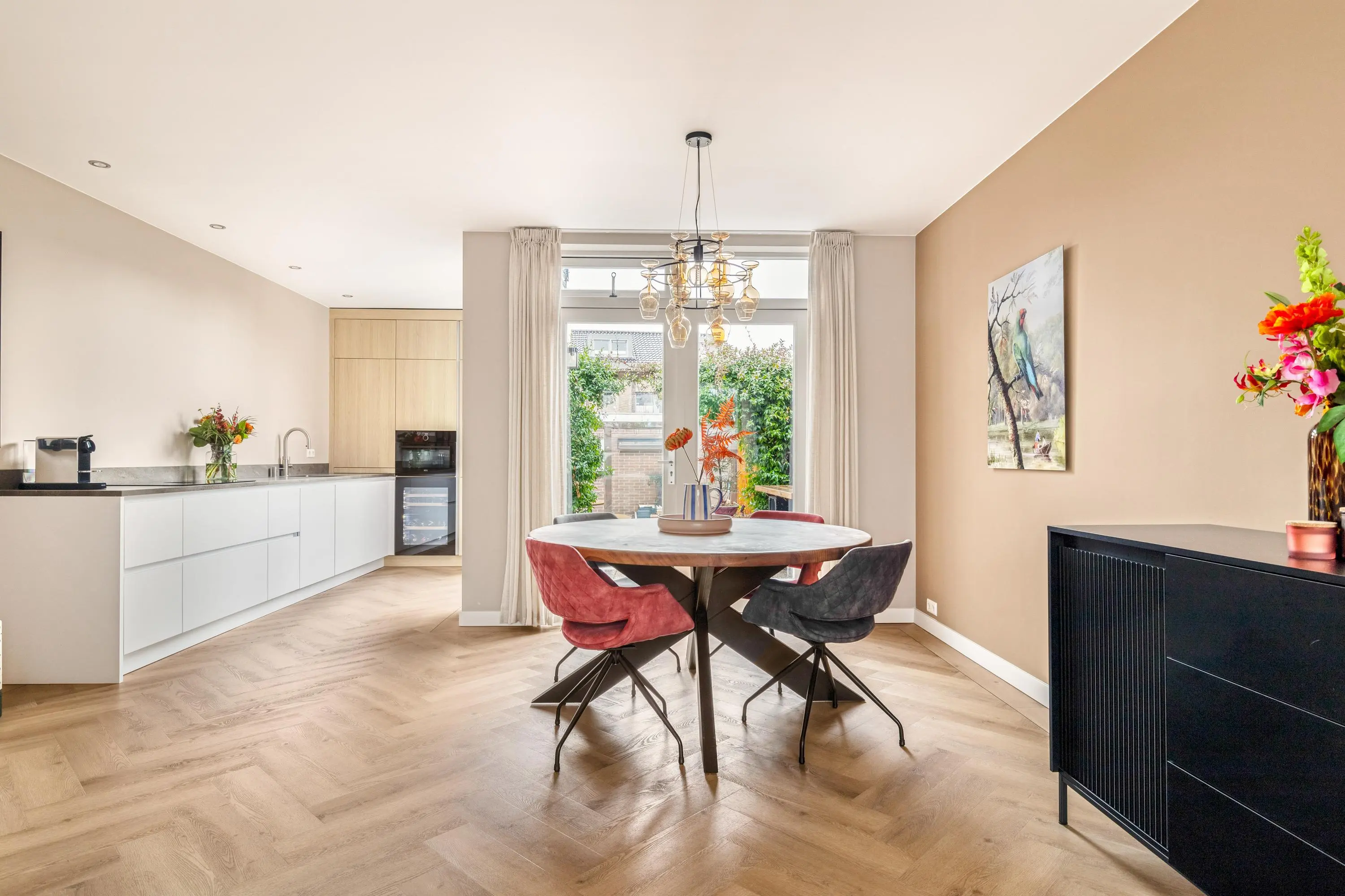 Bij binnenkomst word je verwelkomd door de warme en luxe uitstraling van de sfeervolle woonkamer. De hoge plafonds en grote raampartijen creëren een ruimtelijke en lichte leefruimte waarin je je direct thuis voelt. De gehele begane grond is in 2021 gerenoveerd. De moderne keuken vormt het hart van de woning. Deze is uitgevoerd met hoogwaardige apparatuur en heeft een strakke afwerking. Ideaal om gezellig te tafelen met vrienden en familie.