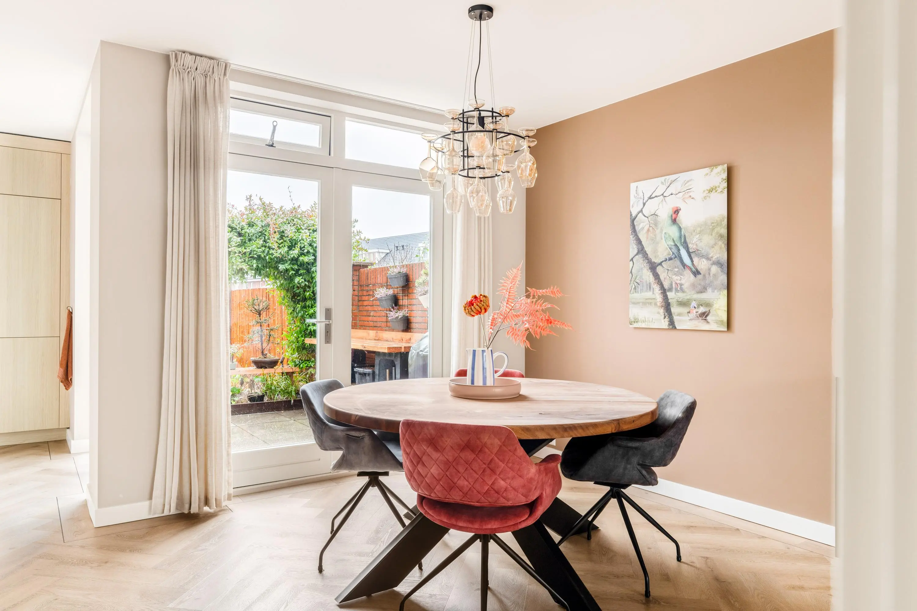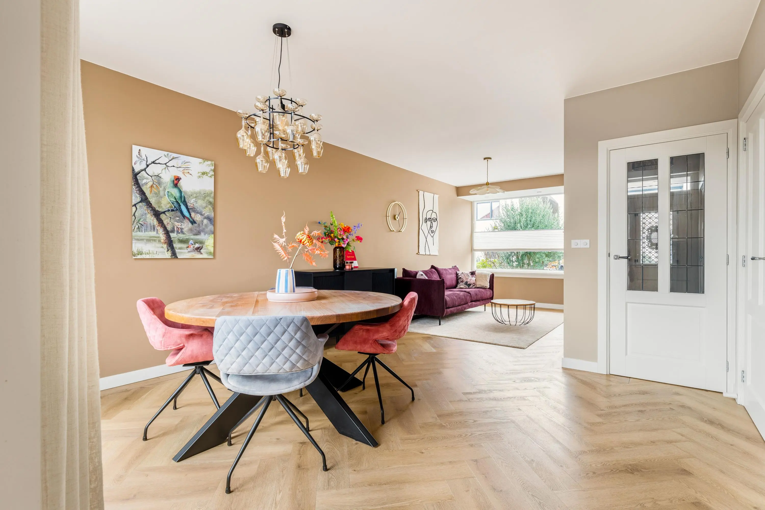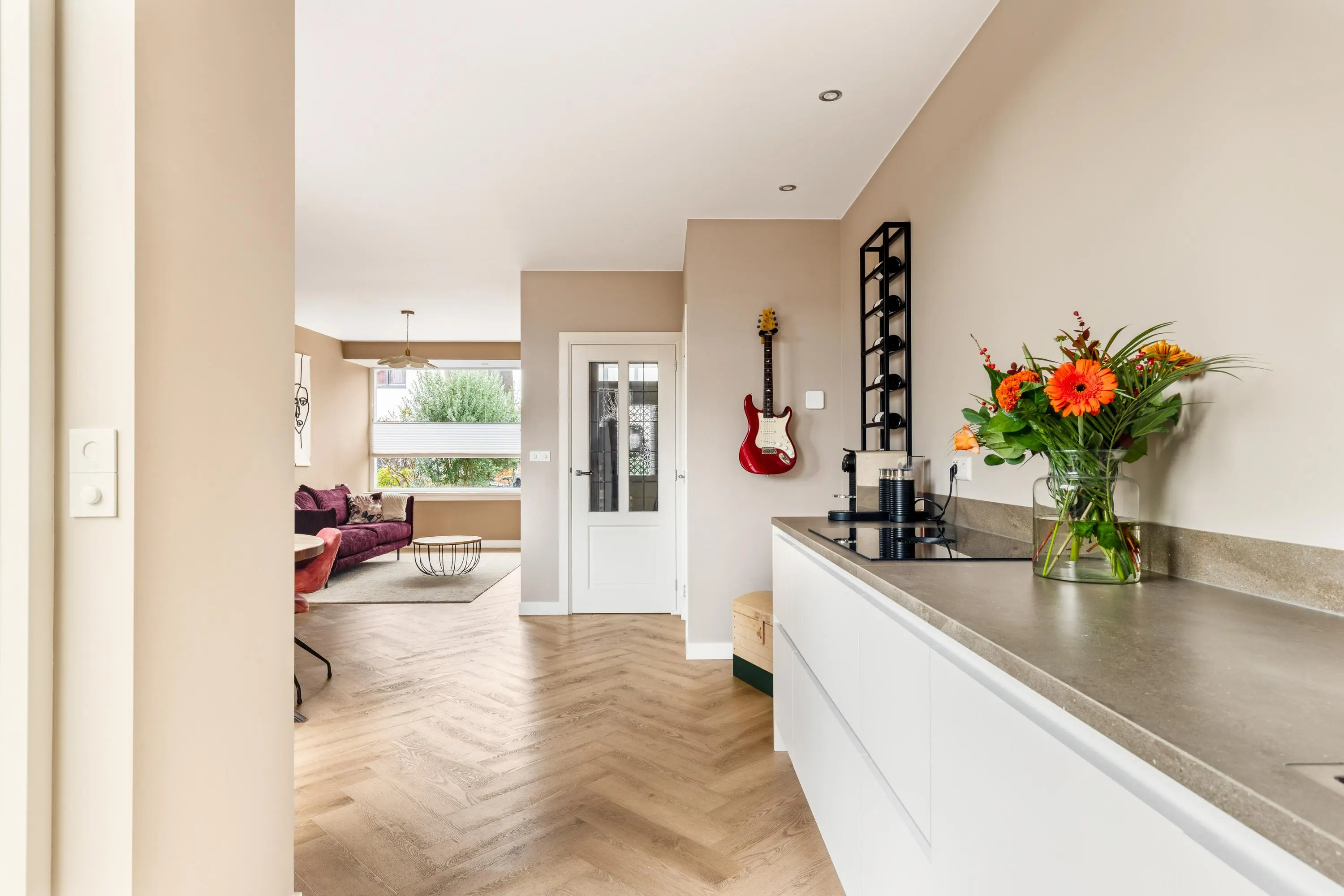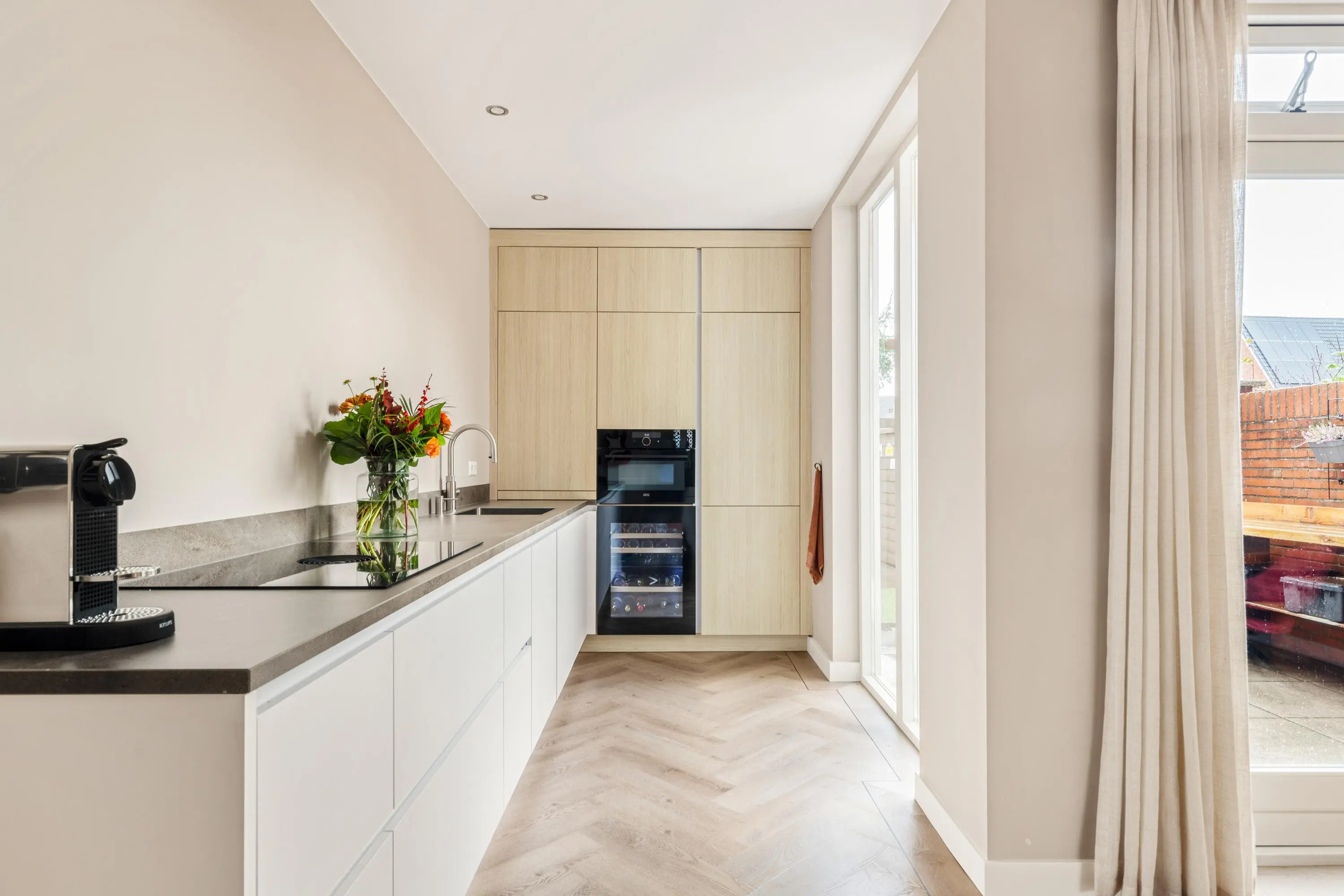 Bij binnenkomst word je verwelkomd door de warme en luxe uitstraling van de sfeervolle woonkamer. De hoge plafonds en grote raampartijen creëren een ruimtelijke en lichte leefruimte waarin je je direct thuis voelt. De gehele begane grond is in 2021 gerenoveerd. De moderne keuken vormt het hart van de woning. Deze is uitgevoerd met hoogwaardige apparatuur en heeft een strakke afwerking. Ideaal om gezellig te tafelen met vrienden en familie.