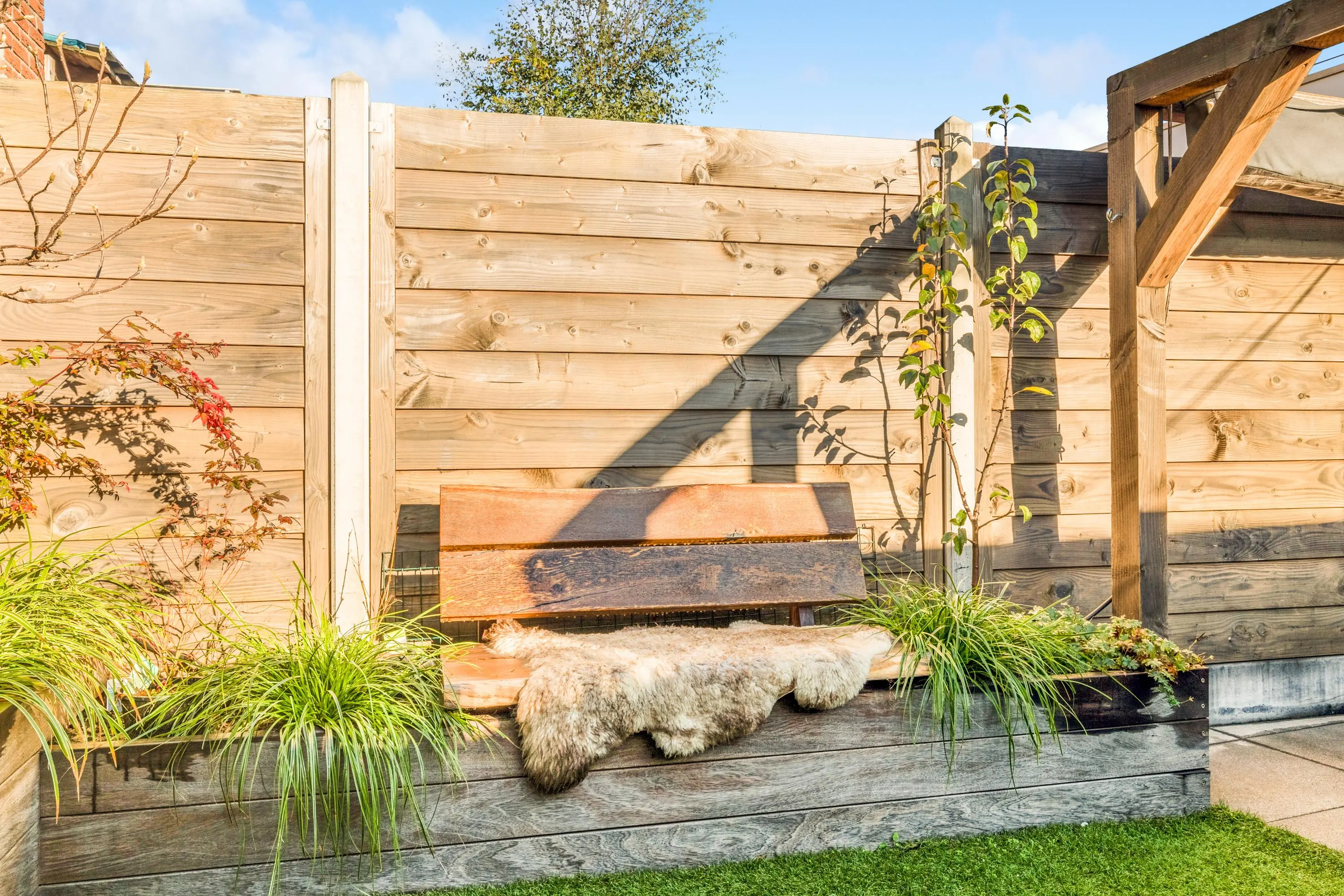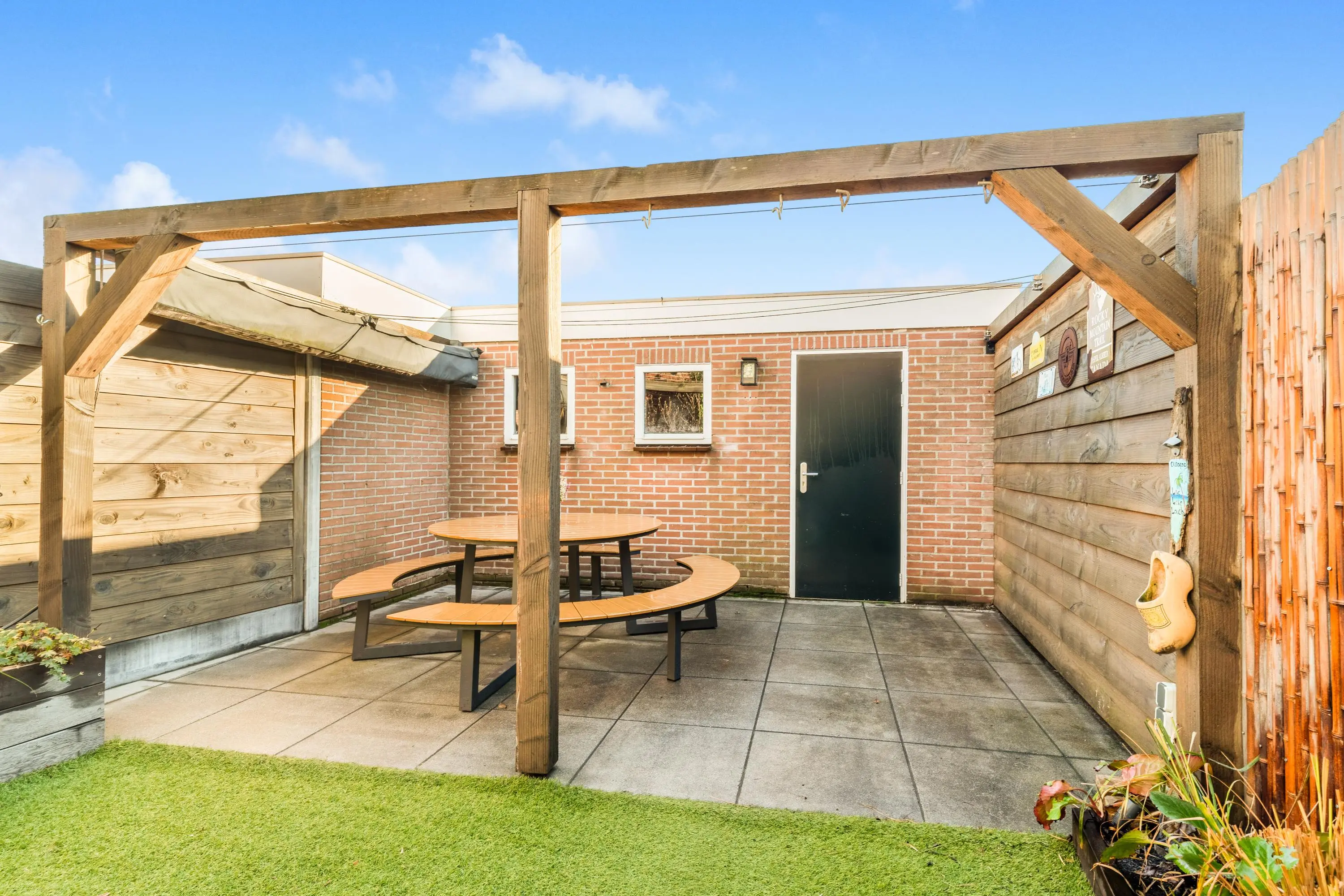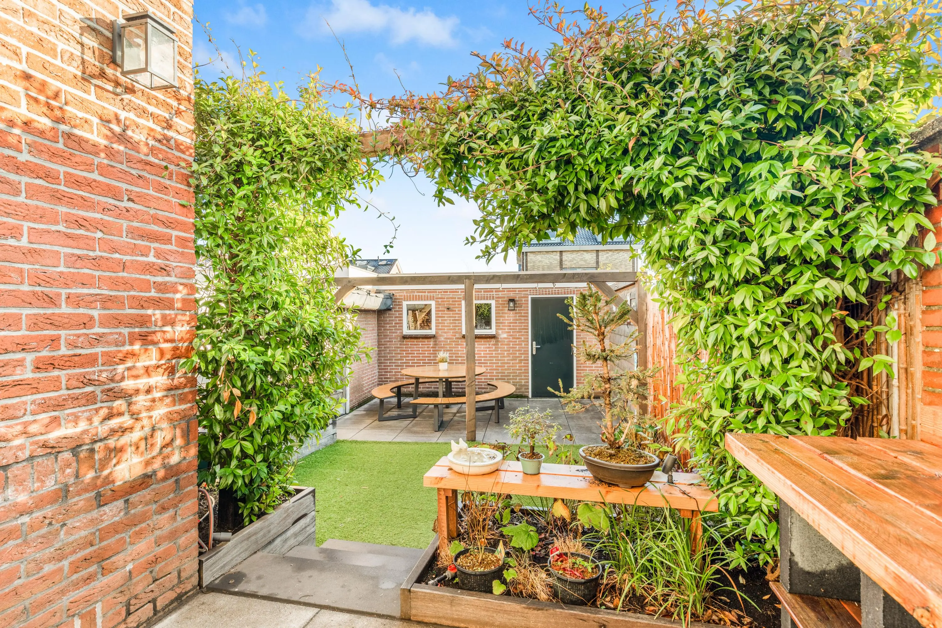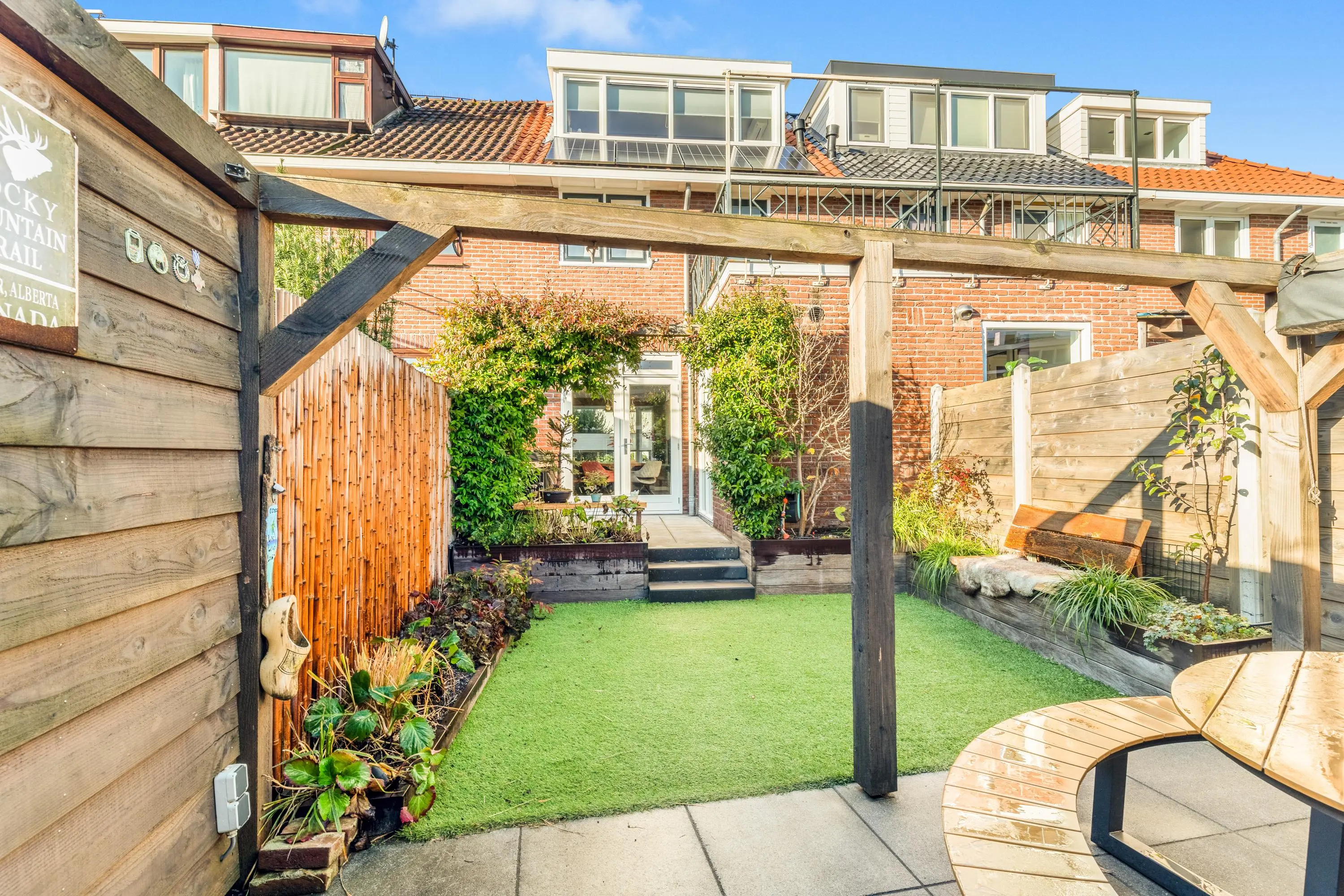 De fraai aangelegde achtertuin biedt veel privacy. Gelegen op het zuidoosten geniet je hier volop van de zon. De tuin heeft een praktische indeling met gezellige zithoekjes, veel groen en een separate berging. Deze biedt meer dan genoeg ruimte voor fietsen en extra opslag.