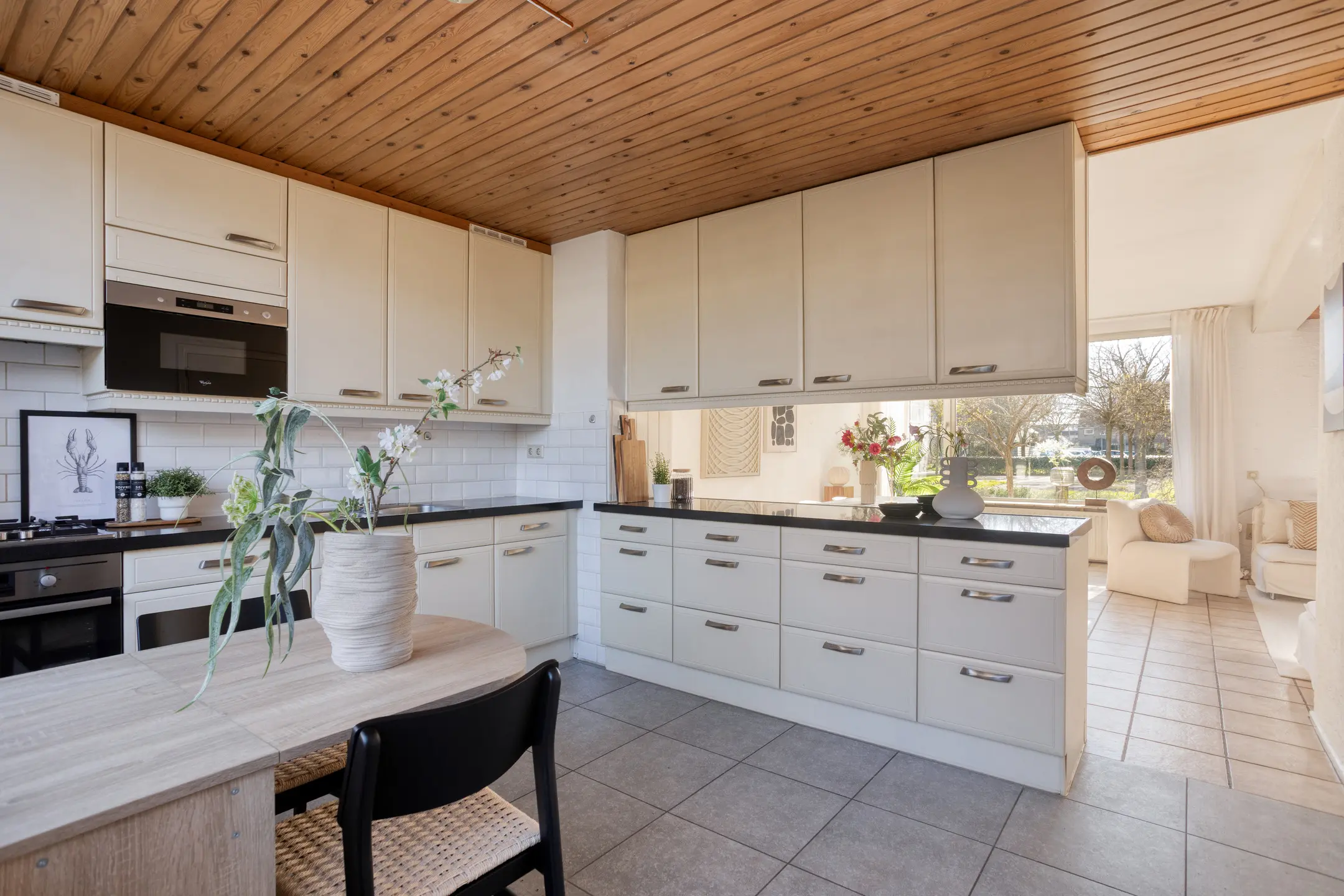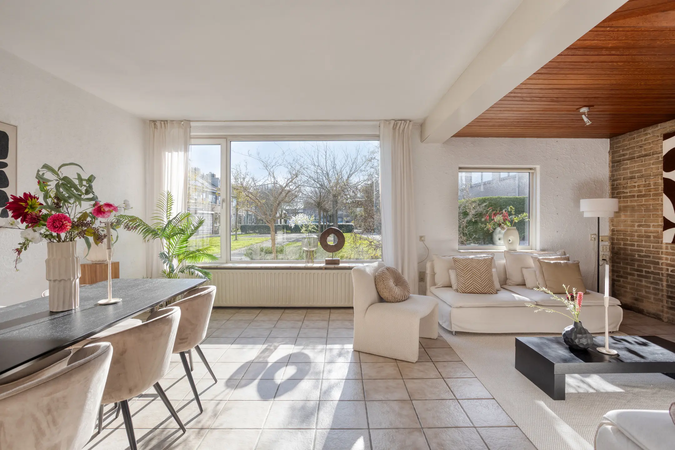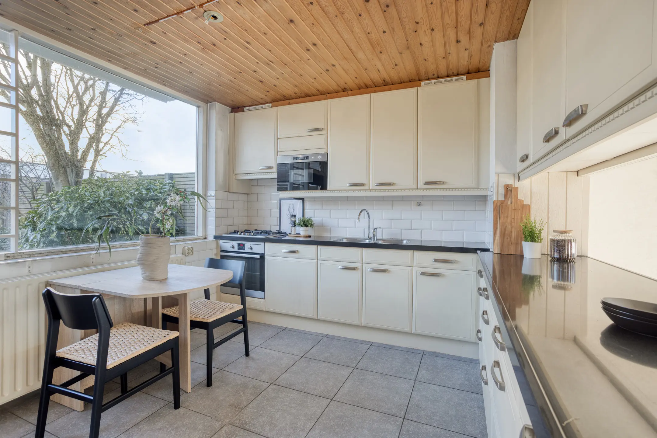 Via de ruime entree met open trap naar de eerste verdieping heb je toegang tot de woon- en eetkamer, maar ook het toilet, de badkamer en de slaapkamer op begane grond. In de woonkamer valt direct de speelse indeling met de keuken en het eetgedeelte op. De keuken is momenteel voorzien van een schiereiland, maar als je liever kiest voor een meer open verbinding met de rest van de ruimte, dan is dit eenvoudig naar wens aan te passen. In het zitgedeelte zorgt de open haard voor extra sfeer en comfort. Daarnaast is er veel prettige en natuurlijk lichtinval dankzij de vele ramen. Je kijkt uit op het plantsoen aan de voorzijde, maar de raampartij tot aan de grond geeft ook zicht op de zijkant van de woning.