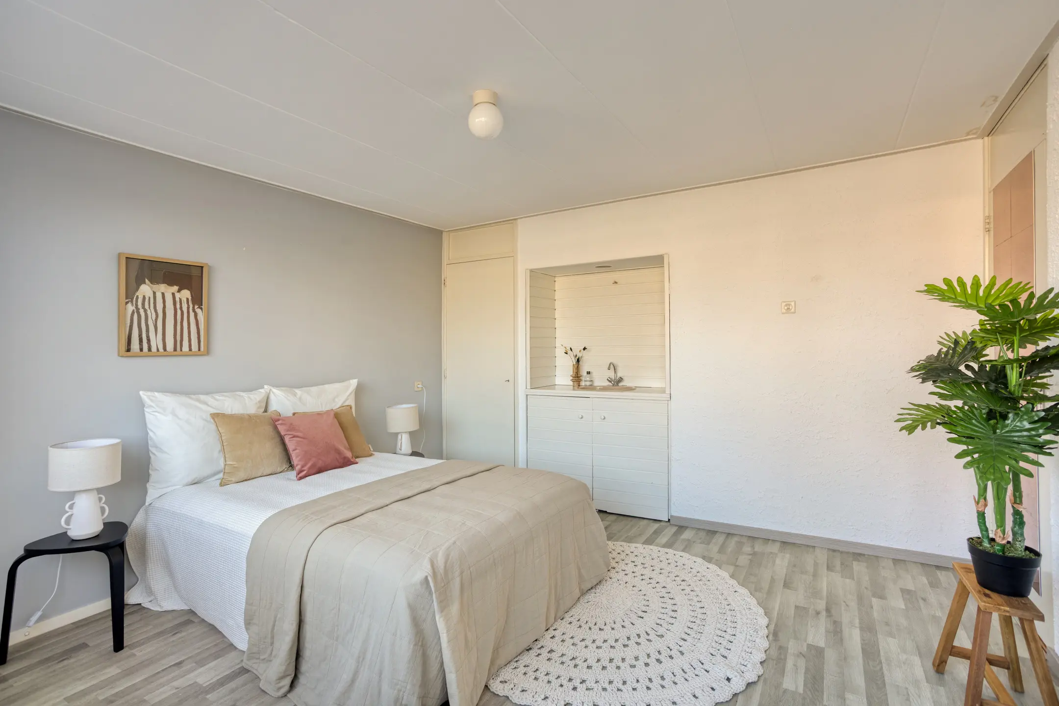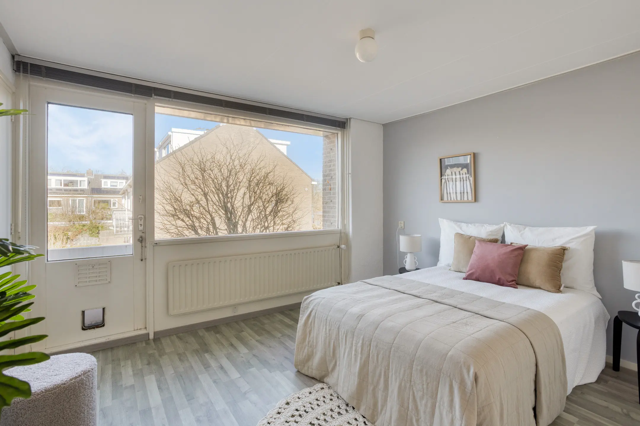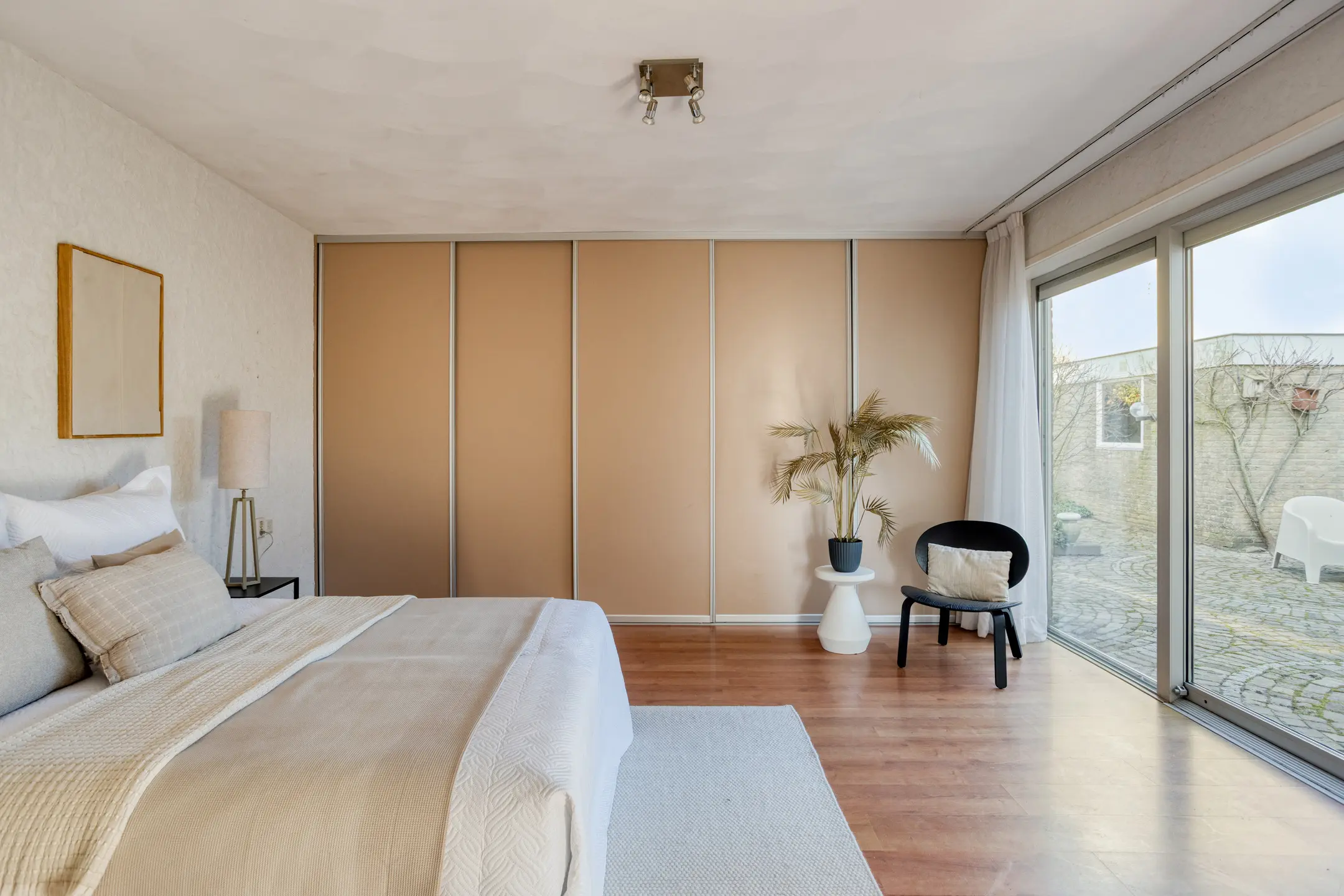 De ruime slaapkamer op de begane grond beschikt over een badkamer en suite voorzien van inloopdouche, dubbele wastafelmeubel en toilet. De grote schuifpui zorgt voor veel daglicht en een mooi zicht op de achtertuin. Ook aan bergruimte is gedacht, want de inbouw wandkast biedt volop plaats voor kleding en andere spullen. Samen met het separate toilet bij de entree, heb je dus twee toiletten op de begane grond. Ideaal!