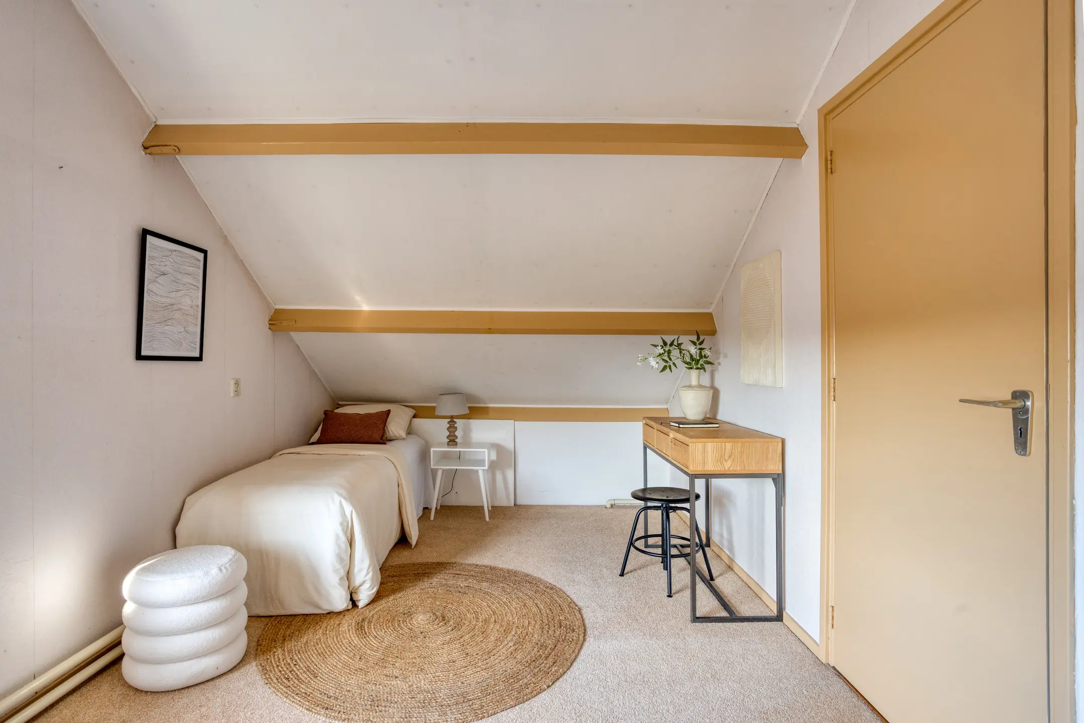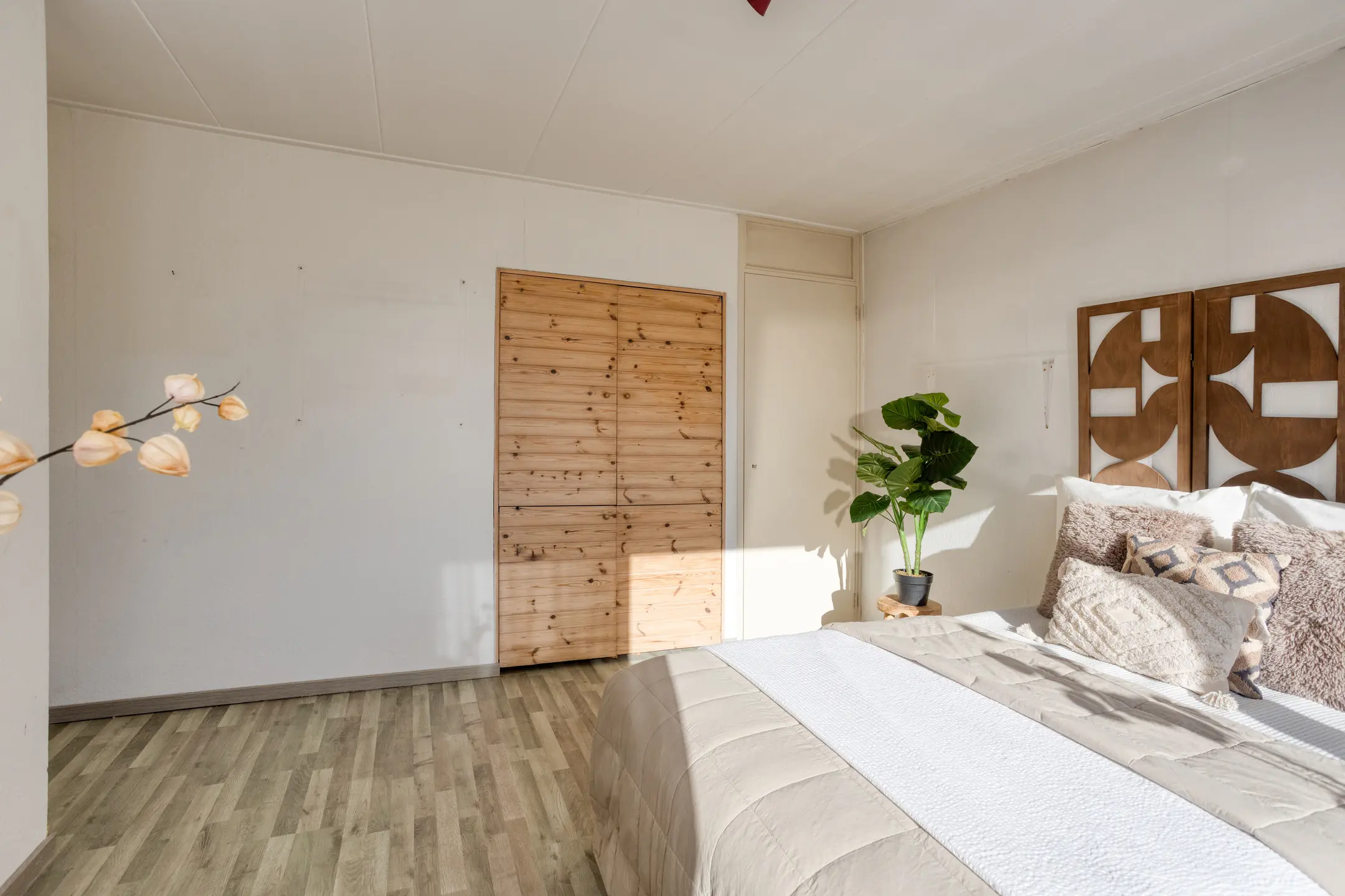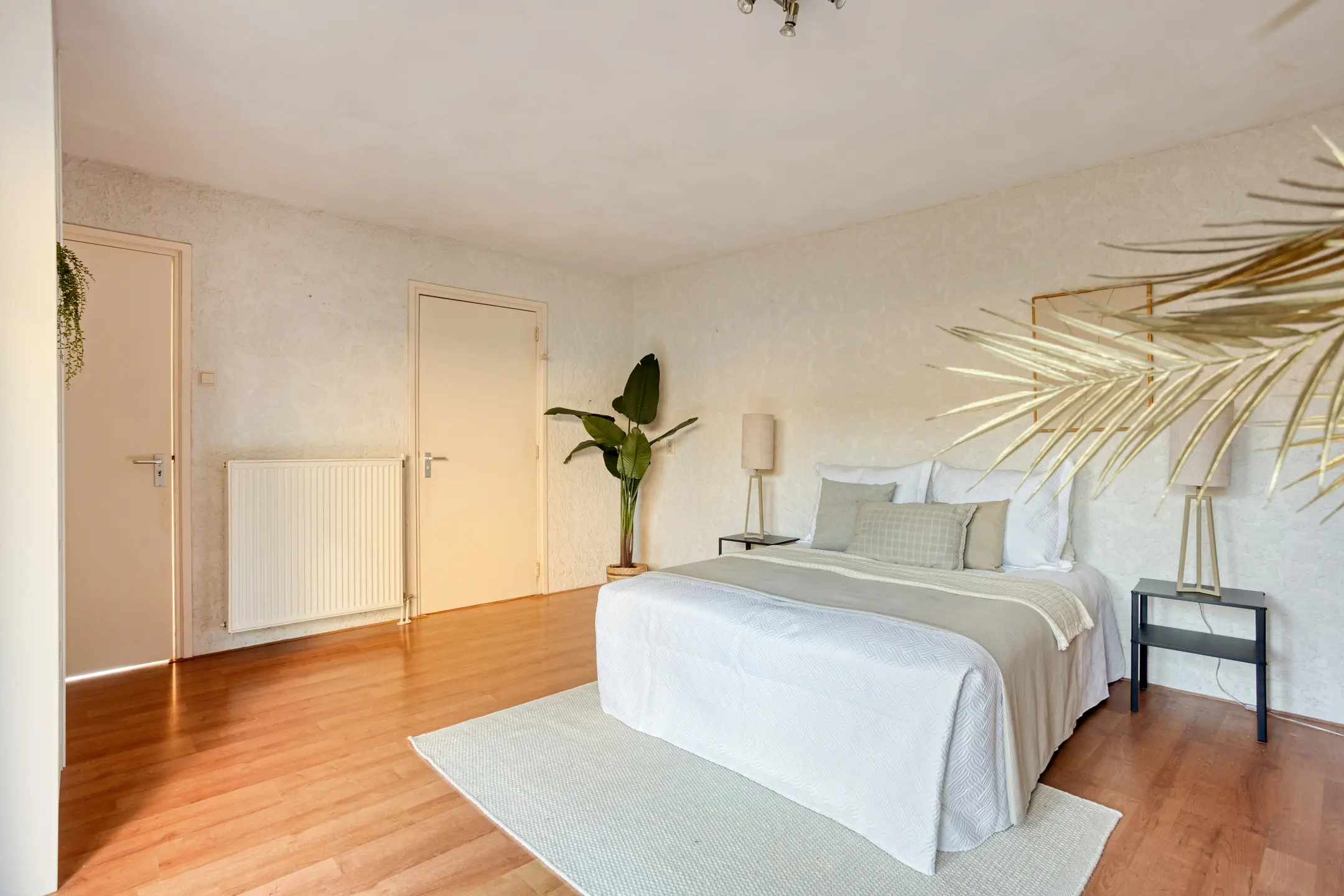 De ruime slaapkamer op de begane grond beschikt over een badkamer en suite voorzien van inloopdouche, dubbele wastafelmeubel en toilet. De grote schuifpui zorgt voor veel daglicht en een mooi zicht op de achtertuin. Ook aan bergruimte is gedacht, want de inbouw wandkast biedt volop plaats voor kleding en andere spullen. Samen met het separate toilet bij de entree, heb je dus twee toiletten op de begane grond. Ideaal!
