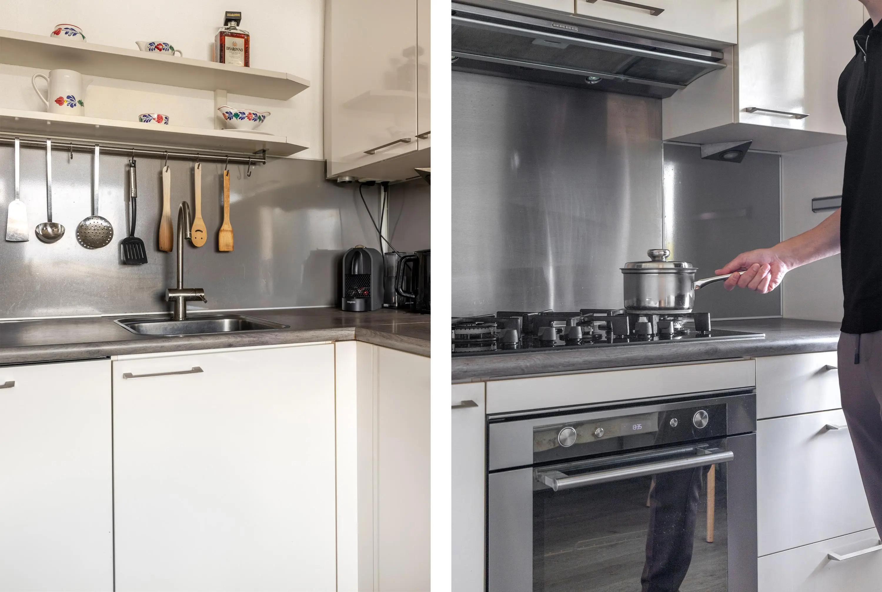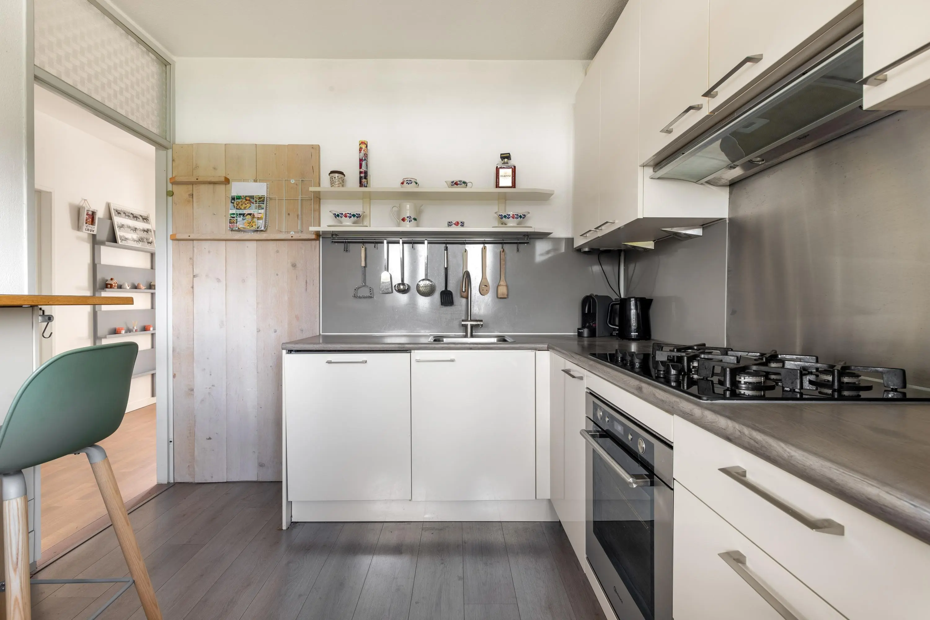 De ruime woonkamer valt direct op door het vele daglicht dat binnenvalt via de grote glazen schuifpui. Er is genoeg ruimte voor zowel een gezellige zithoek als een eethoek. De gesloten keuken is netjes afgewerkt en voorzien van moderne apparatuur, waaronder een 5-pits gasfornuis, oven, koelkast, vriezer en vaatwasser.