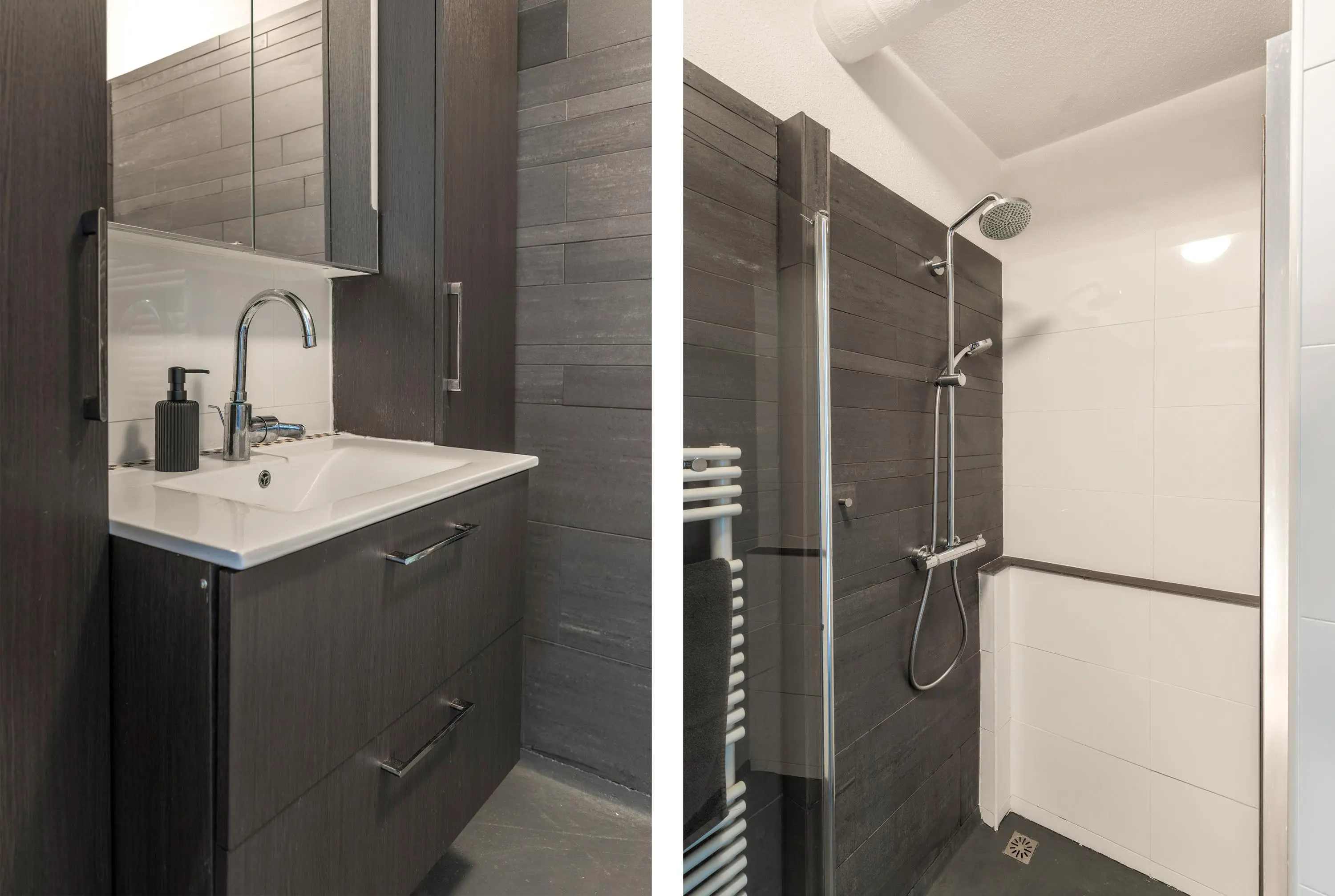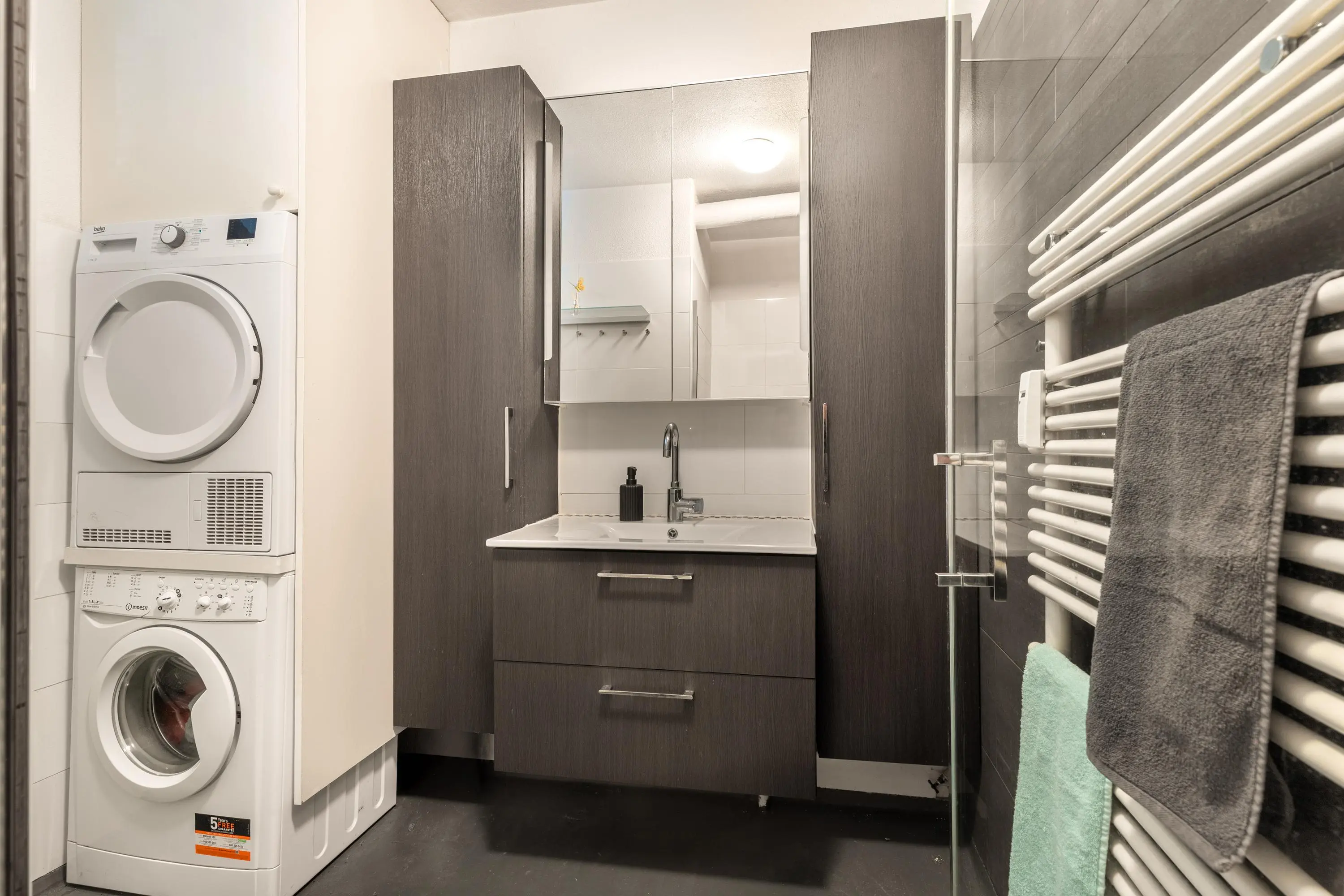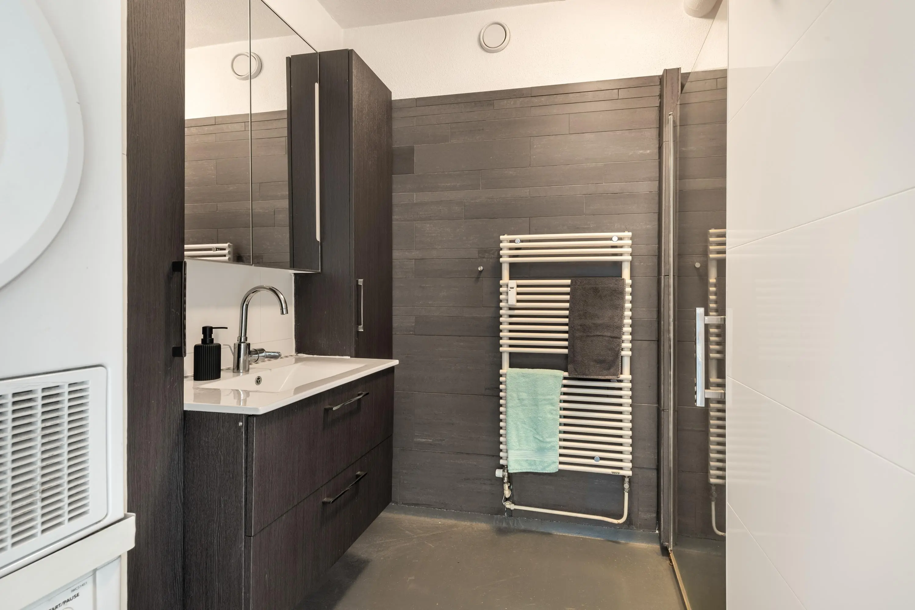 De badkamer is netjes en uitgerust met een inloopdouche, wastafelmeubel en aansluitingen voor wasmachine en droger. Daarnaast is er ook een separaat toilet aanwezig.