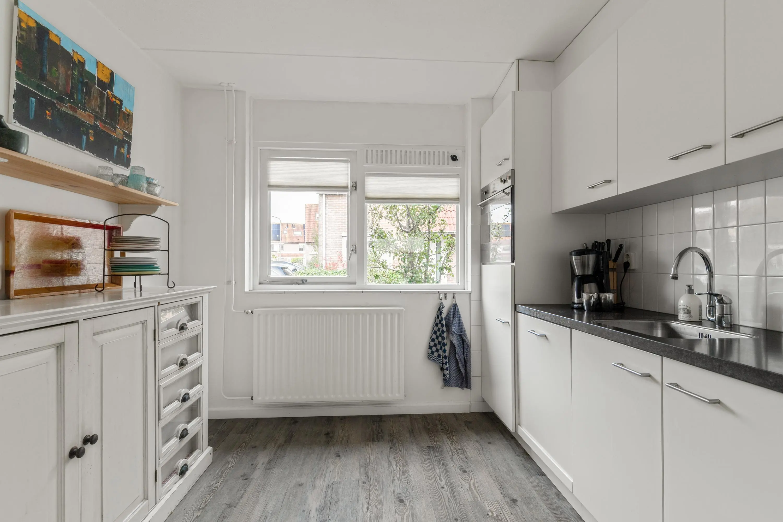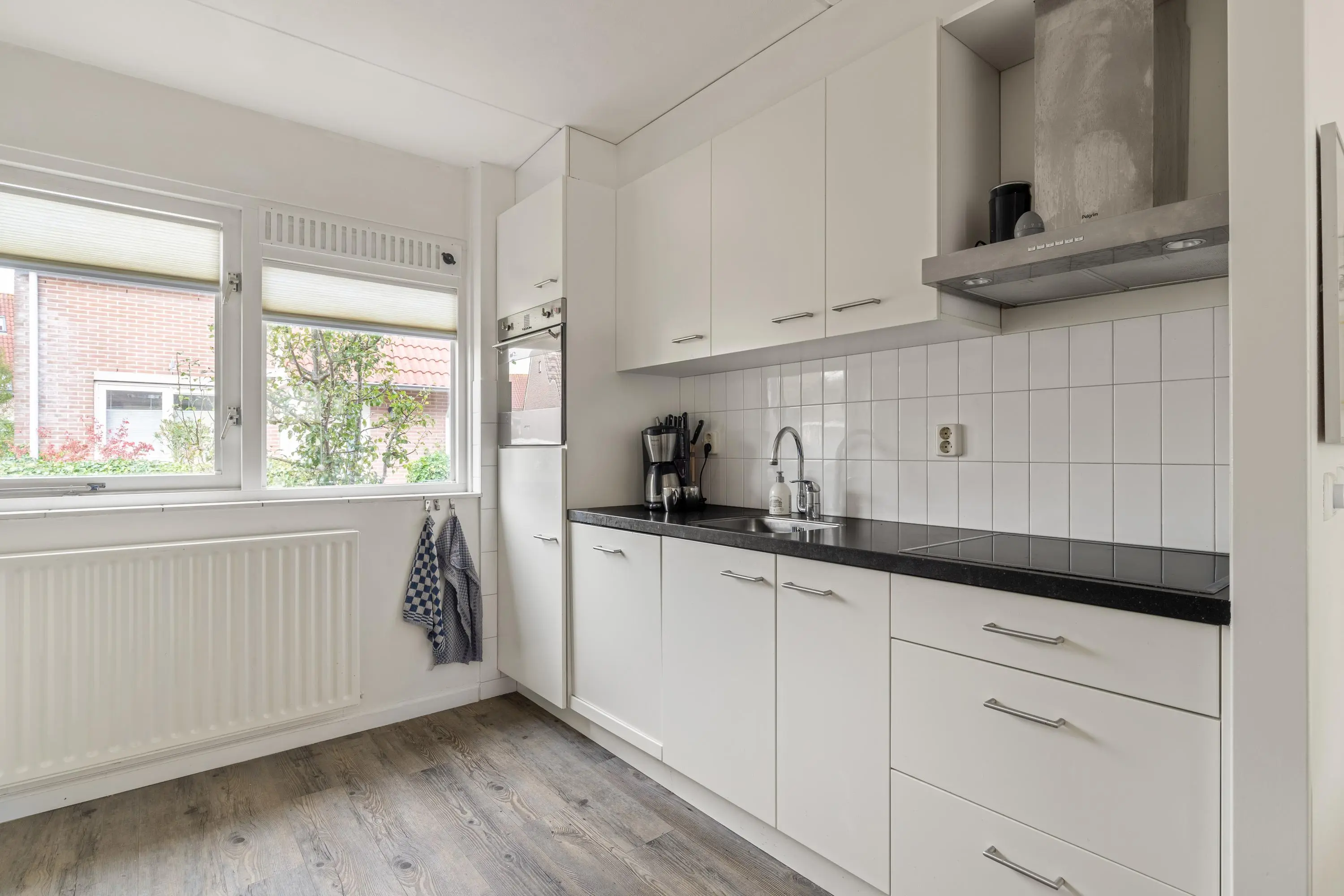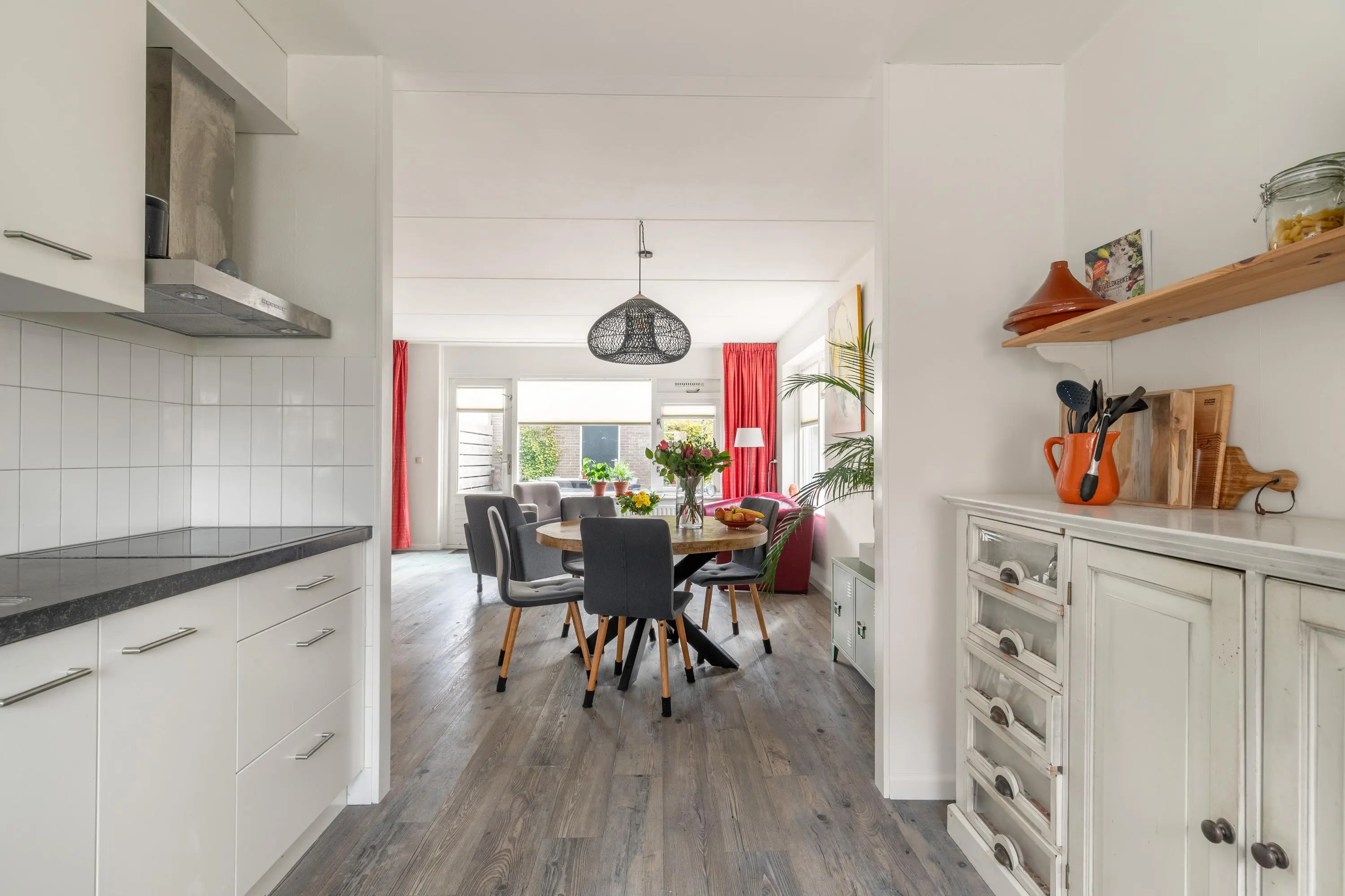 Via de voordeur kom je in de hal (of, zoals echte Uitgeesters doen: gewoon lekker achterom!). In de hal vind je het toilet, de trapopgang en de toegang tot de lichte woonkamer. Deze is heerlijk ruim, met grote raampartijen aan de achterzijde voor veel daglicht. Aan de voorzijde bevindt zich de open keuken, voorzien van een mooi werkblad en diverse inbouwapparatuur, zoals een inductiekookplaat, afzuigkap, oven, koelkast en vaatwasser. Aan de achterzijde van de woning hangt een groot zonnescherm, ideaal voor de warme zomerdagen!