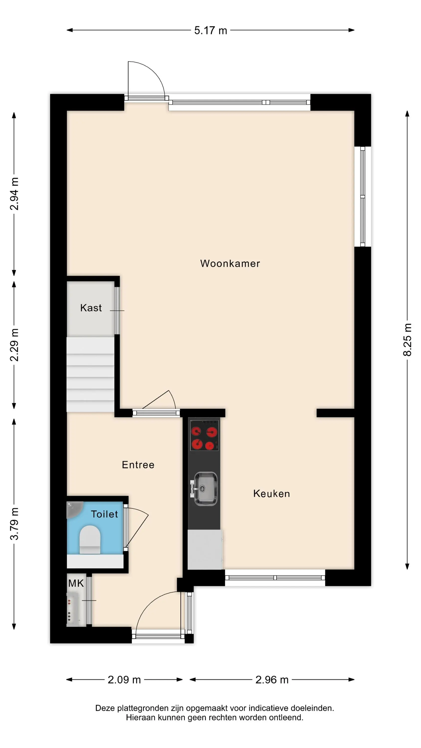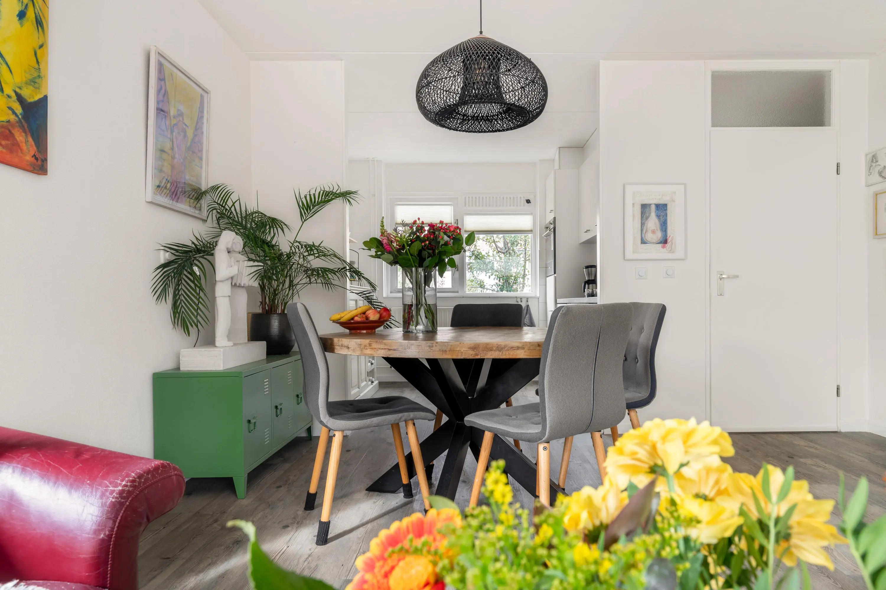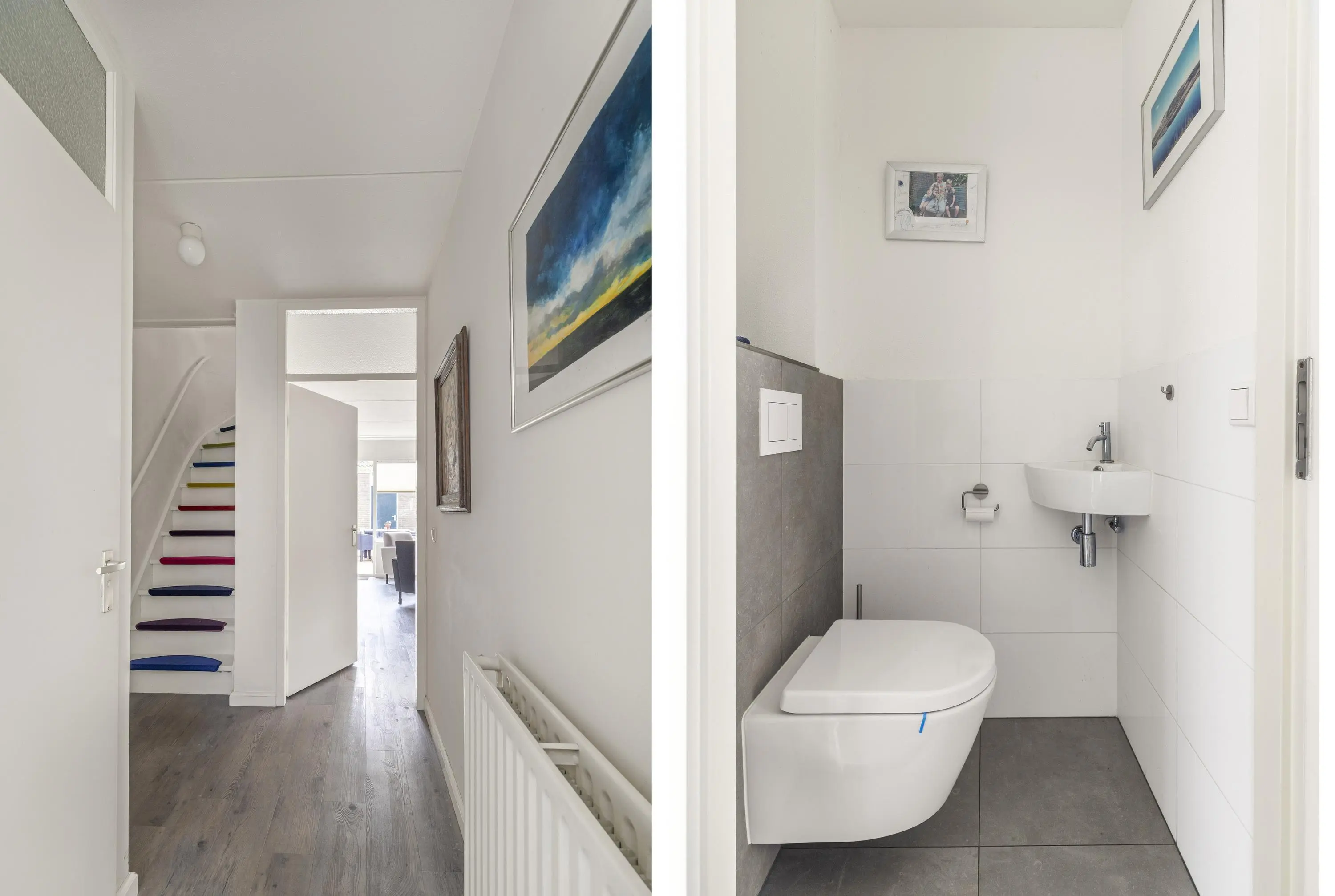 Via de voordeur kom je in de hal (of, zoals echte Uitgeesters doen: gewoon lekker achterom!). In de hal vind je het toilet, de trapopgang en de toegang tot de lichte woonkamer. Deze is heerlijk ruim, met grote raampartijen aan de achterzijde voor veel daglicht. Aan de voorzijde bevindt zich de open keuken, voorzien van een mooi werkblad en diverse inbouwapparatuur, zoals een inductiekookplaat, afzuigkap, oven, koelkast en vaatwasser. Aan de achterzijde van de woning hangt een groot zonnescherm, ideaal voor de warme zomerdagen!