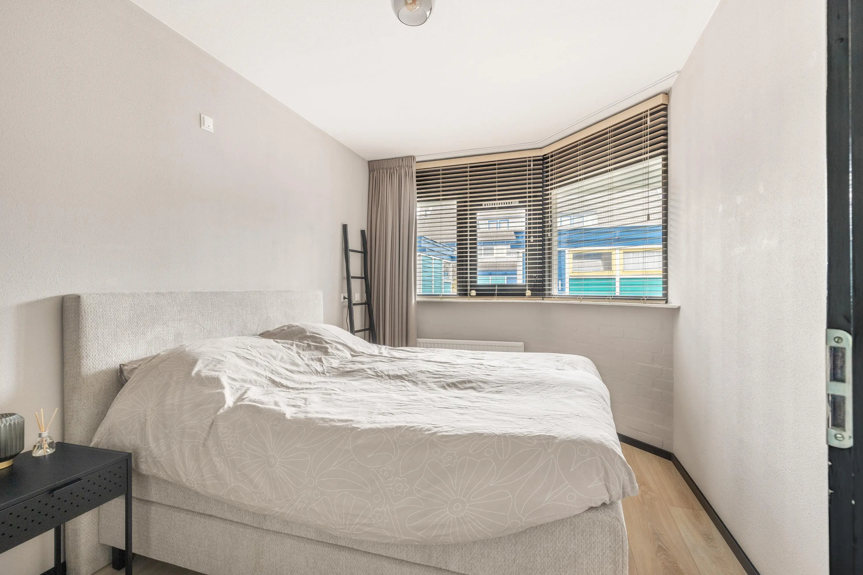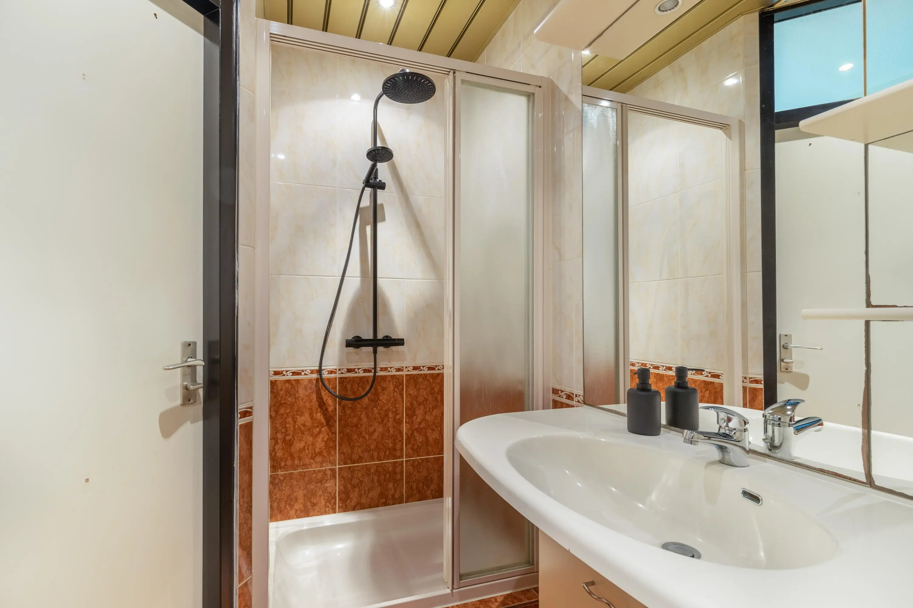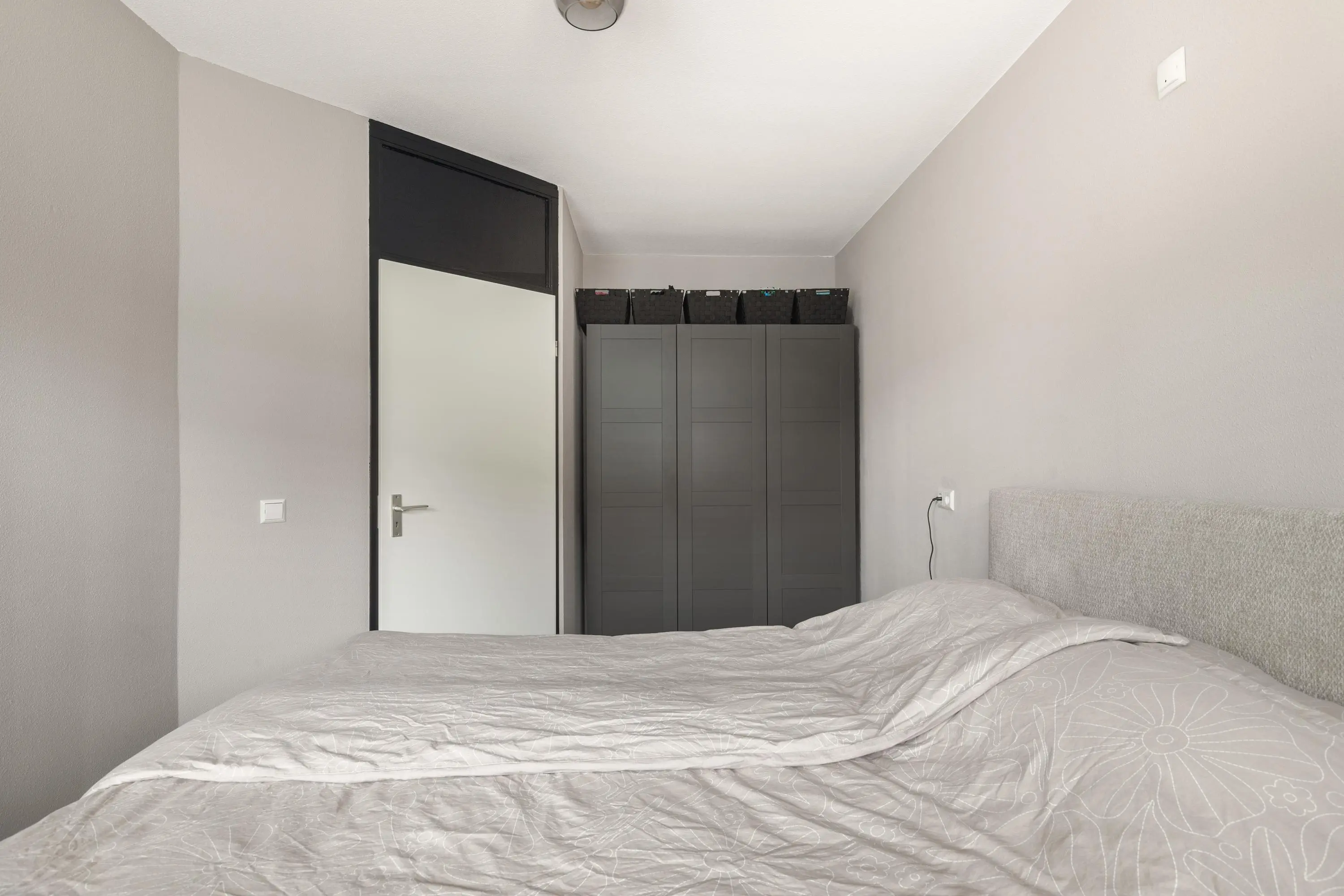 De slaapkamer biedt voldoende ruimte voor een tweepersoonsbed en kledingkast. De badkamer is netjes en praktisch ingedeeld met een douche, wastafelmeubel en aansluiting voor de wasmachine/droger, waardoor alles wat je nodig hebt binnen handbereik is.