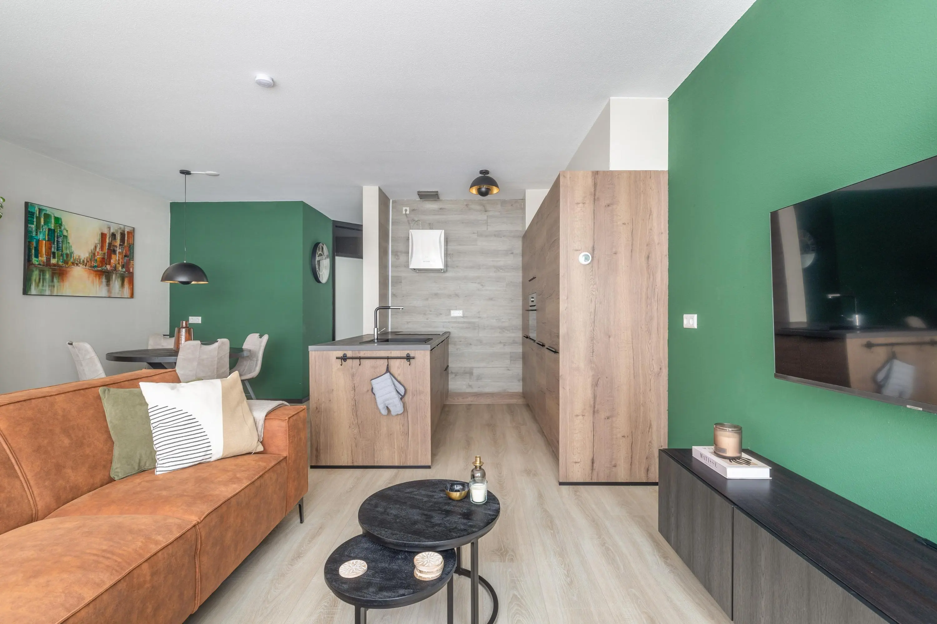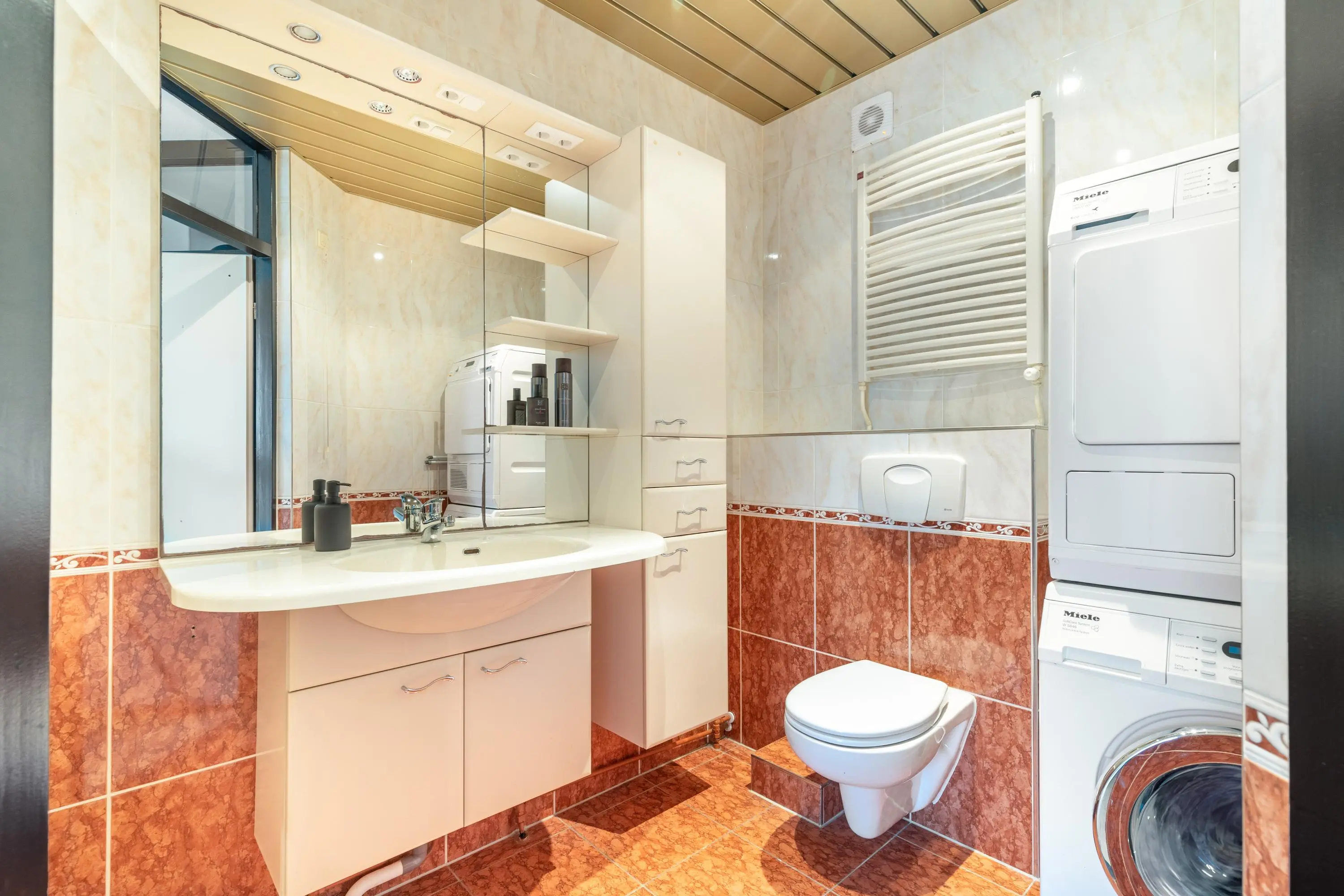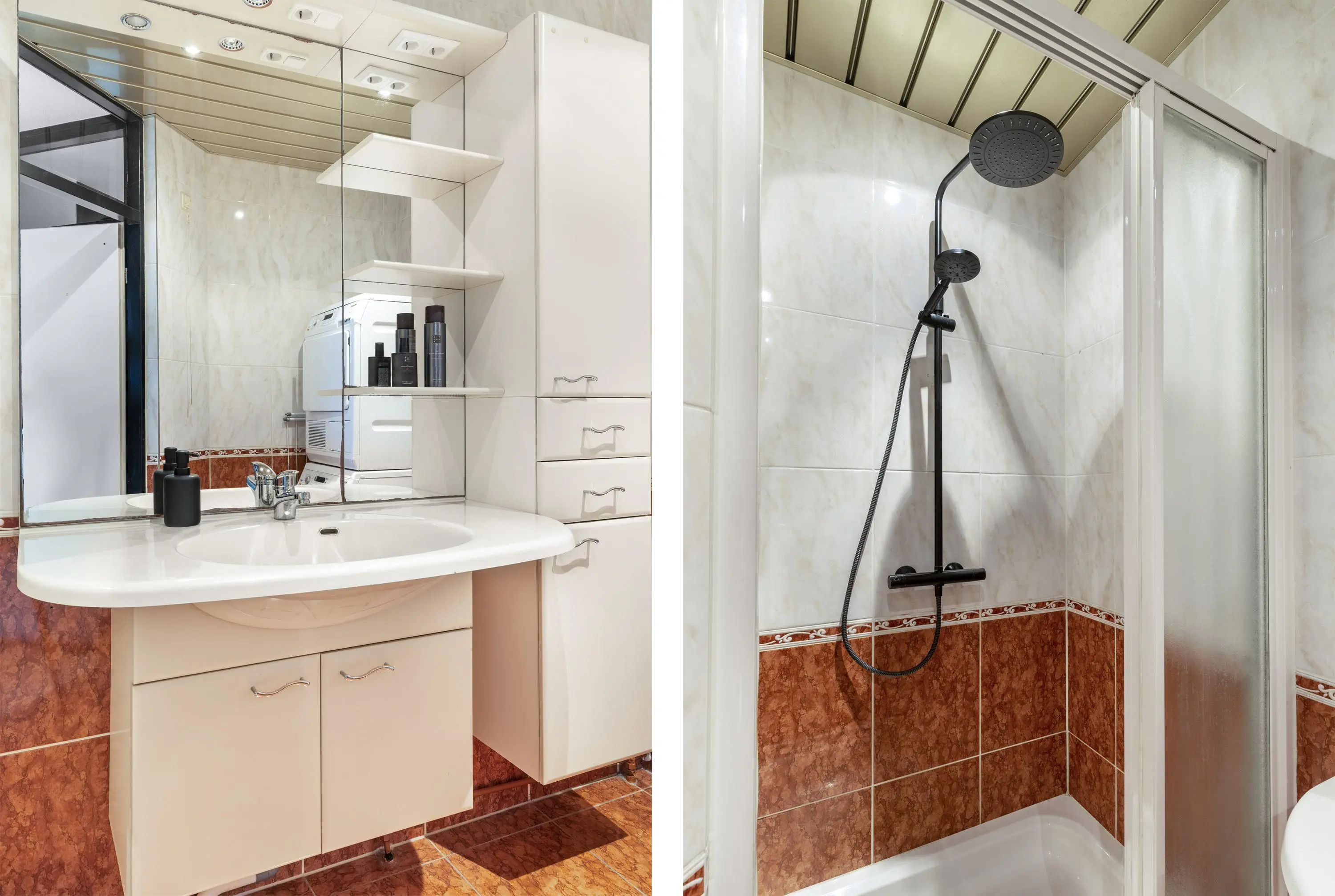 De slaapkamer biedt voldoende ruimte voor een tweepersoonsbed en kledingkast. De badkamer is netjes en praktisch ingedeeld met een douche, wastafelmeubel en aansluiting voor de wasmachine/droger, waardoor alles wat je nodig hebt binnen handbereik is.