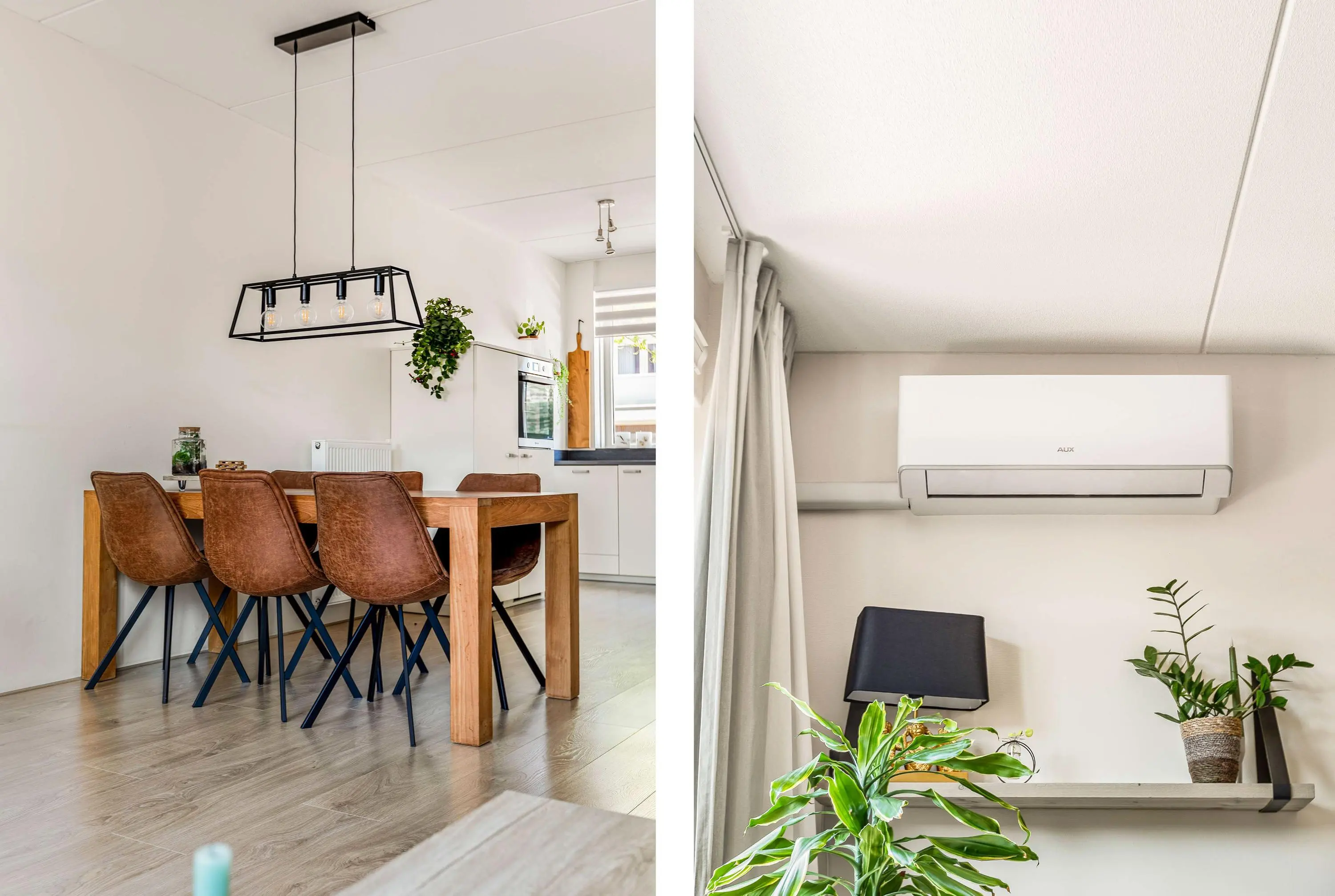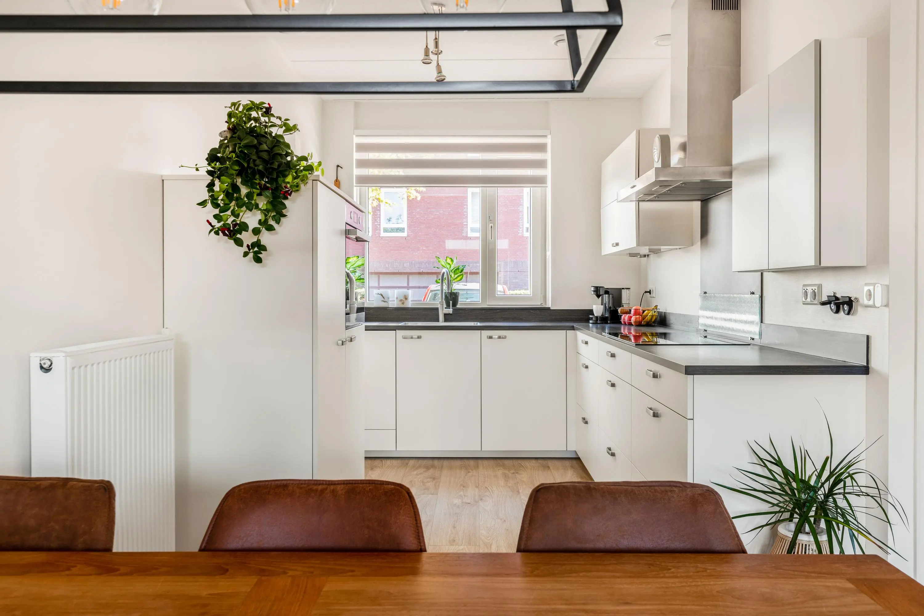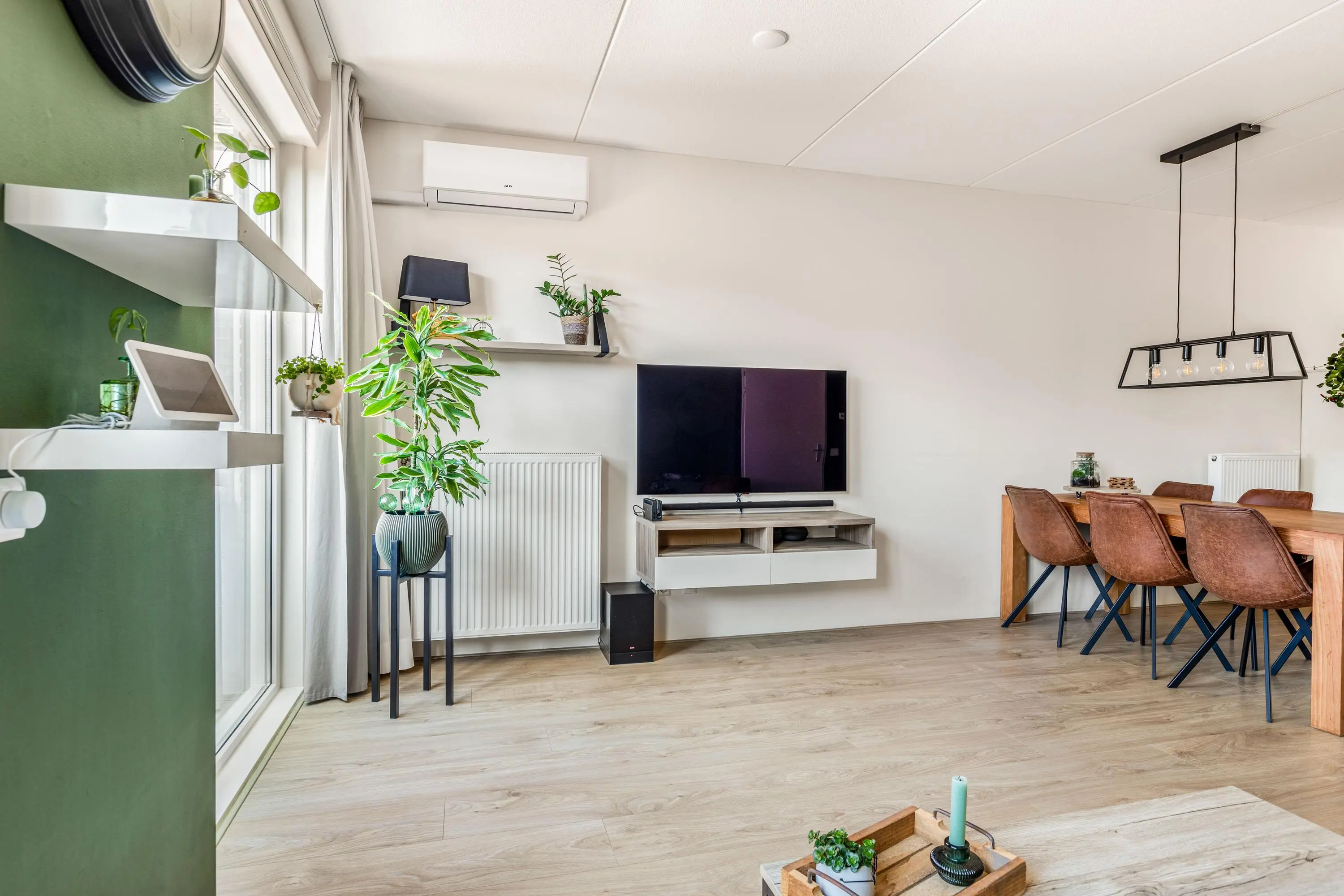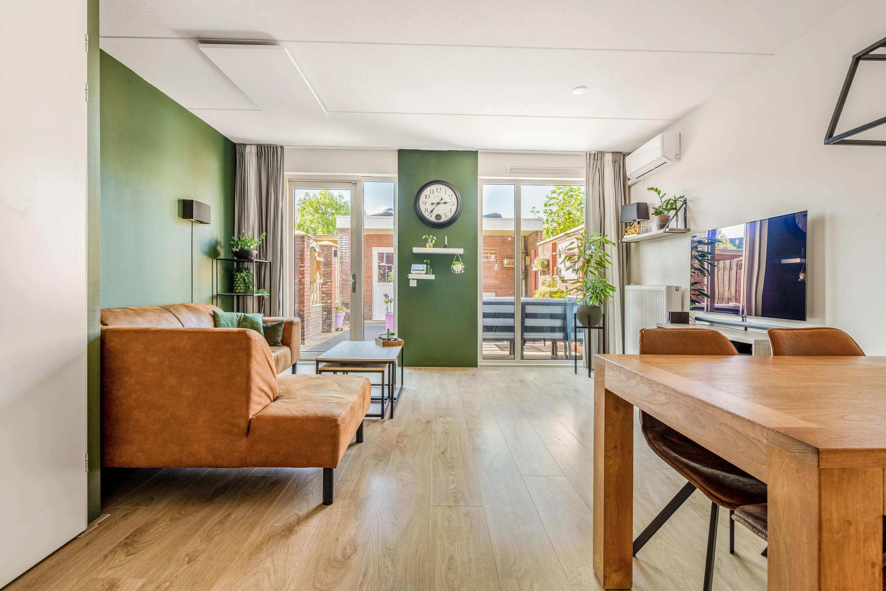 Je komt binnen in de hal met toegang tot het toilet, de trapopgang en de woonkamer. De lichte woonkamer is tuingericht en aan de voorzijde bevindt zich de moderne open keuken. Deze is van alle gemakken voorzien: een inductiekookplaat, afzuigkap, vaatwasser, oven, koelkast, vriezer én een Quooker. Aan de achterzijde van de woonkamer hangt een airco, wat zorgt voor extra comfort tijdens warme zomerdagen maar ook voor verwarming bij koele dagen.