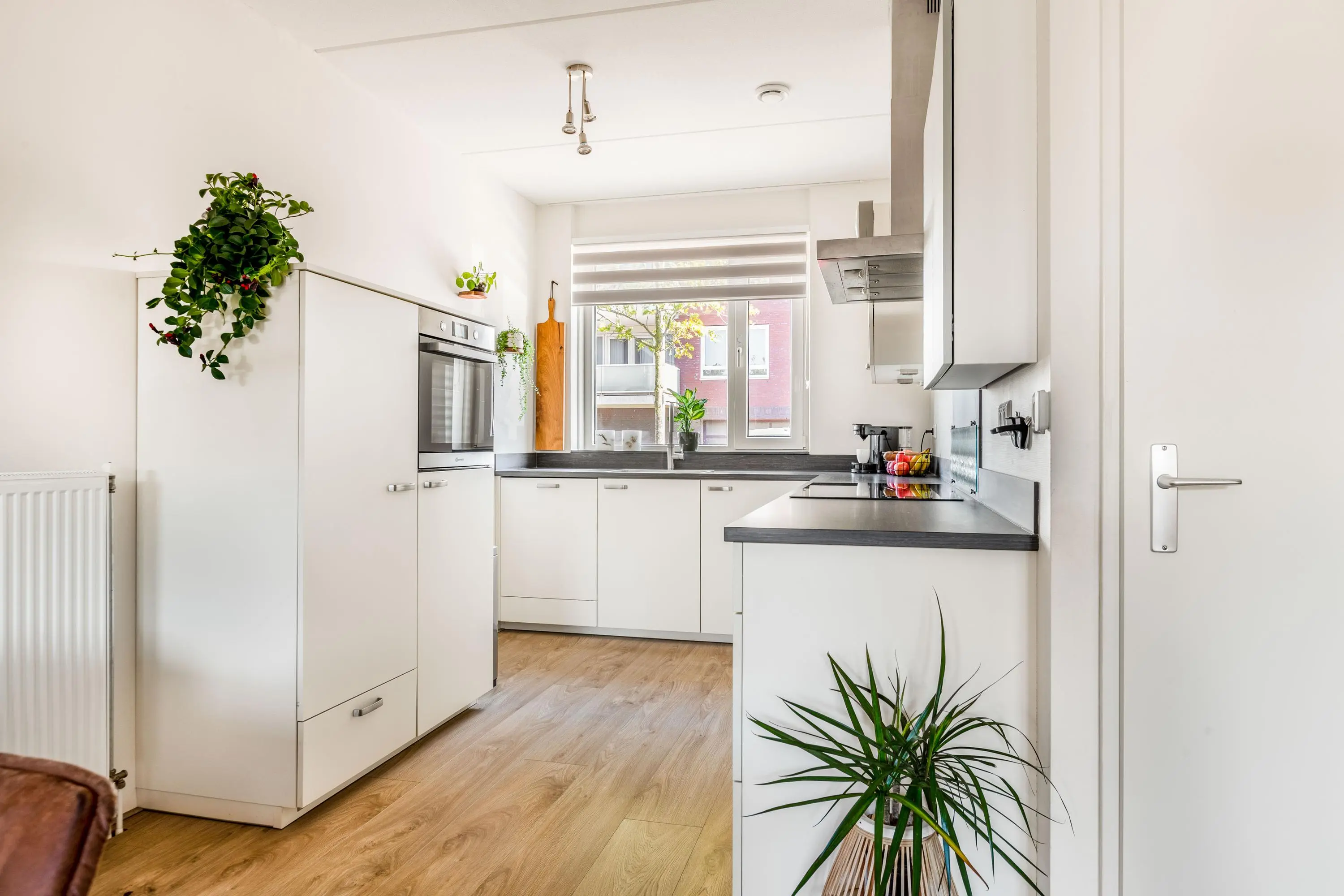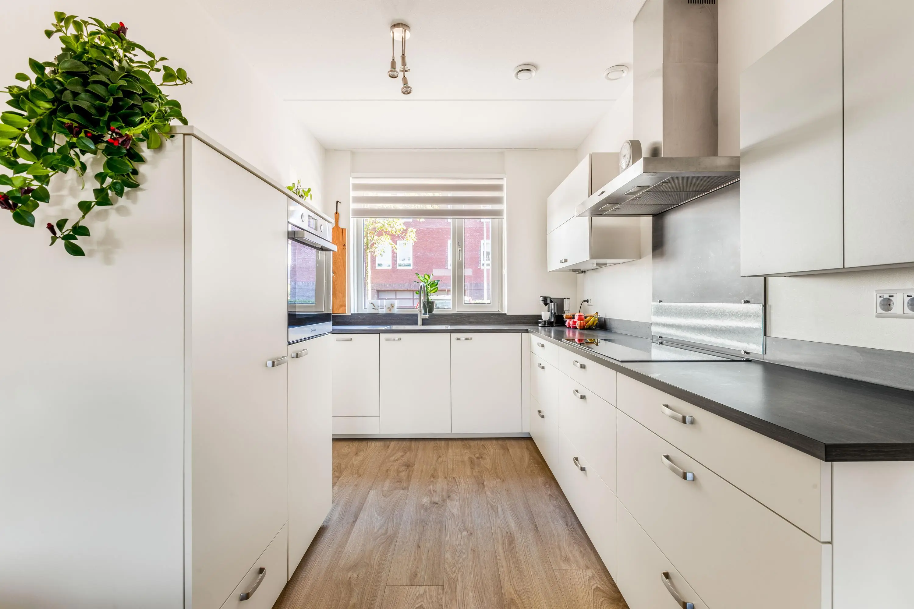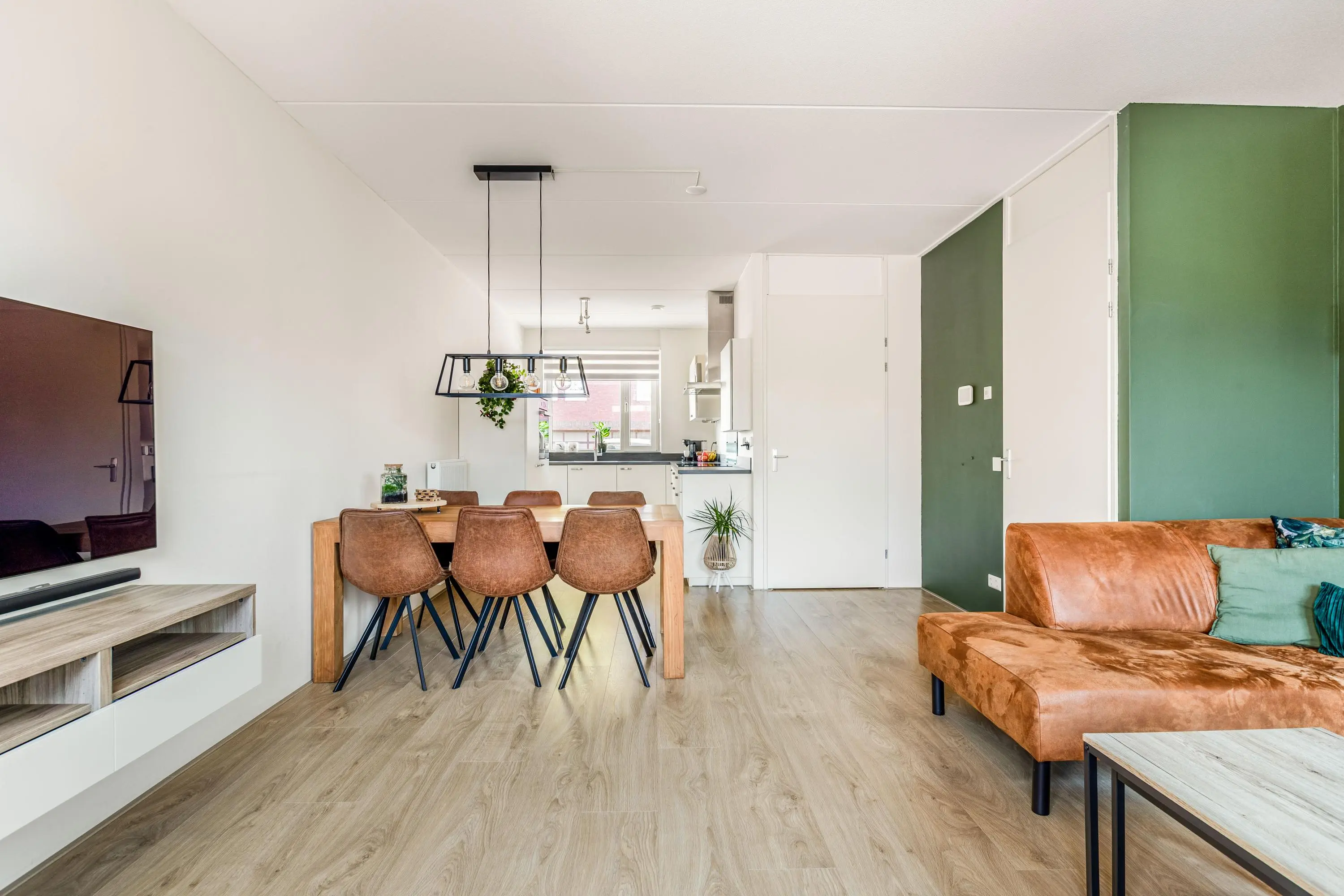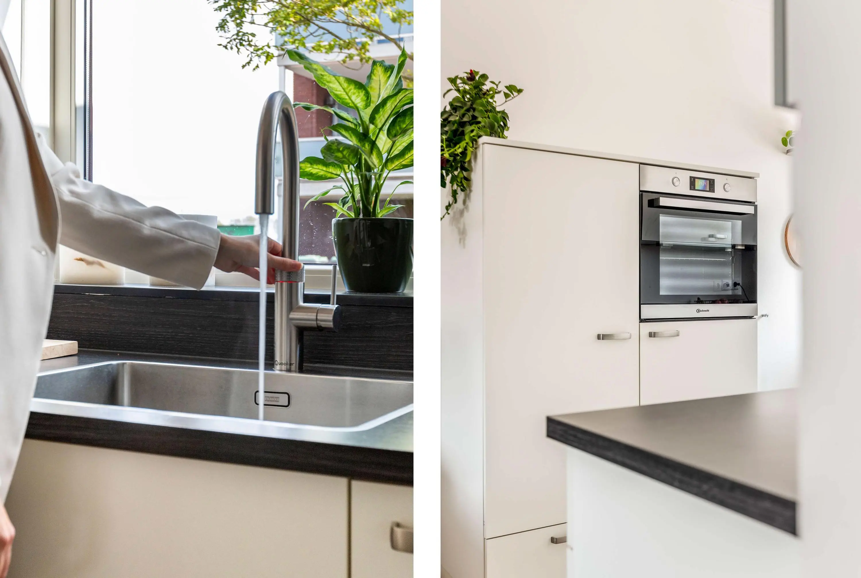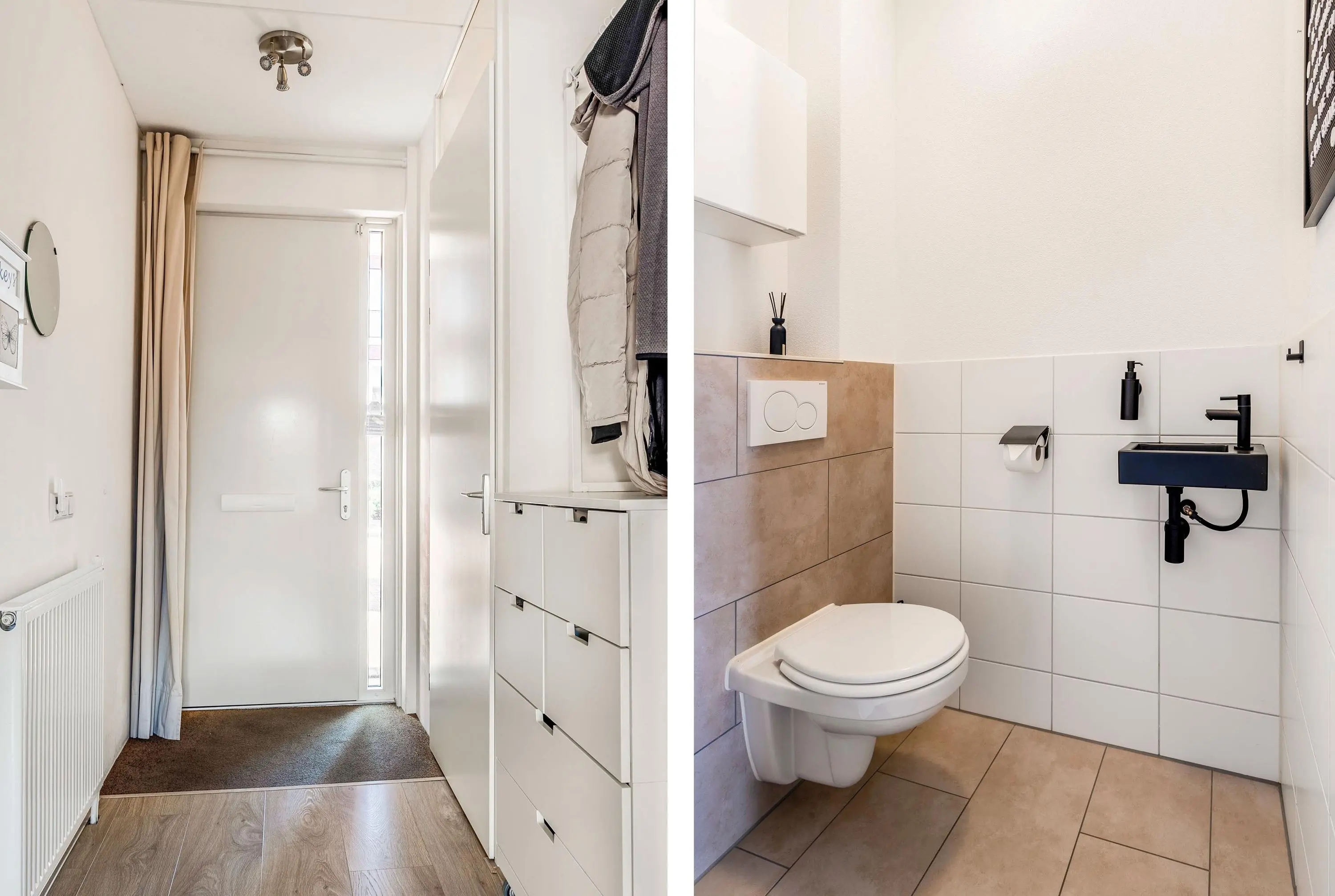 Je komt binnen in de hal met toegang tot het toilet, de trapopgang en de woonkamer. De lichte woonkamer is tuingericht en aan de voorzijde bevindt zich de moderne open keuken. Deze is van alle gemakken voorzien: een inductiekookplaat, afzuigkap, vaatwasser, oven, koelkast, vriezer én een Quooker. Aan de achterzijde van de woonkamer hangt een airco, wat zorgt voor extra comfort tijdens warme zomerdagen maar ook voor verwarming bij koele dagen.