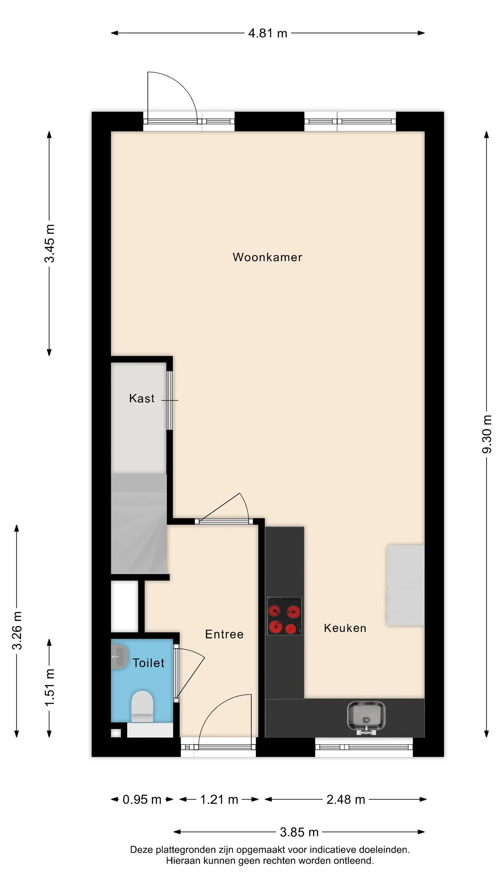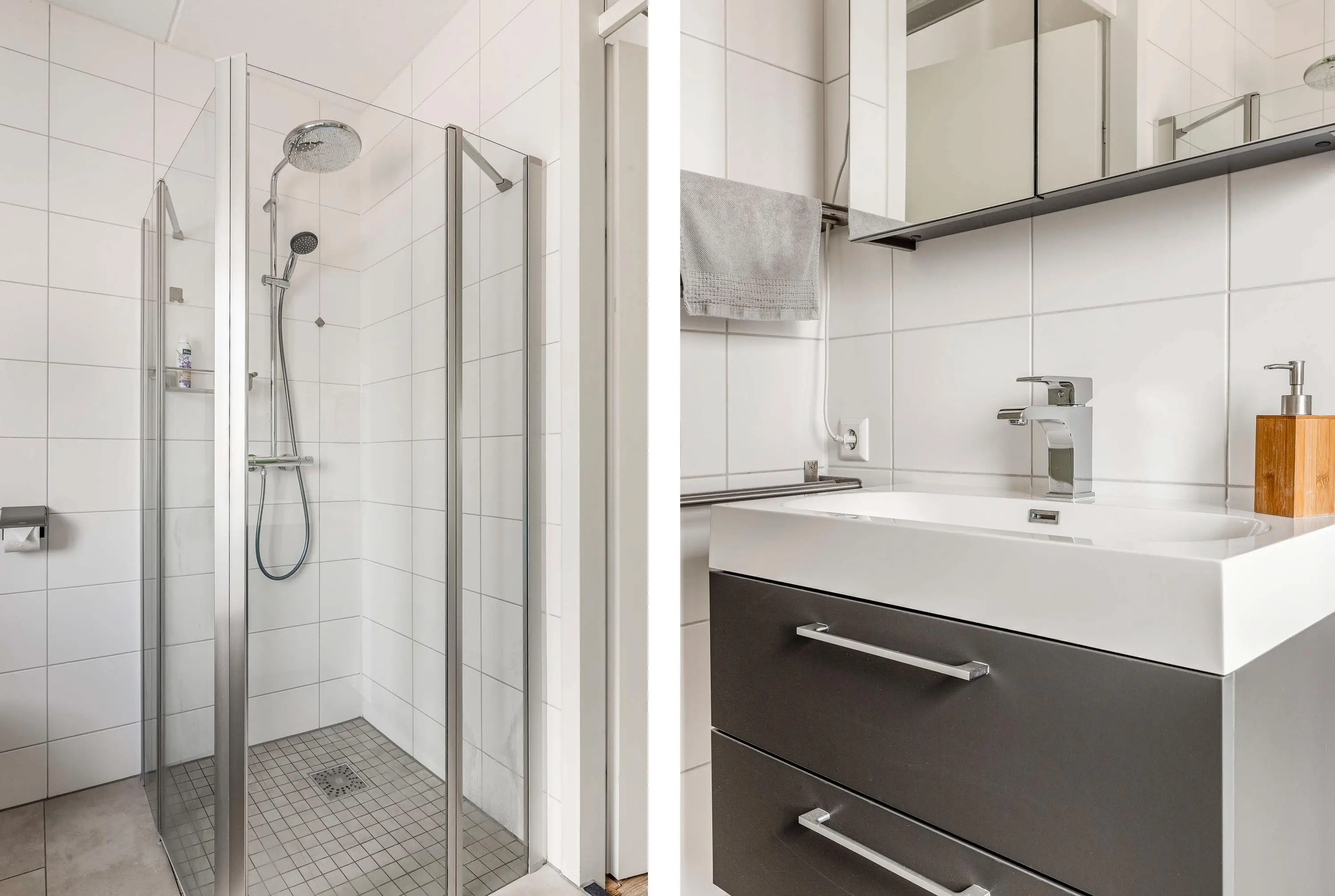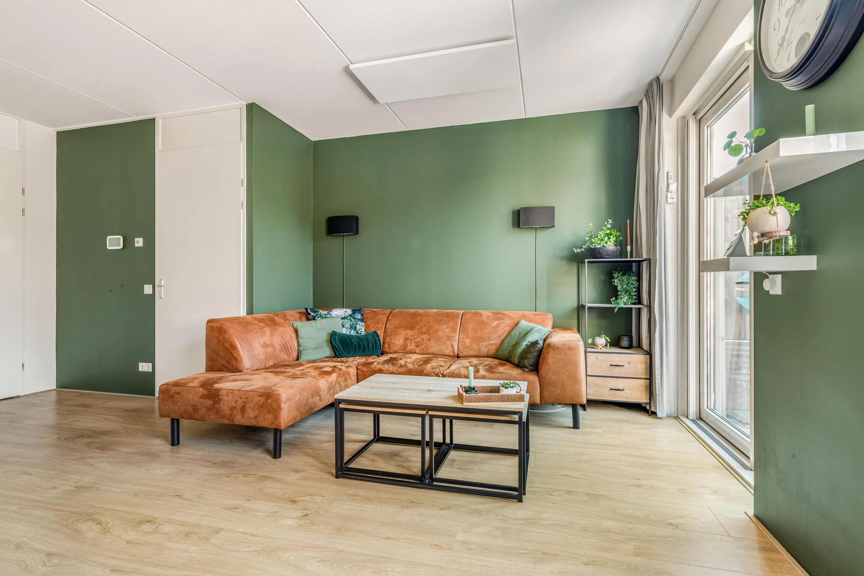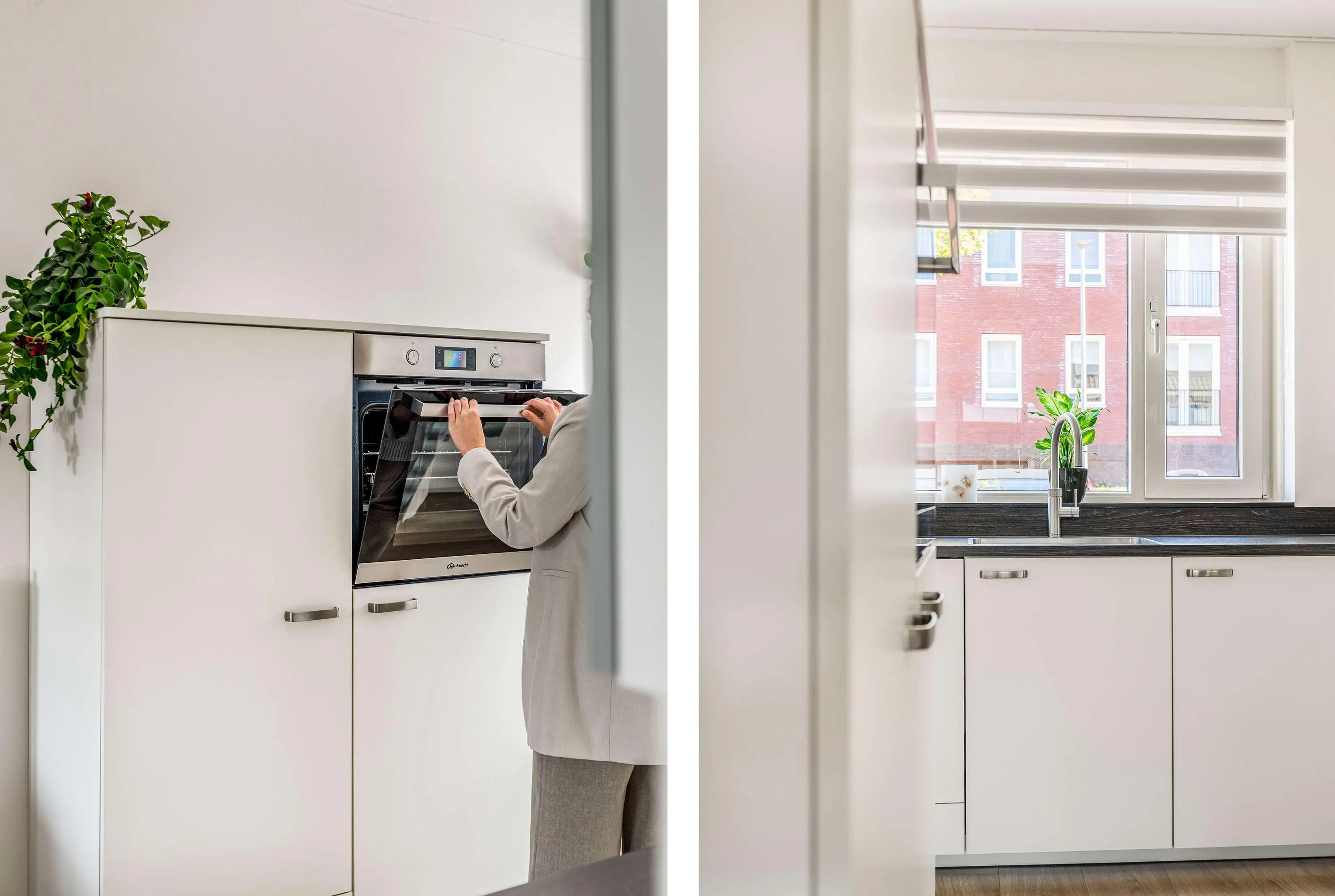 Je komt binnen in de hal met toegang tot het toilet, de trapopgang en de woonkamer. De lichte woonkamer is tuingericht en aan de voorzijde bevindt zich de moderne open keuken. Deze is van alle gemakken voorzien: een inductiekookplaat, afzuigkap, vaatwasser, oven, koelkast, vriezer én een Quooker. Aan de achterzijde van de woonkamer hangt een airco, wat zorgt voor extra comfort tijdens warme zomerdagen maar ook voor verwarming bij koele dagen.