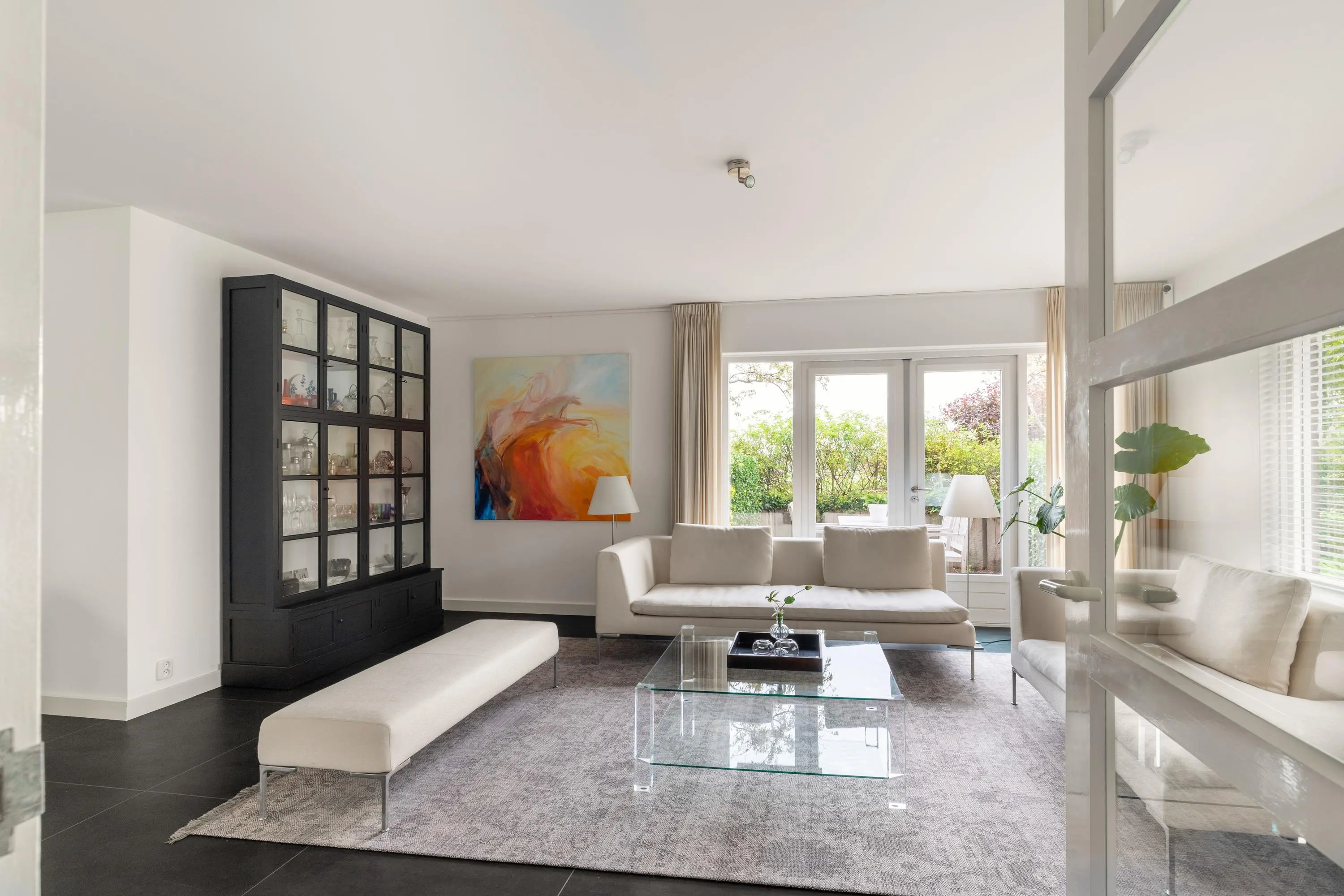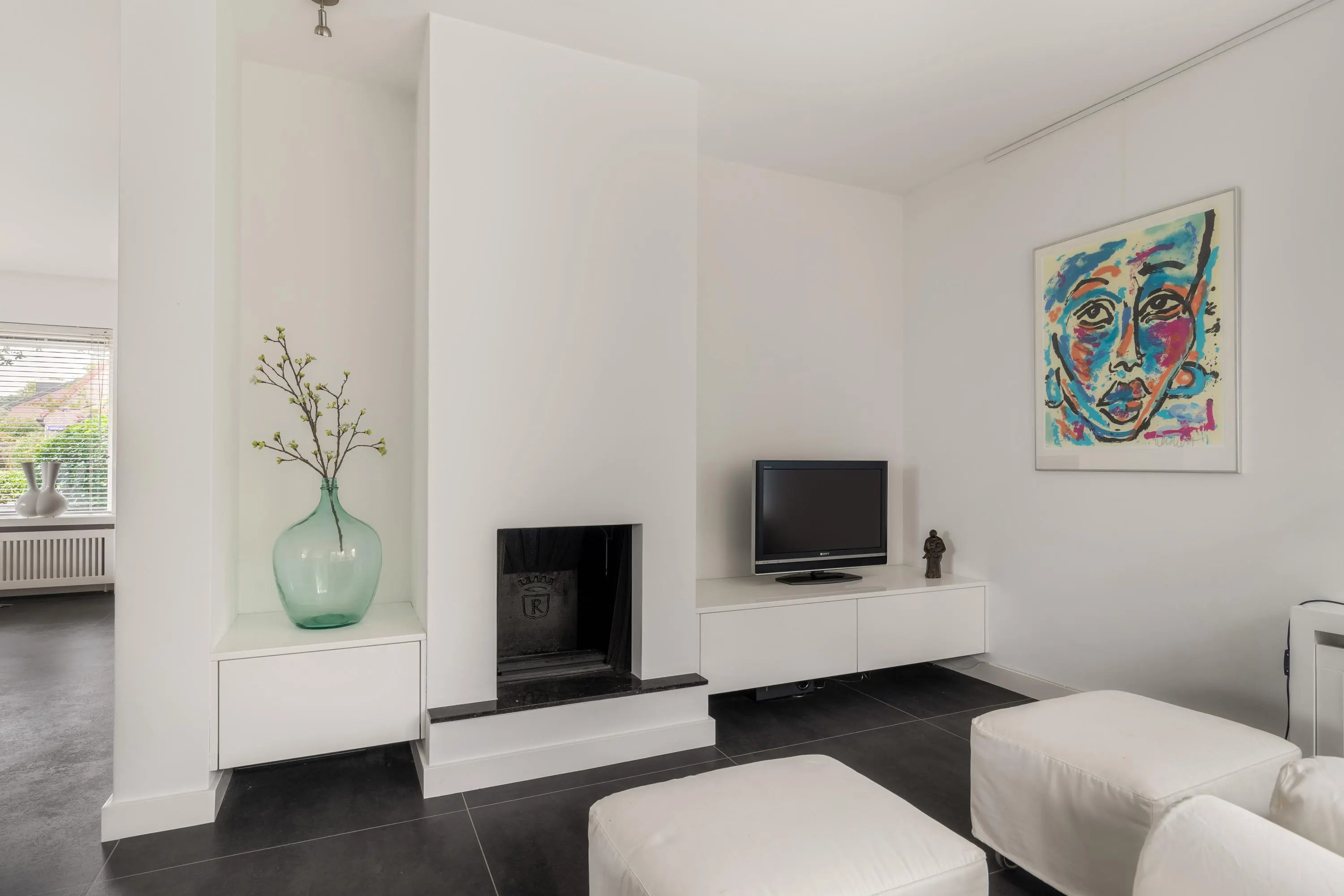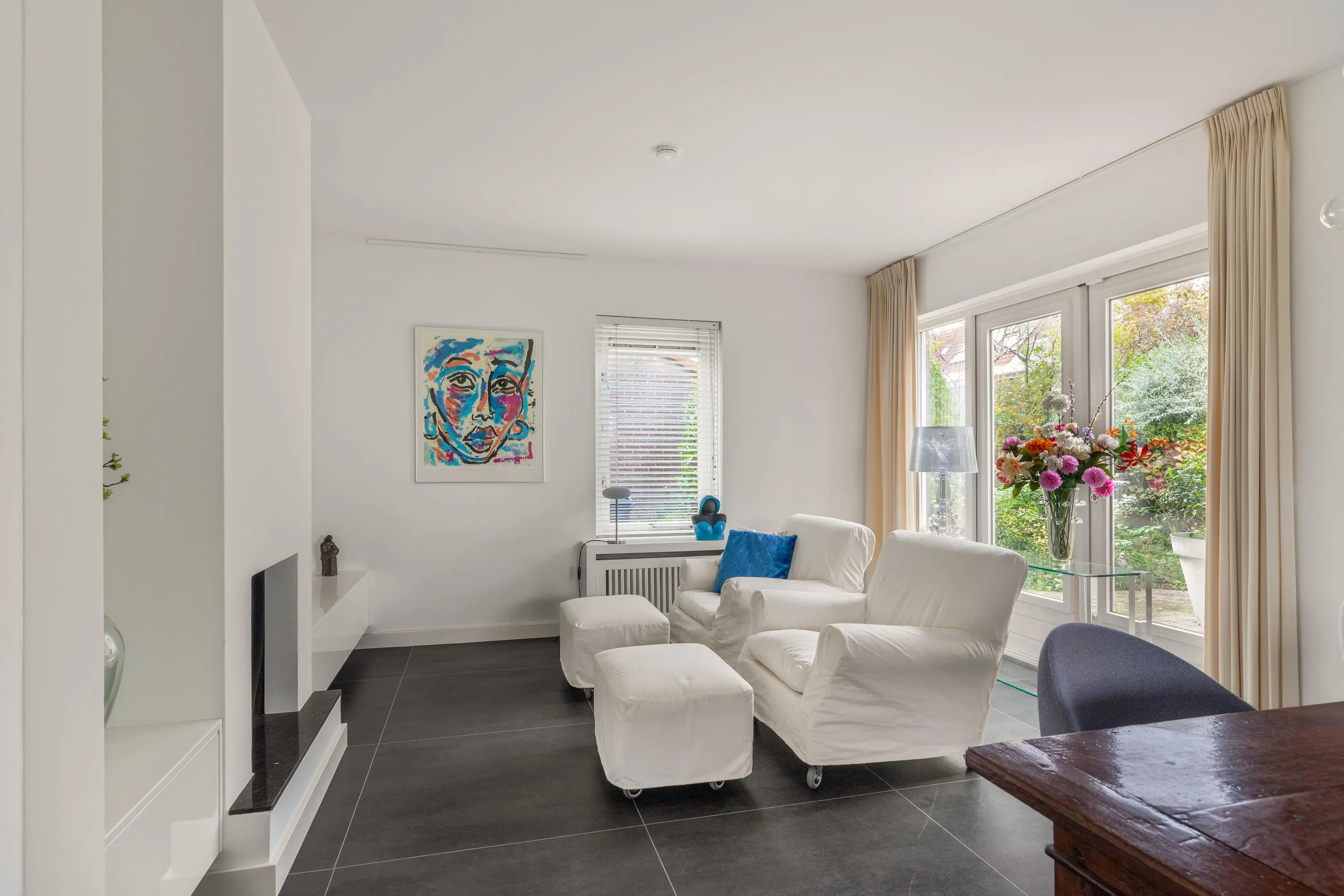 Via de voordeur stap je binnen in een ruime hal met toegang tot het toilet, de trapopgang, de woonkamer en de inpandige garage. De L-vormige woonkamer is bijzonder licht dankzij de vele raampartijen. Over de hele benedenverdieping ligt comfortabele vloerverwarming, en aan de achterzijde zorgt een gezellige haard voor extra sfeer in de wintermaanden.