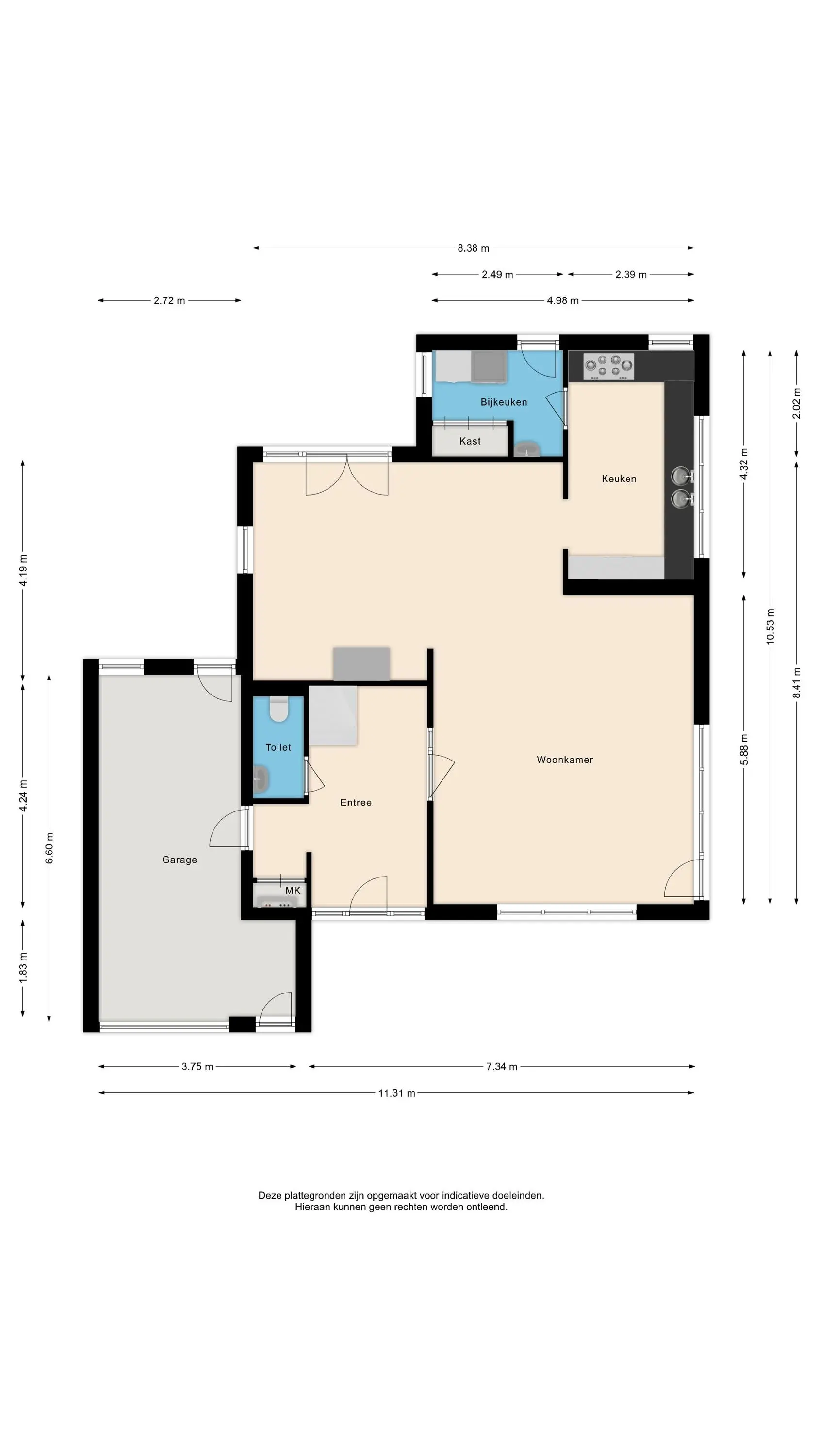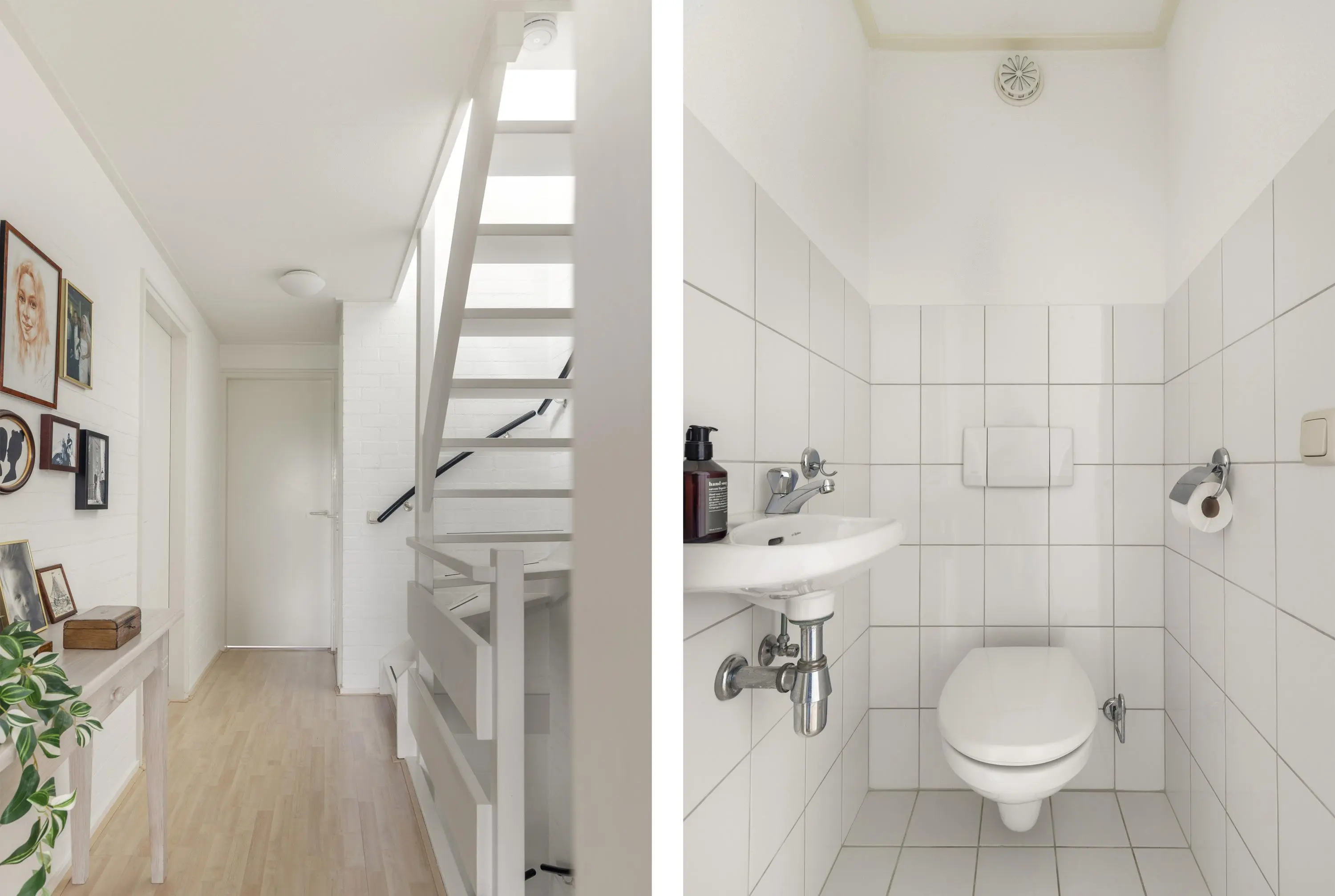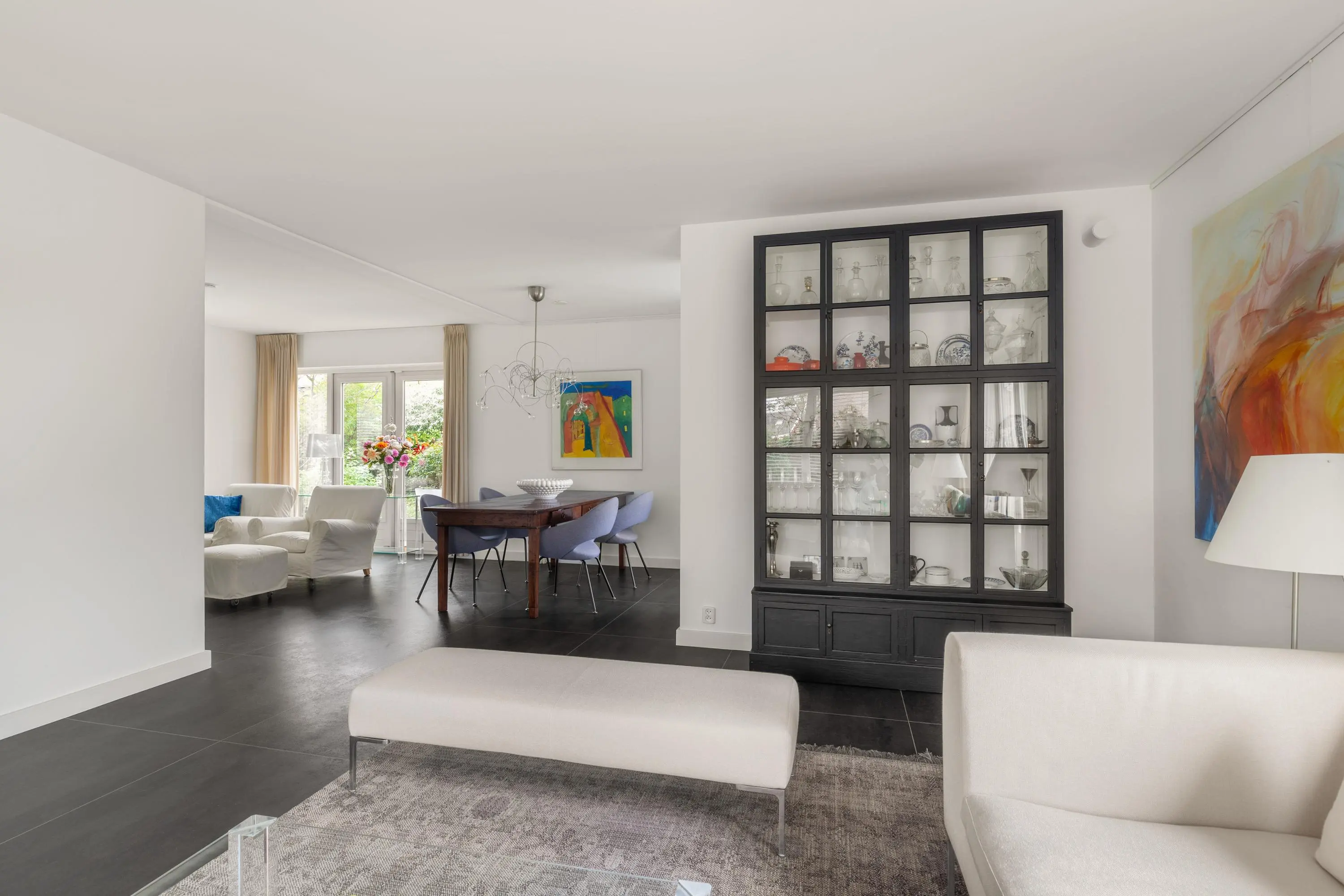 Via de voordeur stap je binnen in een ruime hal met toegang tot het toilet, de trapopgang, de woonkamer en de inpandige garage. De L-vormige woonkamer is bijzonder licht dankzij de vele raampartijen. Over de hele benedenverdieping ligt comfortabele vloerverwarming, en aan de achterzijde zorgt een gezellige haard voor extra sfeer in de wintermaanden.