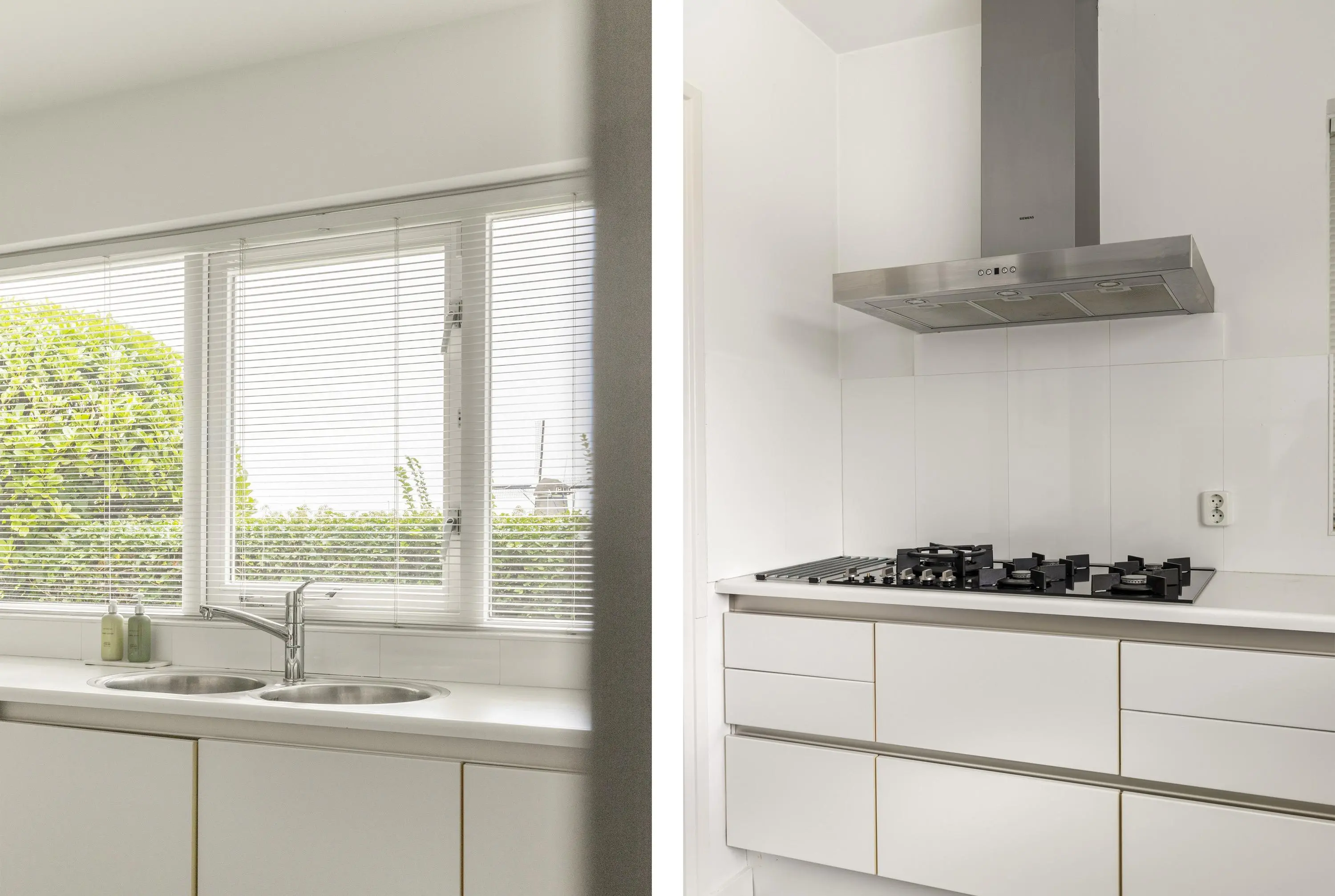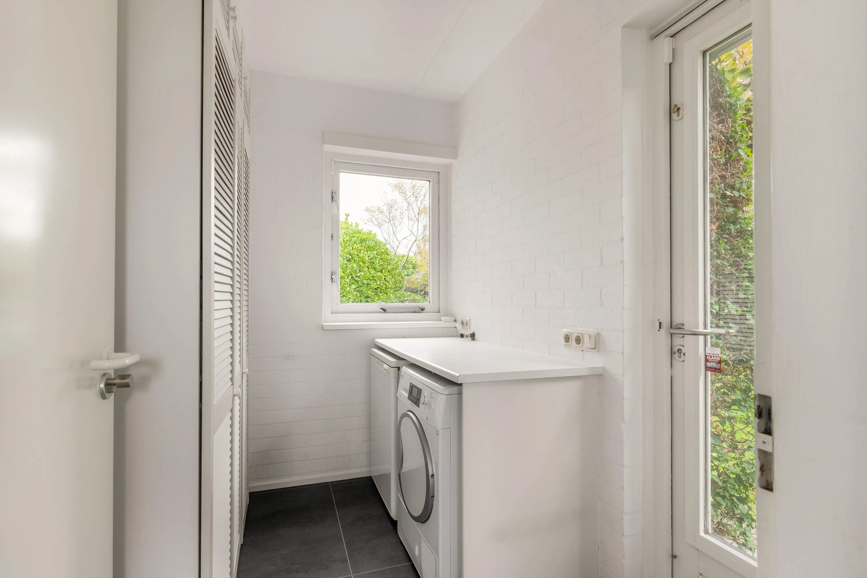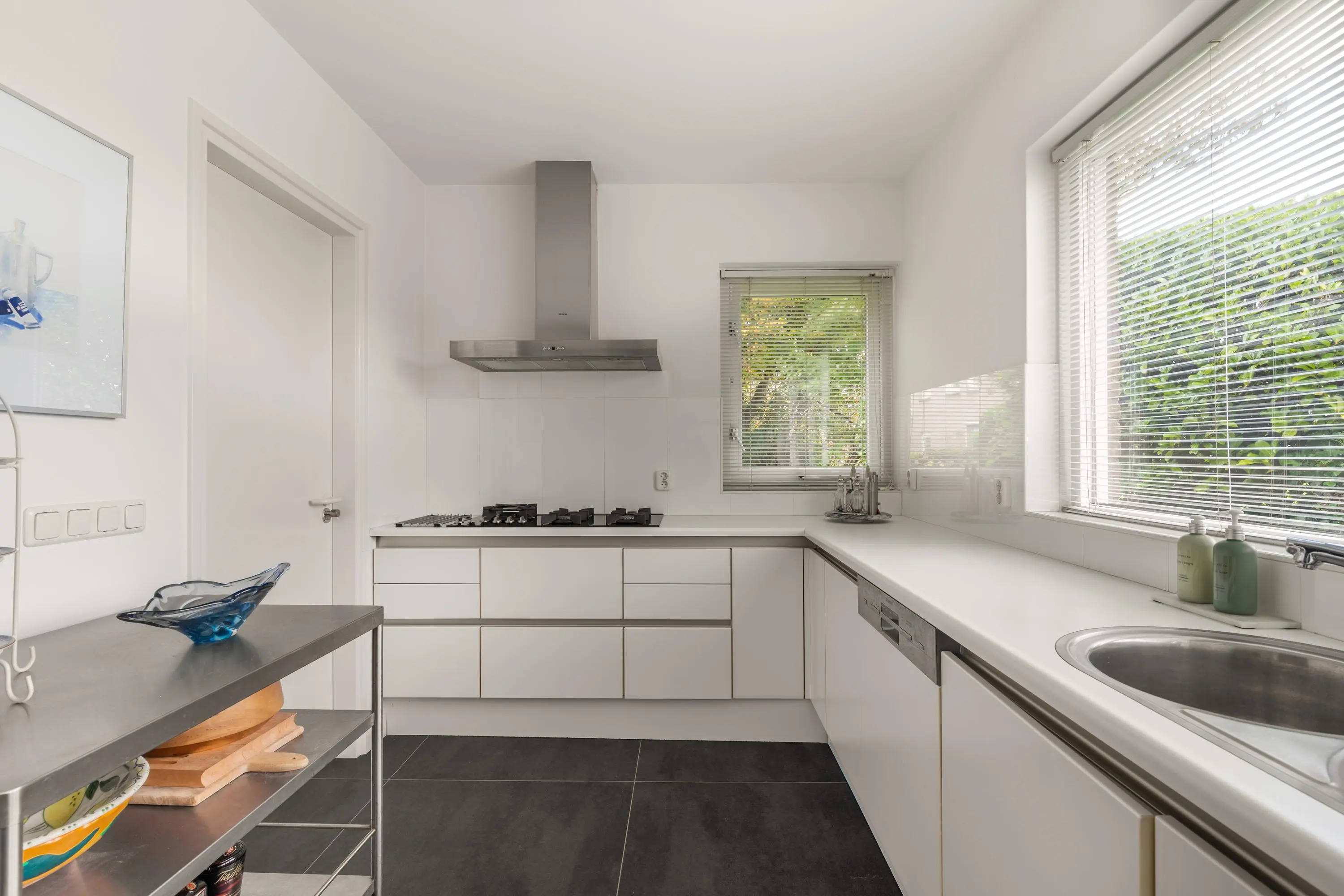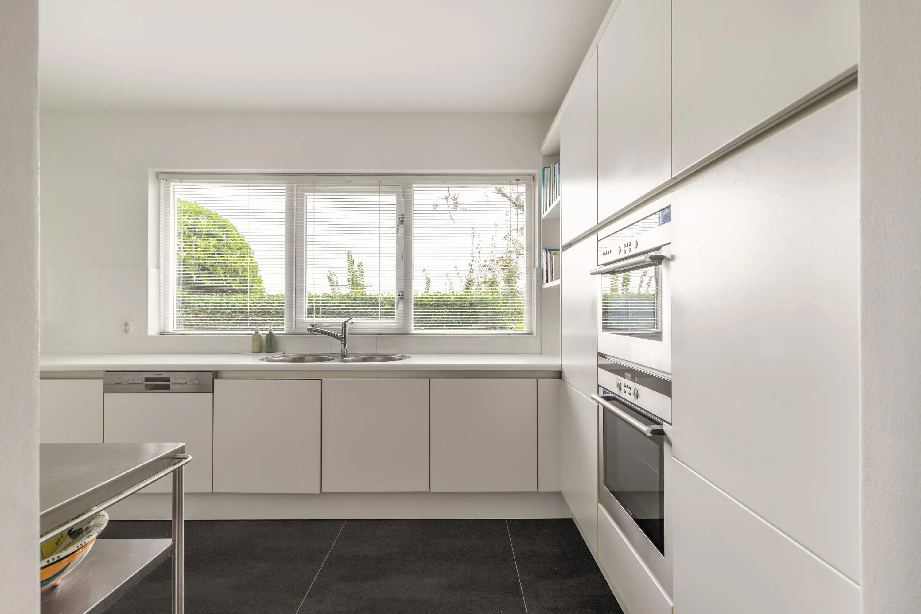 De keuken, eveneens aan de achterzijde gelegen, is van alle gemakken voorzien met inbouwapparatuur zoals een Siemens oven en combi-oven, een koelkast, vaatwasser en een 5-pits gaskookplaat met wokbrander. Aangrenzend vind je een praktische bijkeuken met aansluiting voor wasmachine en droger, en toegang tot de tuin.