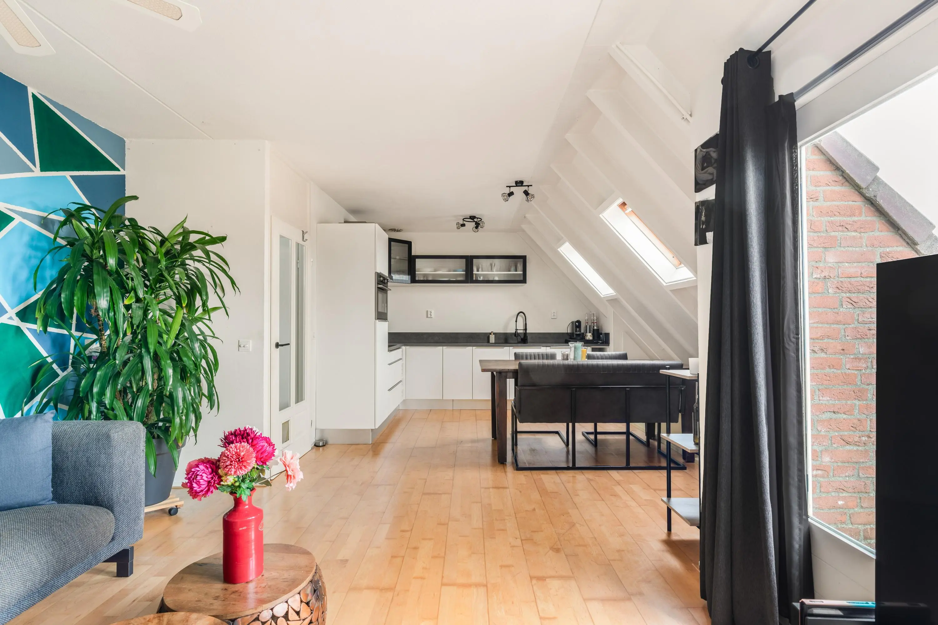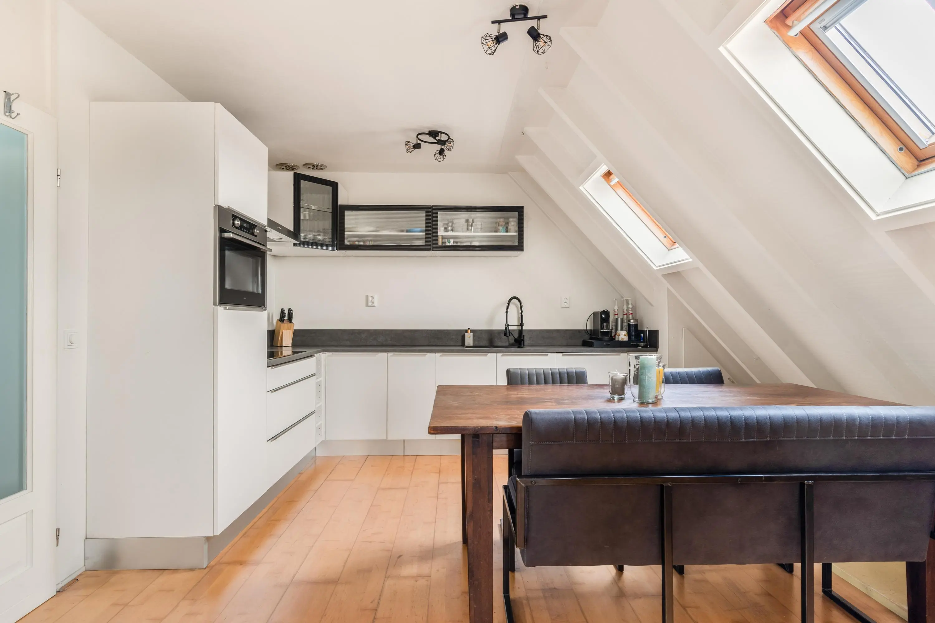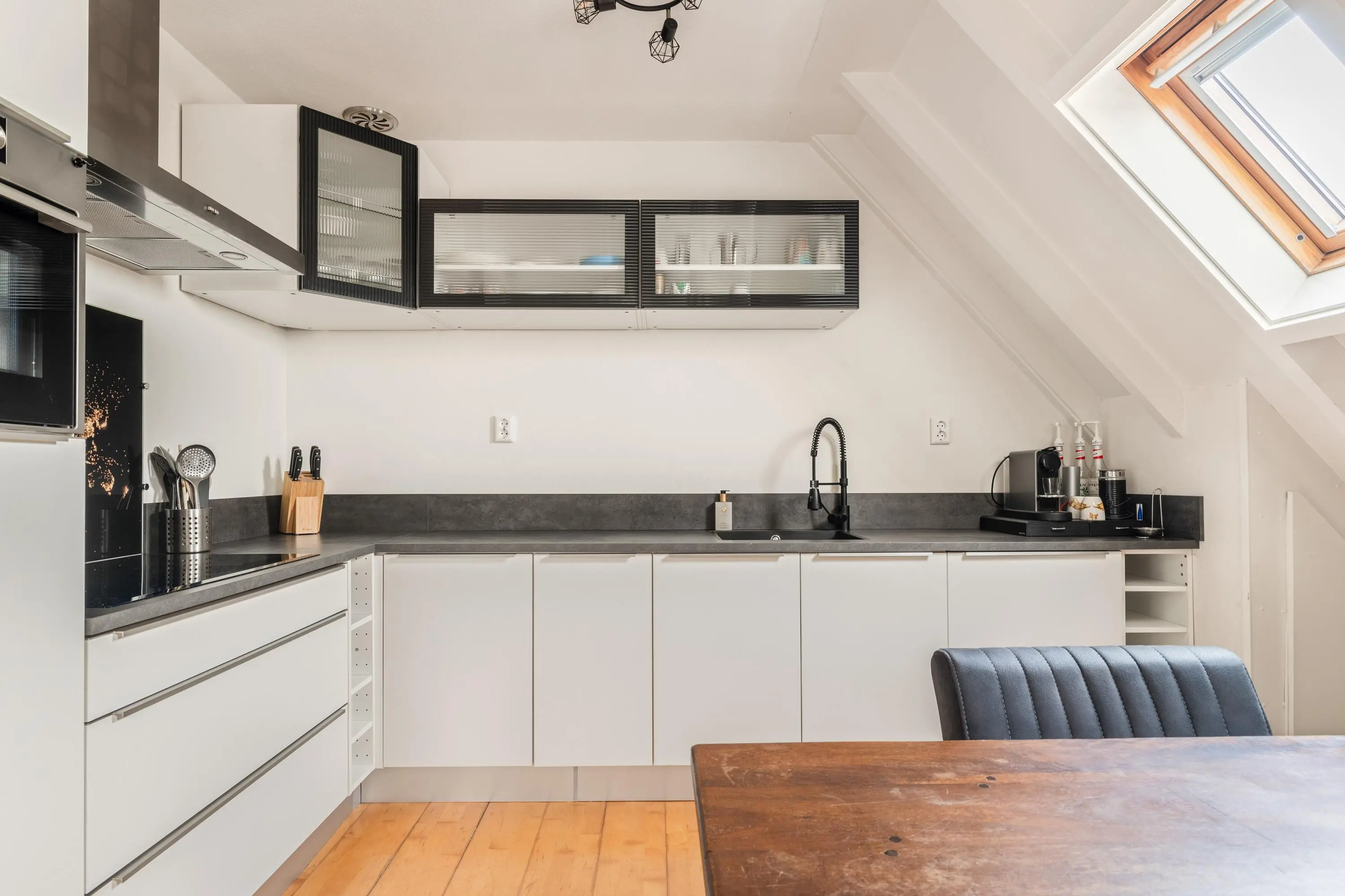 De woonkamer heeft een prettige, lichte indeling met een open keuken en toegang tot het balkon én de hoofdslaapkamer. De keuken is in 2023 nieuw geplaatst en is voorzien van een inductiekookplaat, afzuigkap, vaatwasser, koelkast en combi-oven.