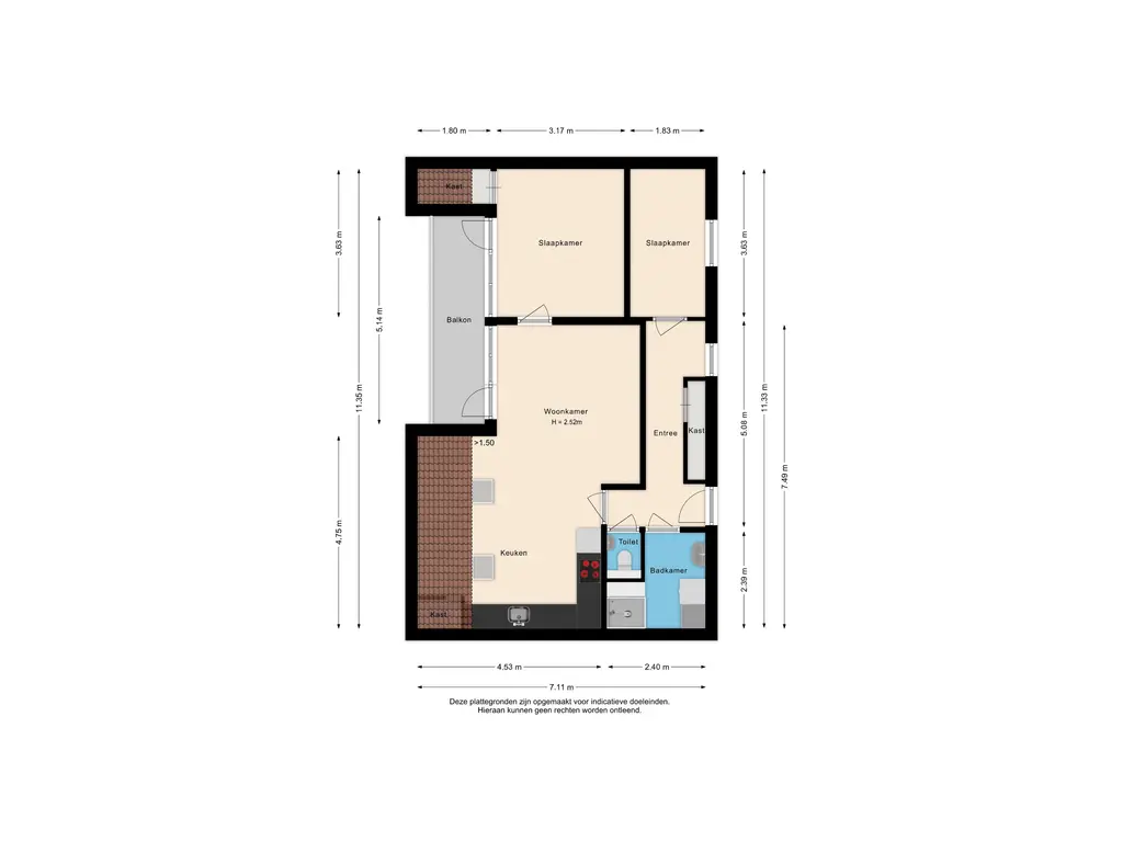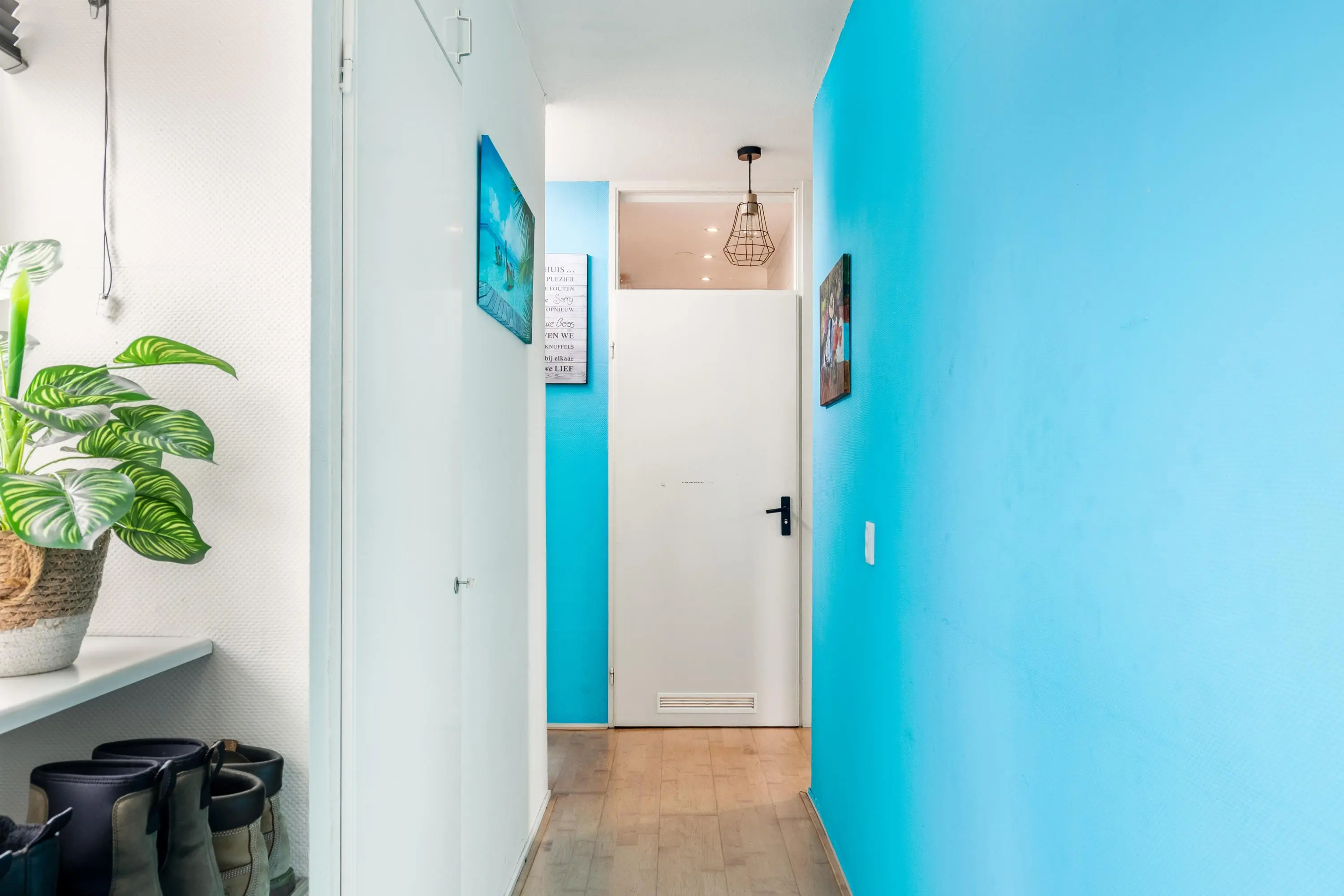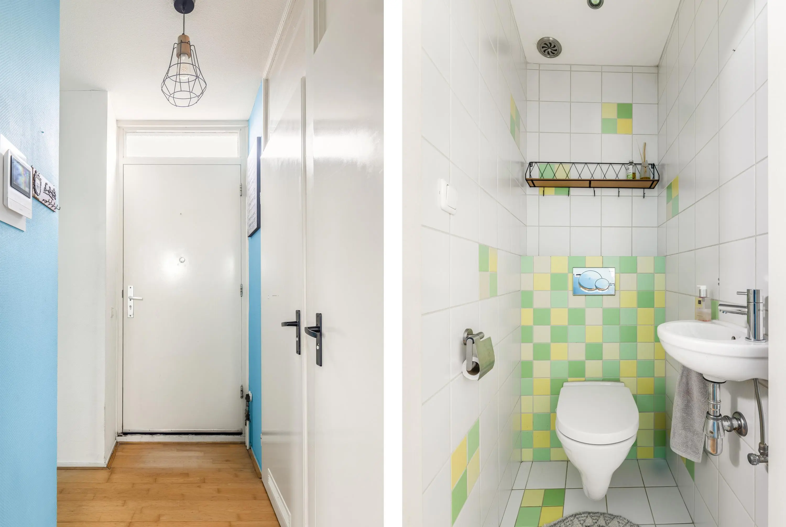 Vanaf de galerij stap je het appartement binnen. De meterkast bevindt zich aan de buitenzijde, bereikbaar vanaf de galerij. Vanuit de hal heb je toegang tot de badkamer, het separate toilet, de woonkamer en de slaapkamer aan de voorzijde.