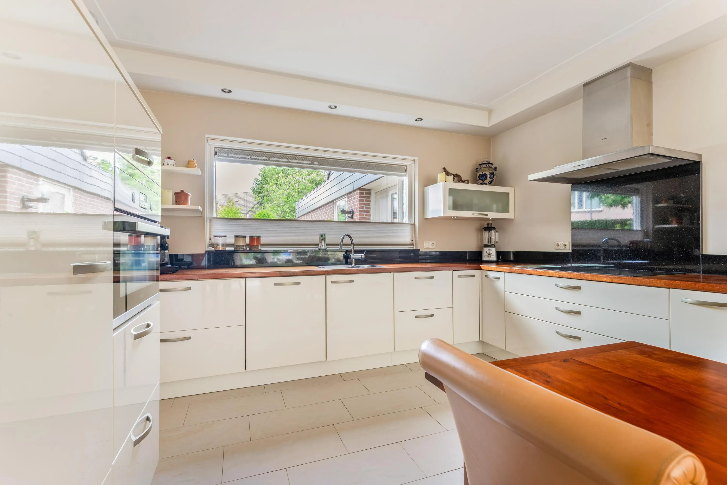 De open keuken voorzien van inbouwapparatuur is het kloppend hart van het huis: hier kook je terwijl je uitkijkt over de tuin en contact houdt met je gezelschap. Gezelligheid en functionaliteit komen hier perfect samen.
