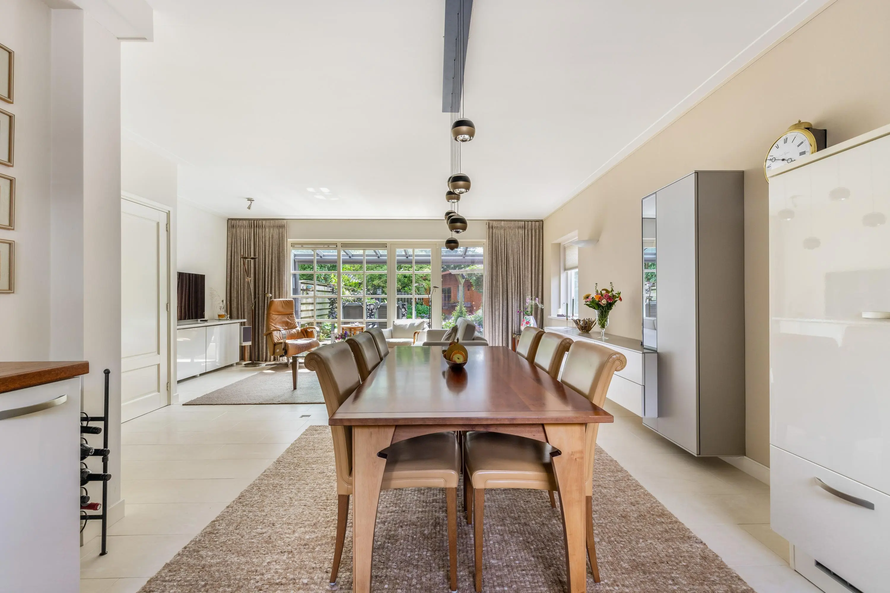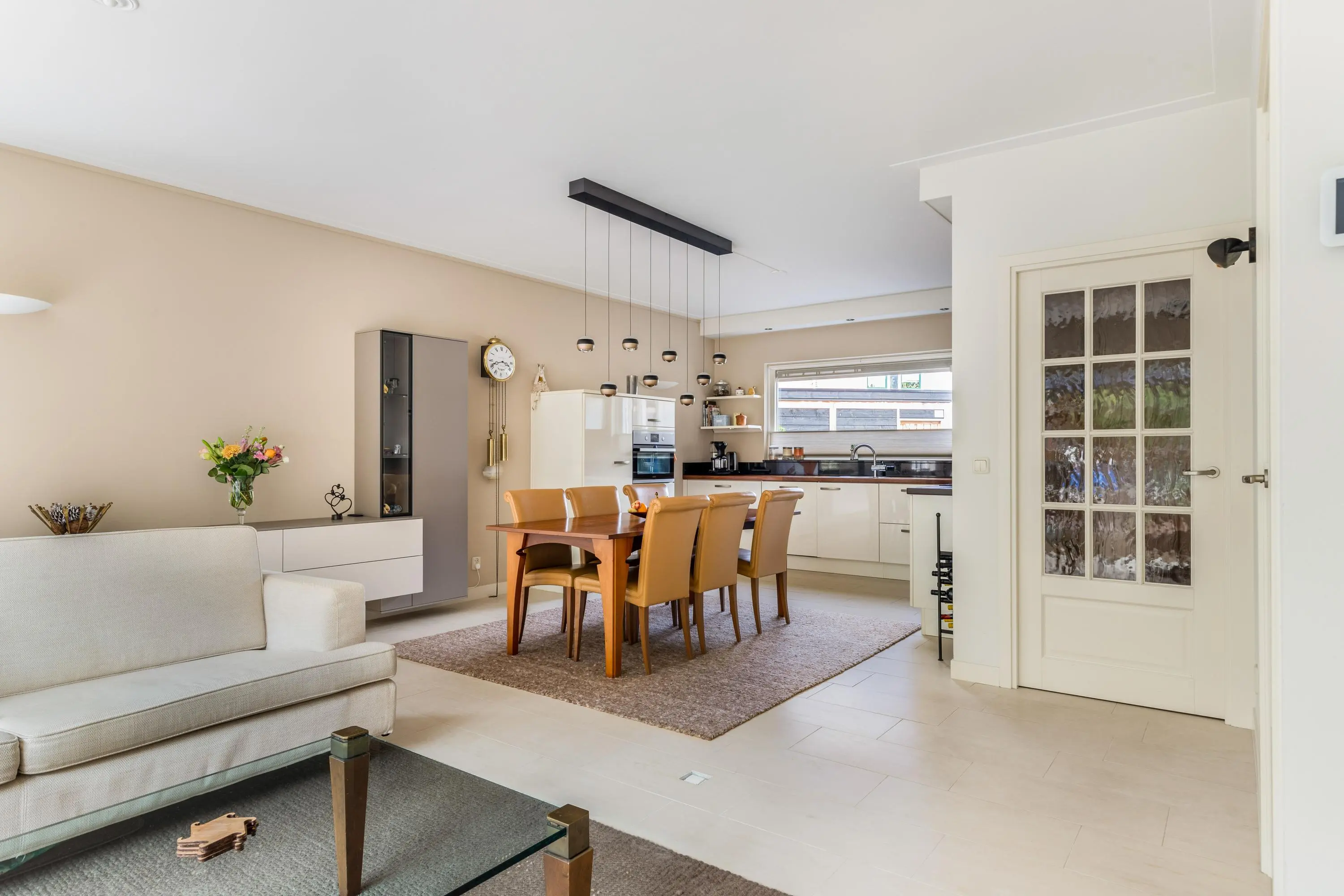Zodra je het tuinpad oploopt en de voordeur opent, word je meteen verrast door de ruimte en het licht dat je tegemoet stroomt. De woonkamer voelt royaal en open, met grote raampartijen die het zonlicht uitnodigen om elke hoek te verlichten. De HR++ beglazing in kunststof kozijnen zorgt niet alleen voor comfort, maar ook voor rust: binnen hoor je nauwelijks iets van buiten, behalve misschien het zachte getjilp van vogels op een zonnige ochtend. Op warme dagen hoor je in de verte het zachte gezoem van de sproei-installatie in de achtertuin.