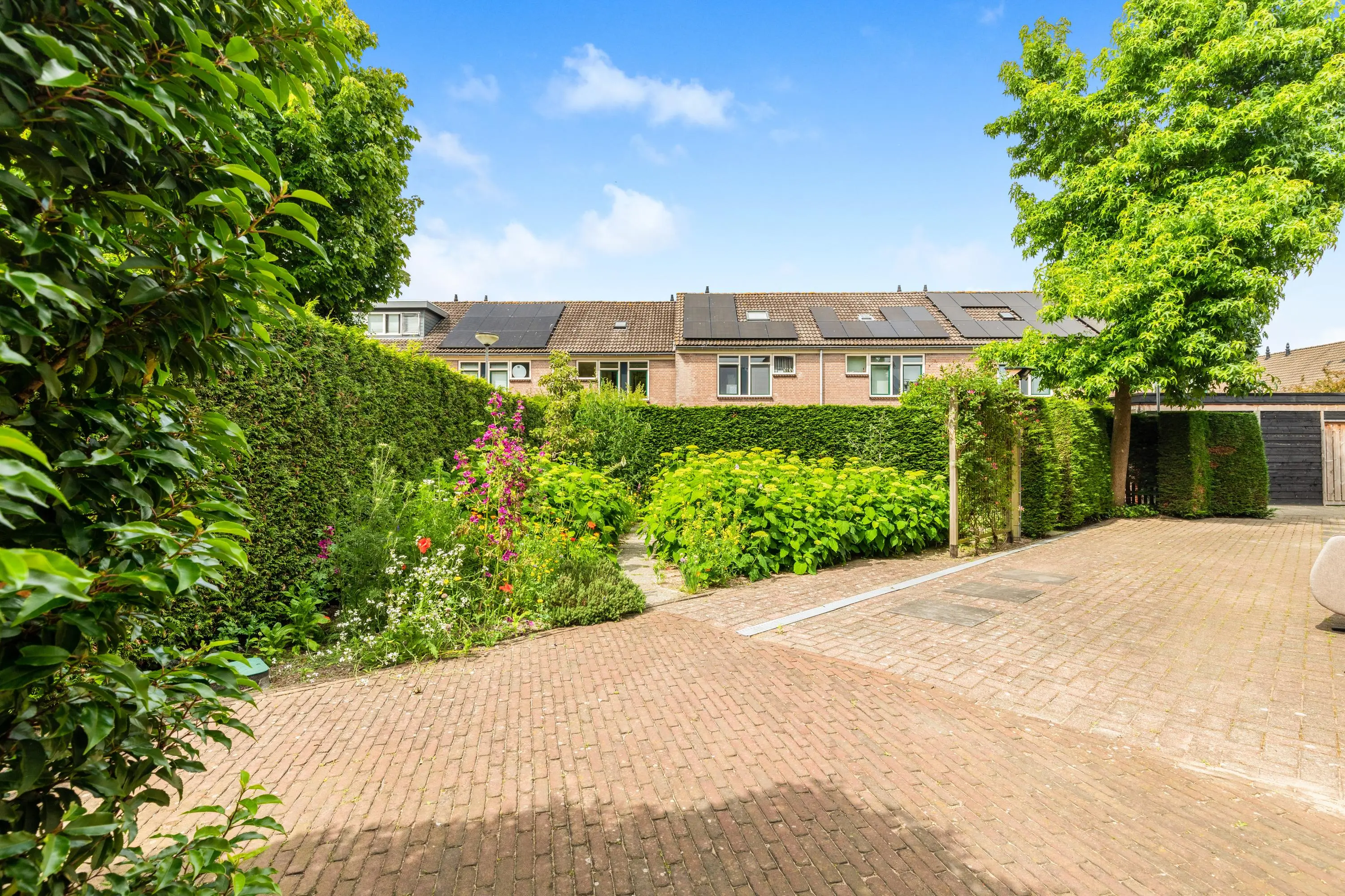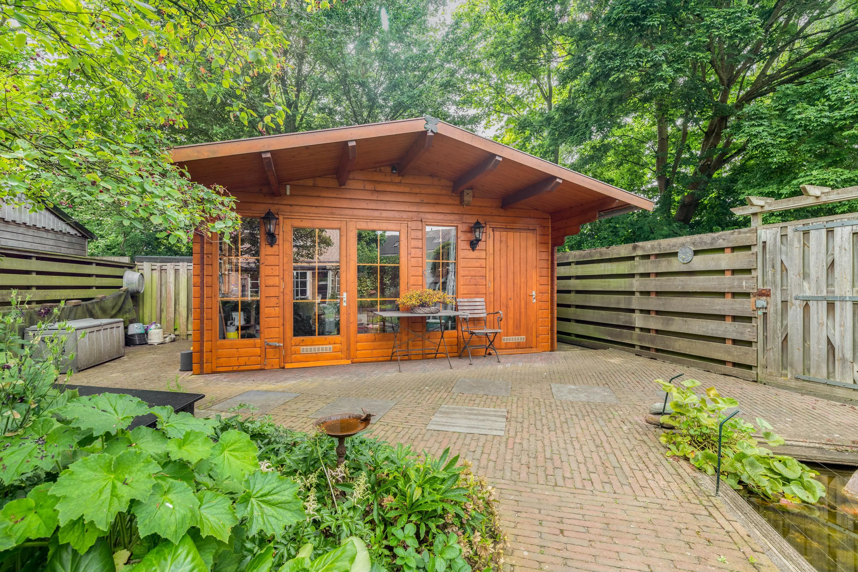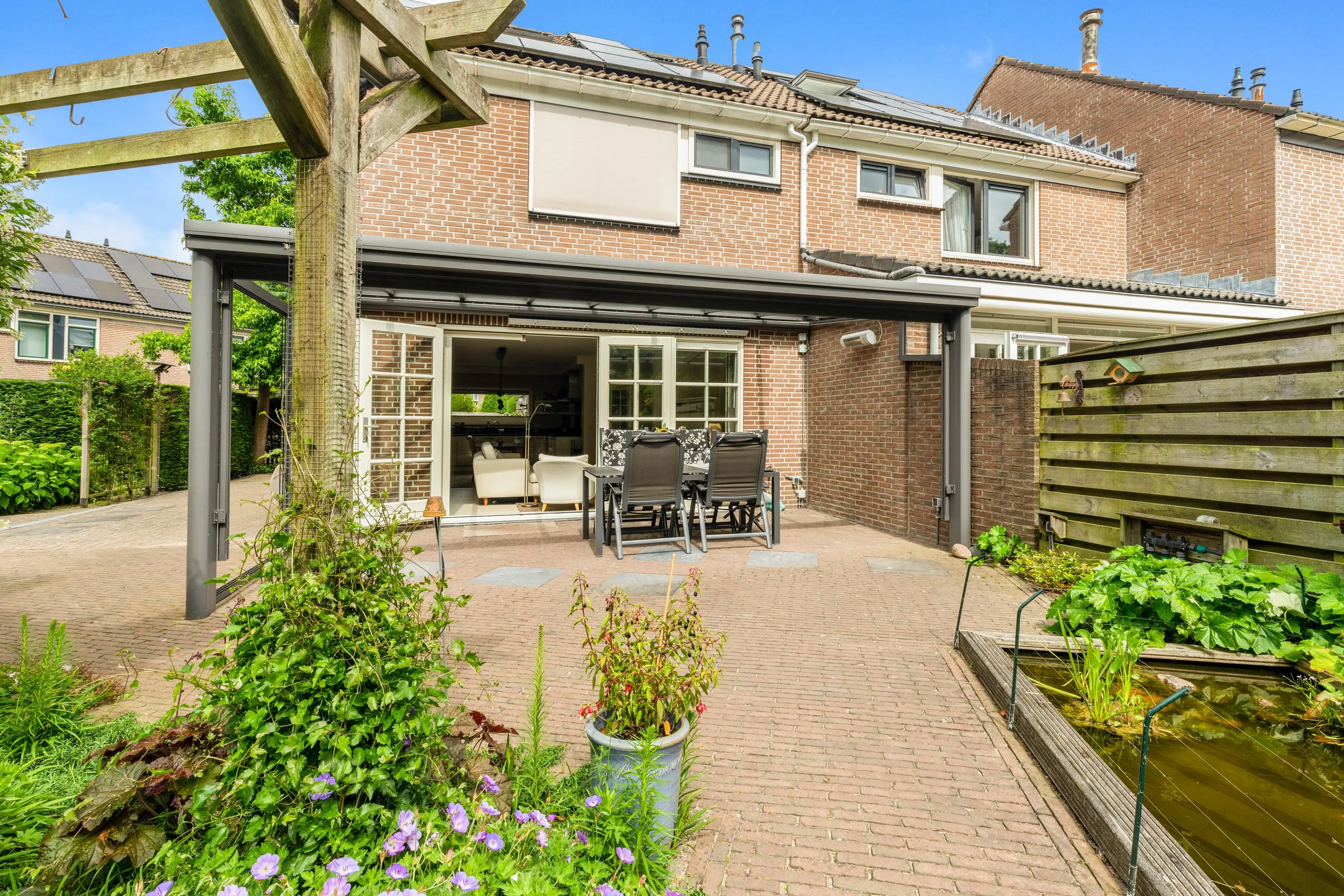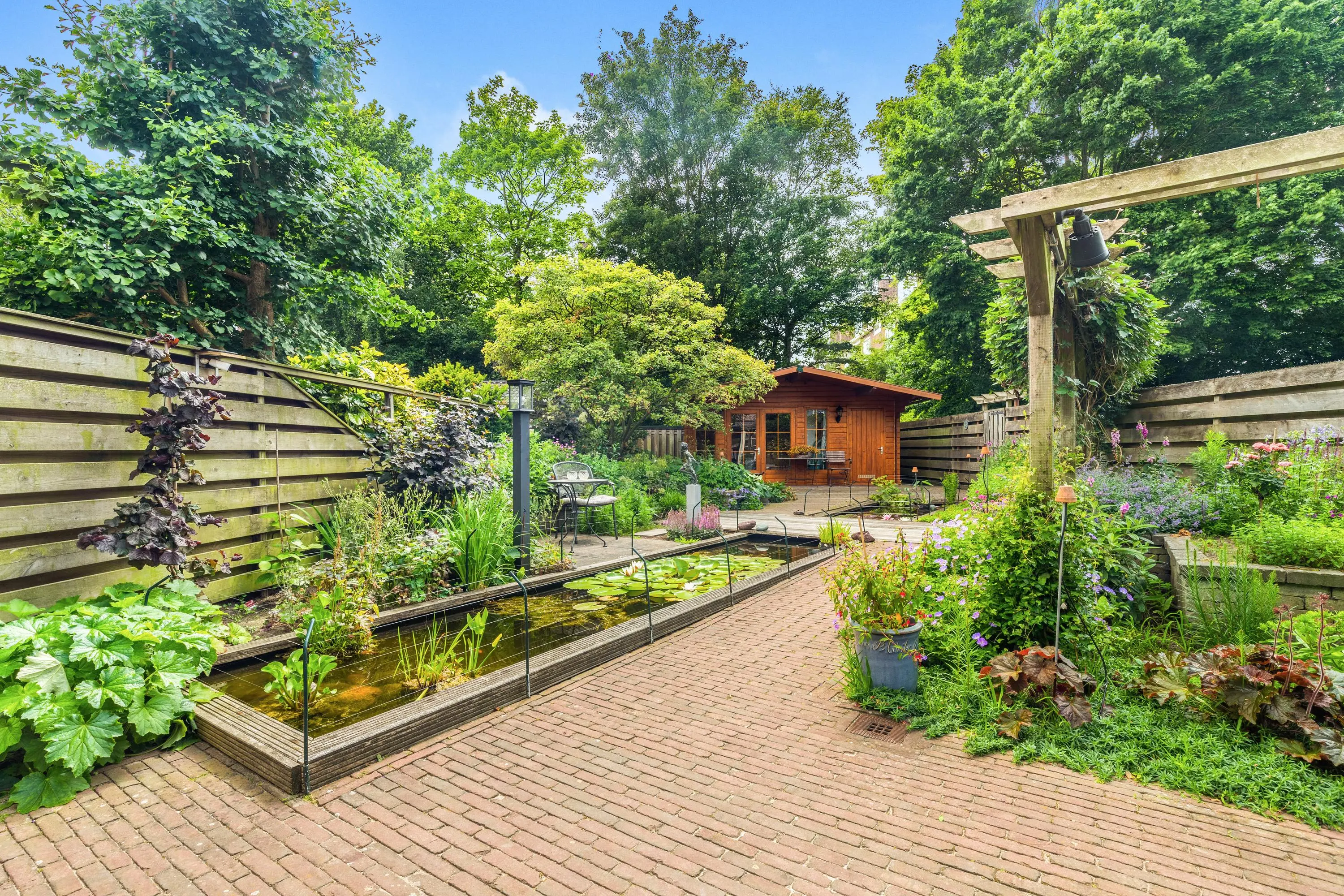 Via de openslaande deuren stap je in een bijzonder fraai aangelegde achtertuin, gelegen op het zonnige zuidwesten. Met een lengte van ruim 22 meter is het een oase van ruimte en rust. De tuin is met zorg ontworpen en voorzien van een sfeervolle vijver, die direct zorgt voor een gevoel van ontspanning en natuurlijk evenwicht. Onder de overkapping kun je tot in de late uurtjes genieten van het buitenleven, beschut tegen zon en regen. Helemaal achterin de tuin bevindt zich een tuinhuis – ideaal als berging of werkplek.