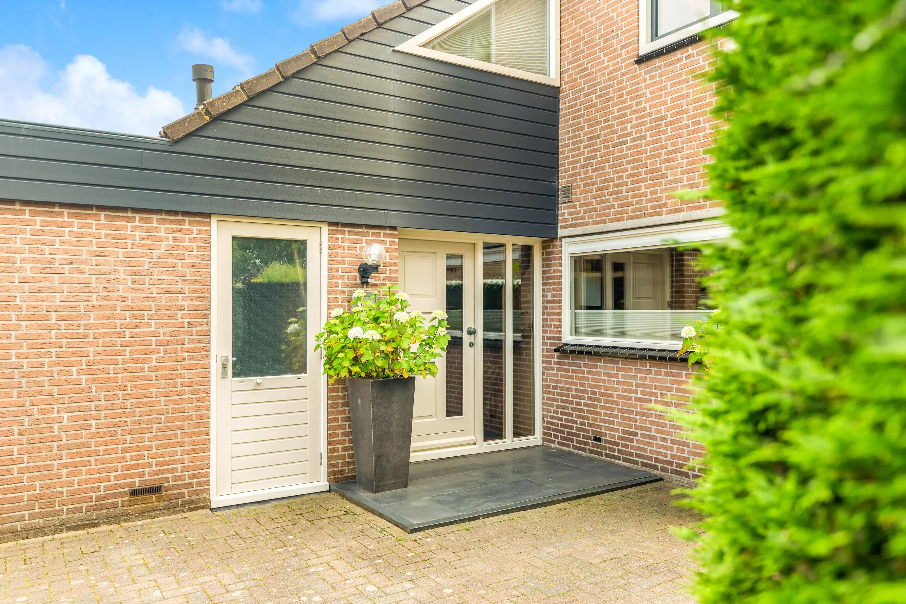 de ramen in de zijgevel voor en het royale erf.