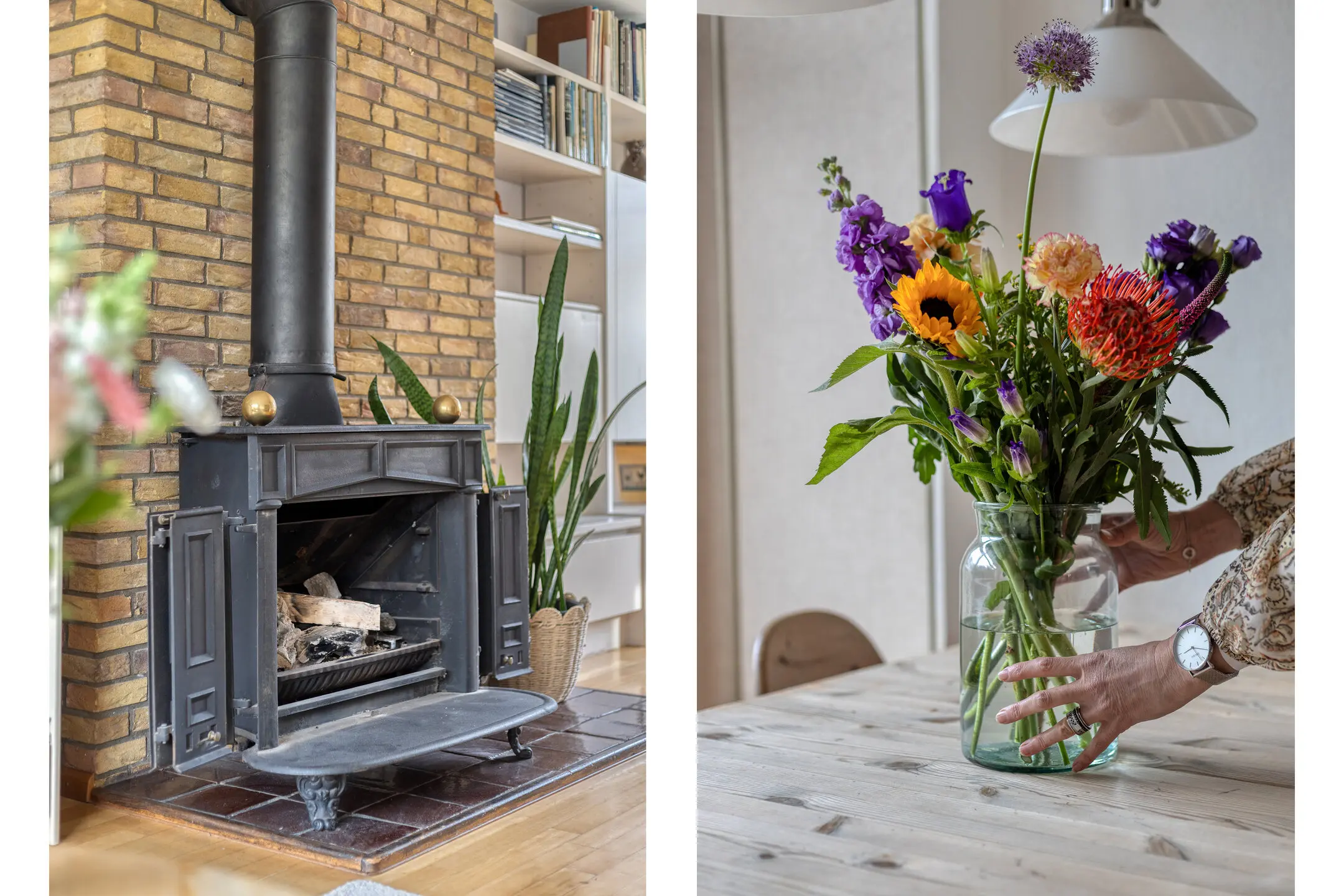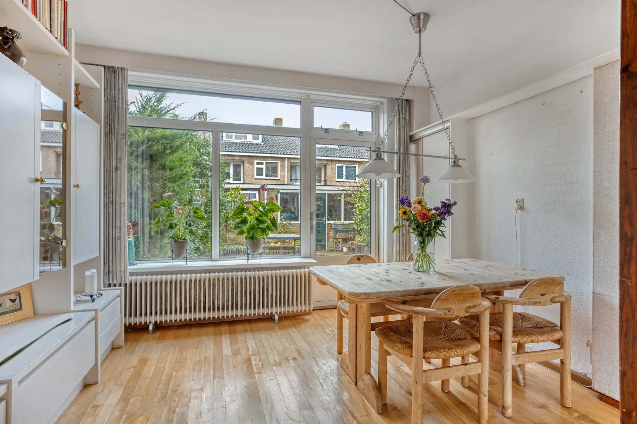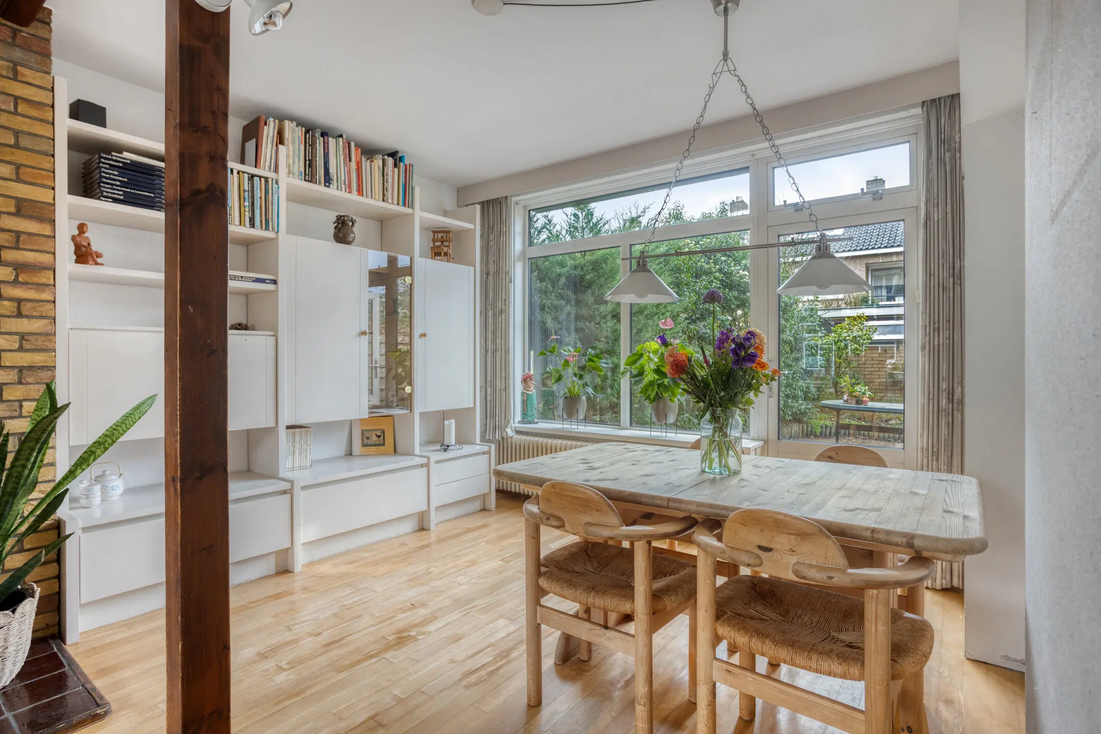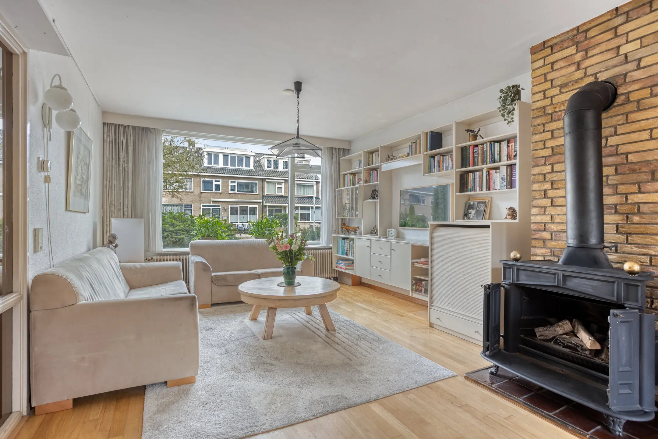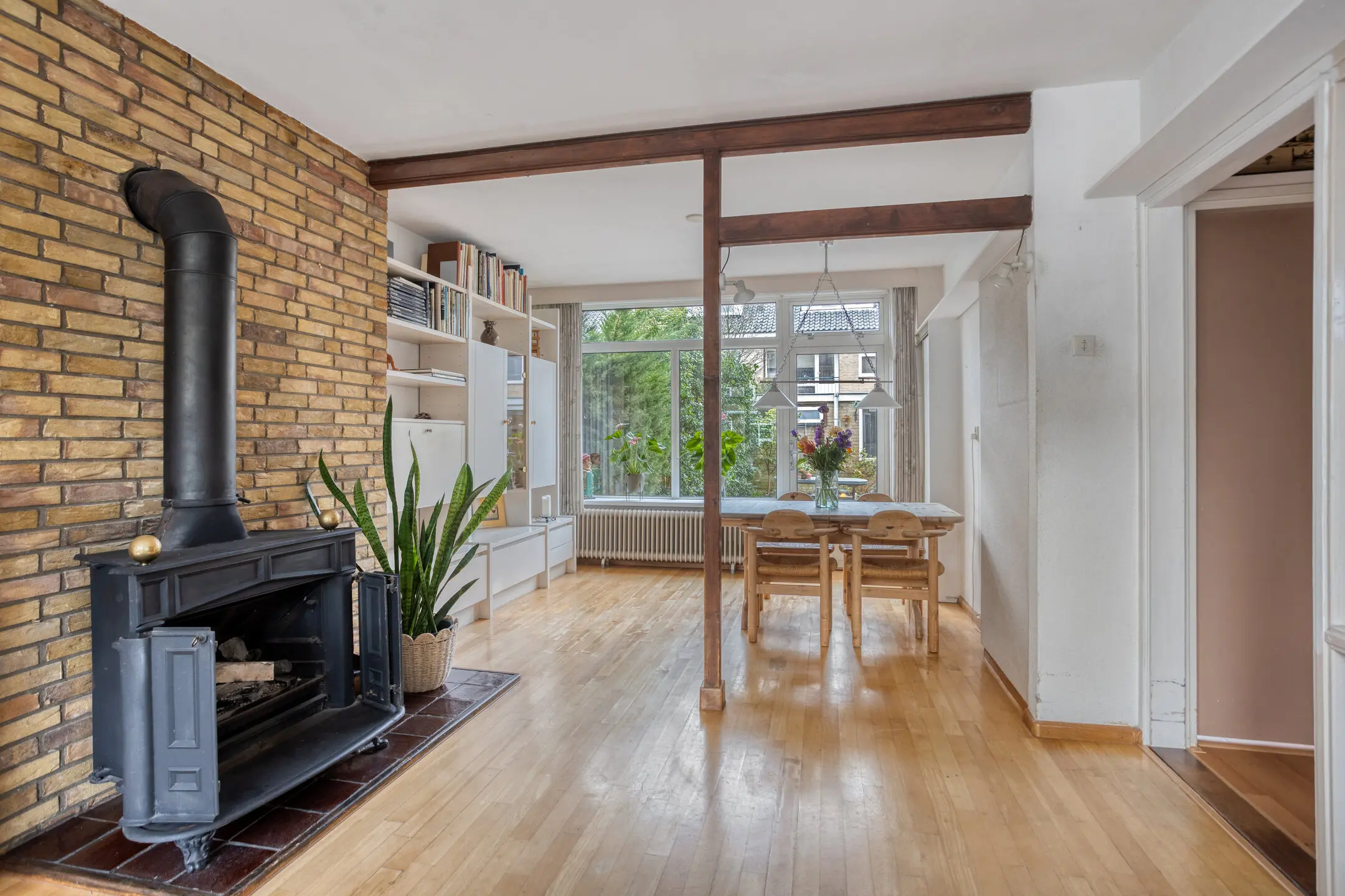 De grote ramen die veel daglicht binnenlaten, versterken de verbinding met de mooie groene omgeving. Aan de voorzijde van de woning is het zitgedeelte gerealiseerd. In het hart van de woonkamer staat een authentieke houtkachel en aan de achterzijde vind je het eetgedeelte met uitzicht op de achtertuin. De tuin bereik je vanuit de woonkamer en de keuken. De ligging van de zonnige tuin is op het westen en deze is voorzien van een stenen berging met elektra en er is een buitenkraan aanwezig. De tuin bereik je ook via een achterom, handig!