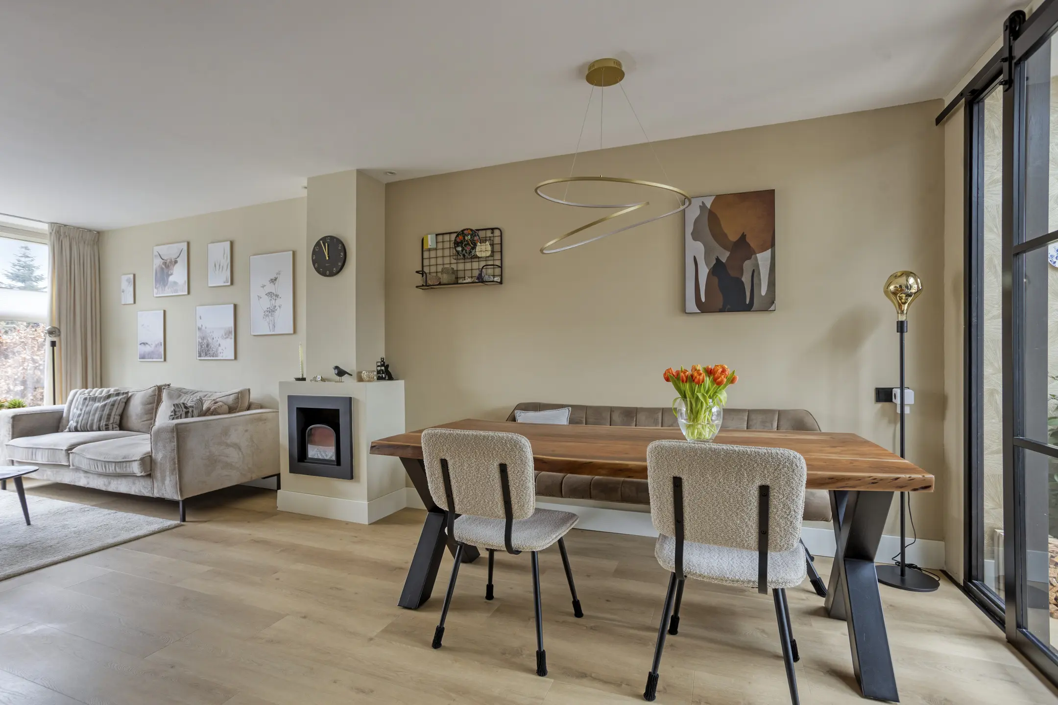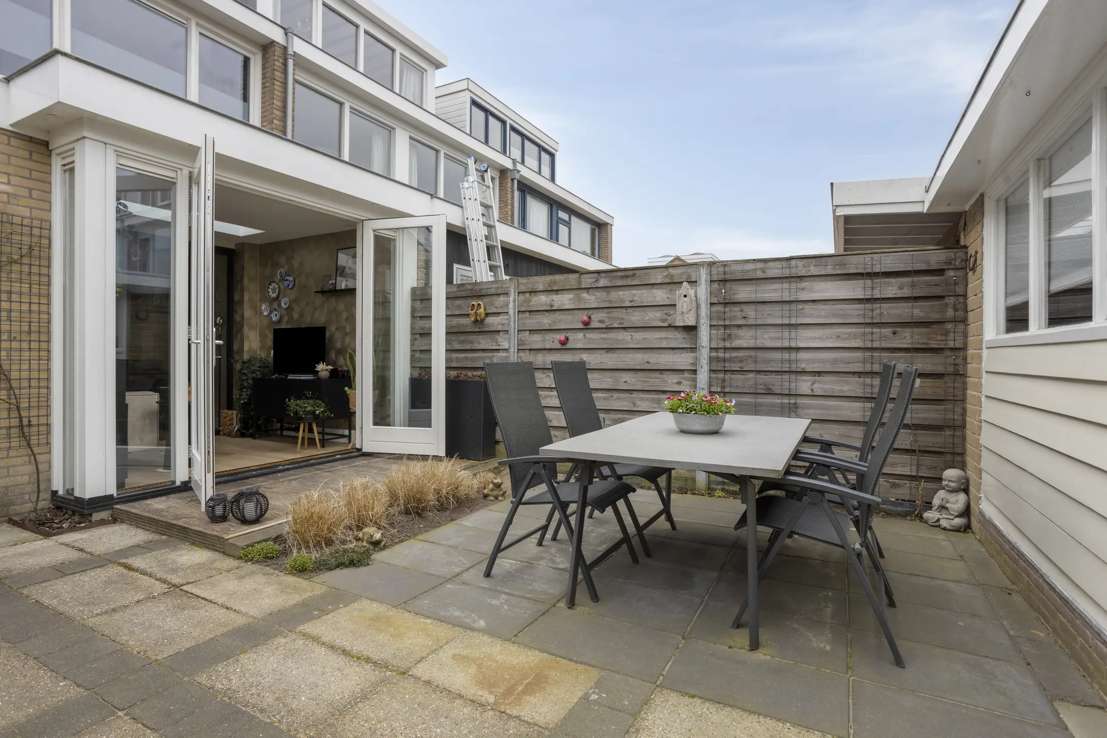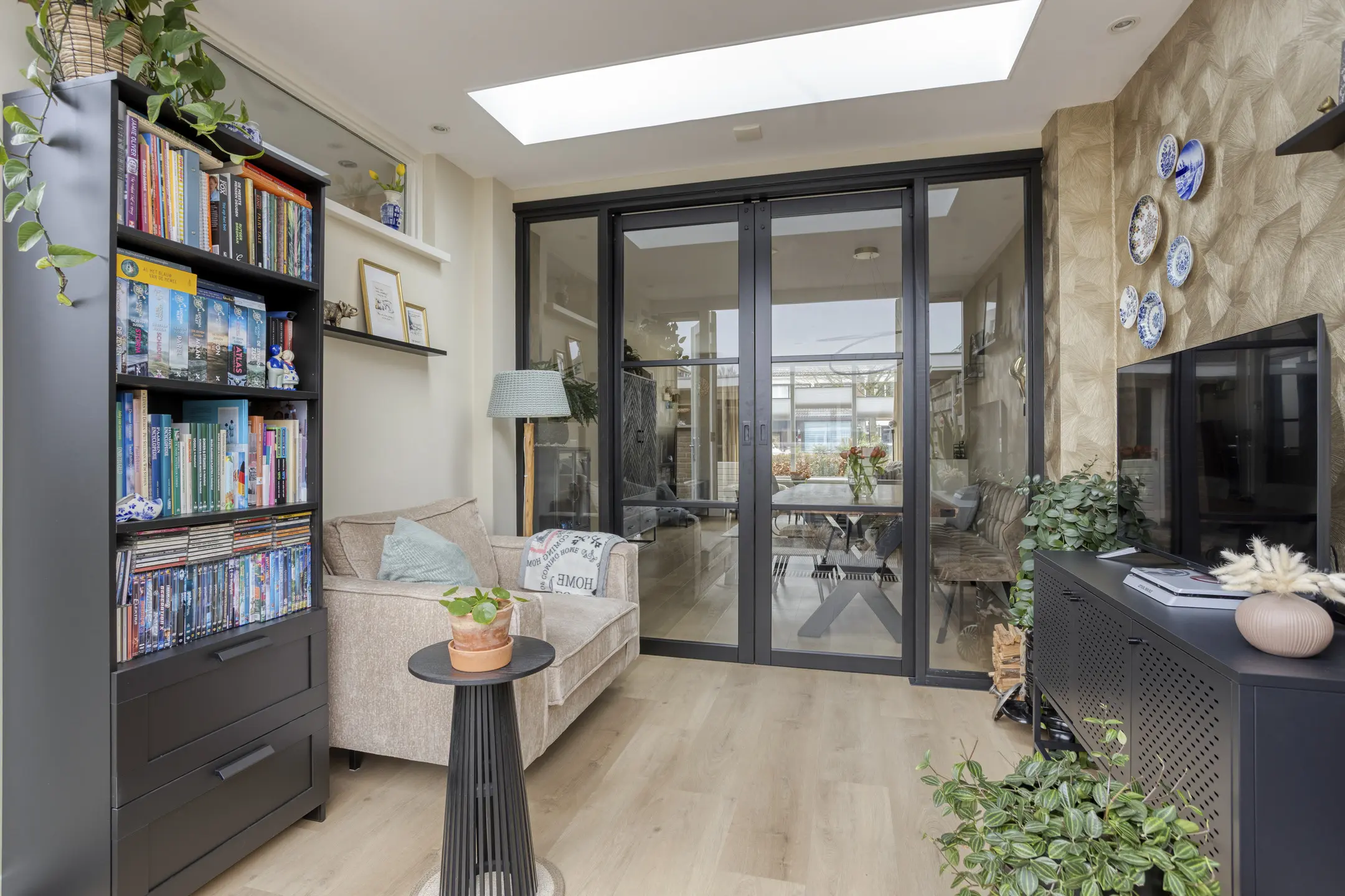De woonkamer is opvallend licht door de grote raampartijen en biedt een vrij uitzicht aan zowel de voor- als achterzijde, wat zorgt voor een aangenaam gevoel van rust en privacy. De uitbouw aan de achterzijde vormt een volwaardig verlengstuk van de leefruimte en kan op stijlvolle wijze worden afgesloten met houten schuifdeuren. De openslaande deuren naar de achtertuin maken het eenvoudig om binnen en buiten met elkaar te verbinden, waardoor je op zonnige dagen optimaal geniet van het buitenleven. De achtertuin beschikt over een praktische stenen berging, achterom en vormt een fijne plek om te ontspannen.
