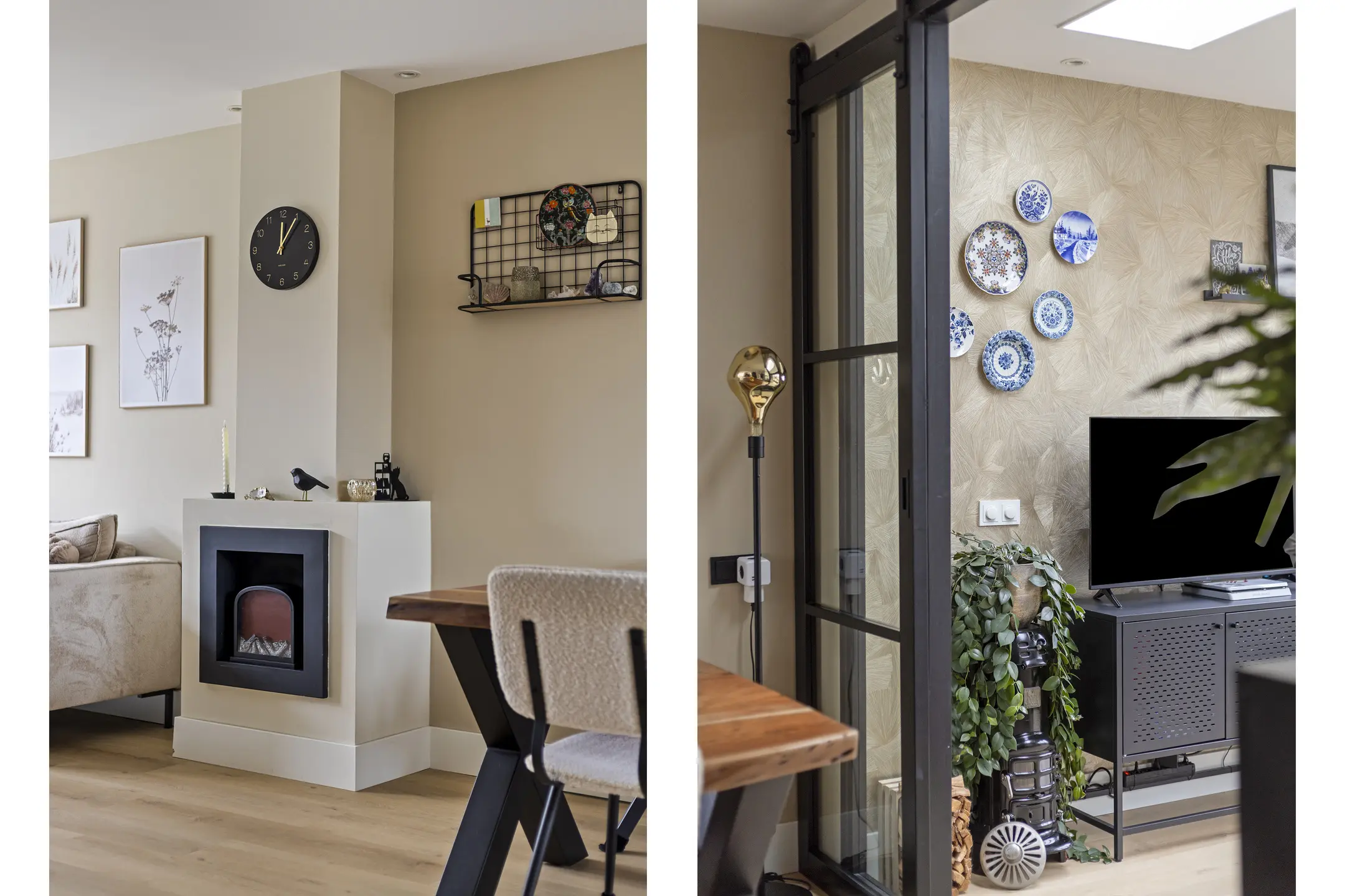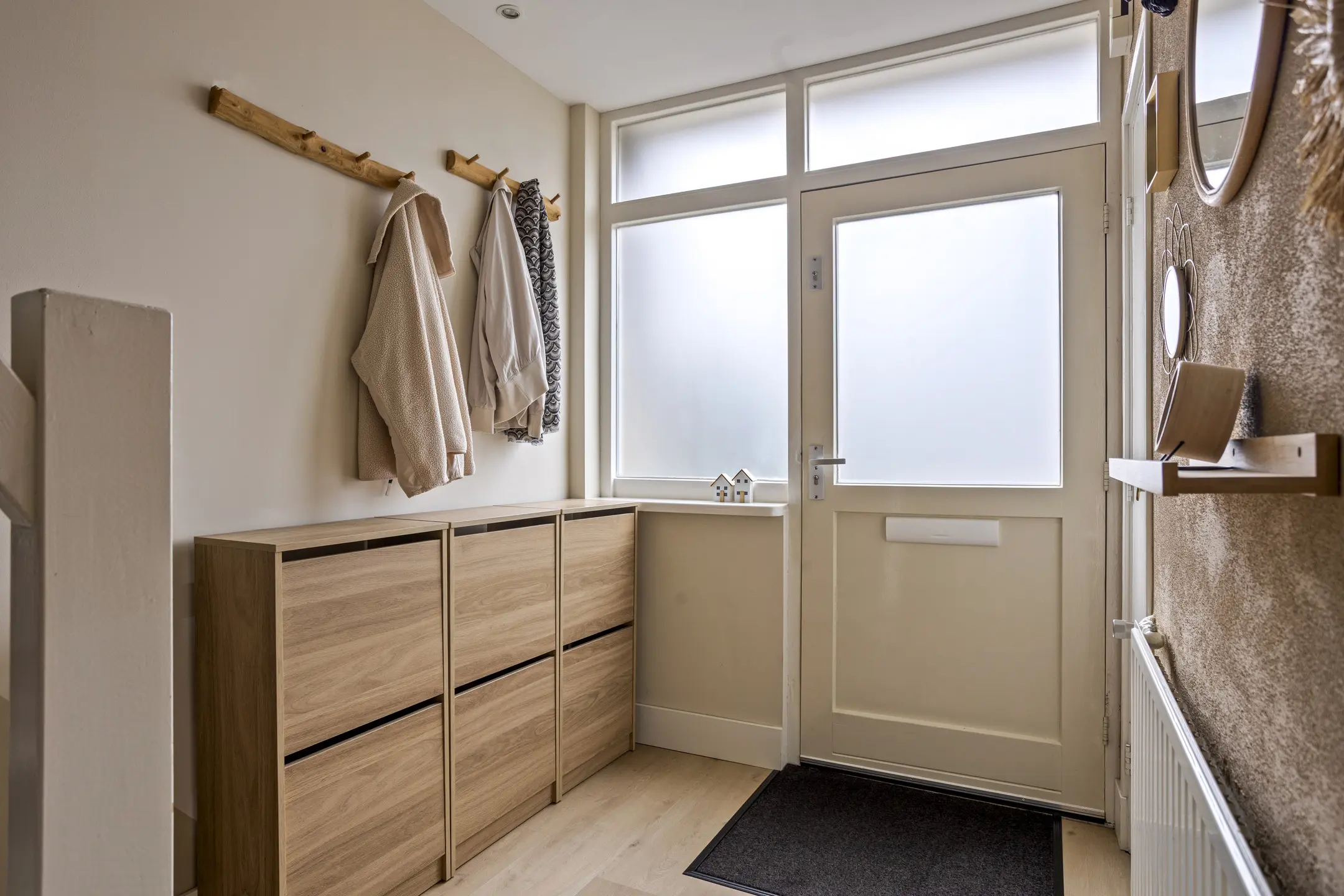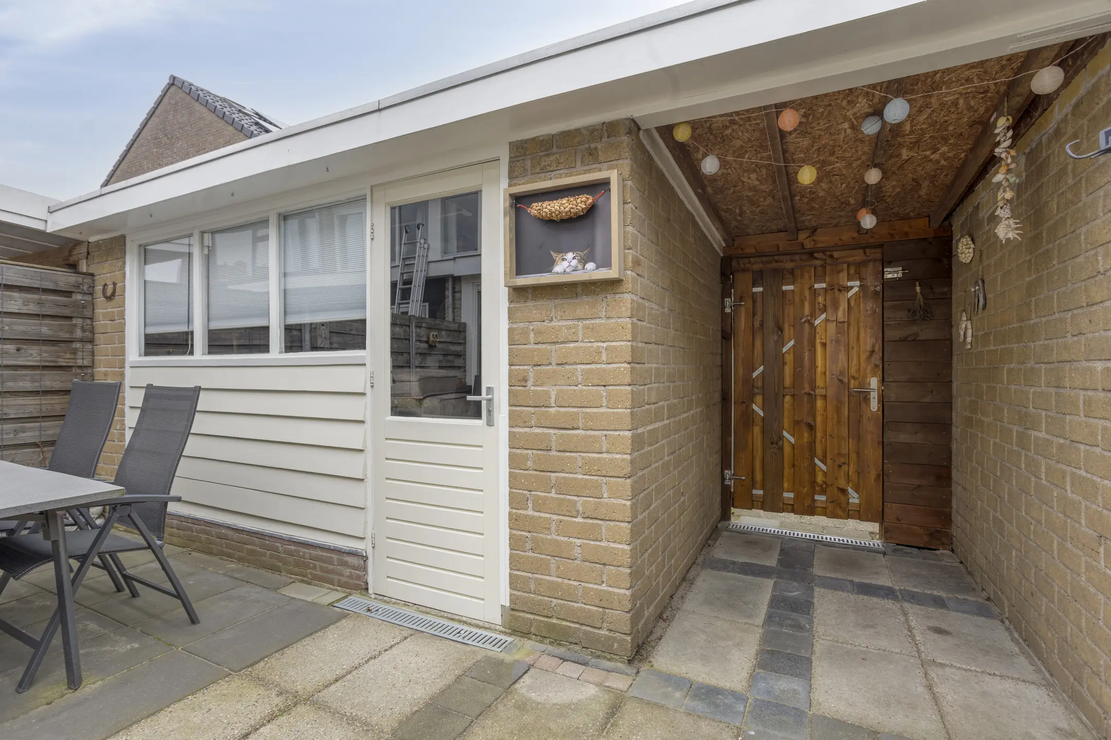 De woonkamer is opvallend licht door de grote raampartijen en biedt een vrij uitzicht aan zowel de voor- als achterzijde, wat zorgt voor een aangenaam gevoel van rust en privacy. De uitbouw aan de achterzijde vormt een volwaardig verlengstuk van de leefruimte en kan op stijlvolle wijze worden afgesloten met houten schuifdeuren. De openslaande deuren naar de achtertuin maken het eenvoudig om binnen en buiten met elkaar te verbinden, waardoor je op zonnige dagen optimaal geniet van het buitenleven. De achtertuin beschikt over een praktische stenen berging, achterom en vormt een fijne plek om te ontspannen.