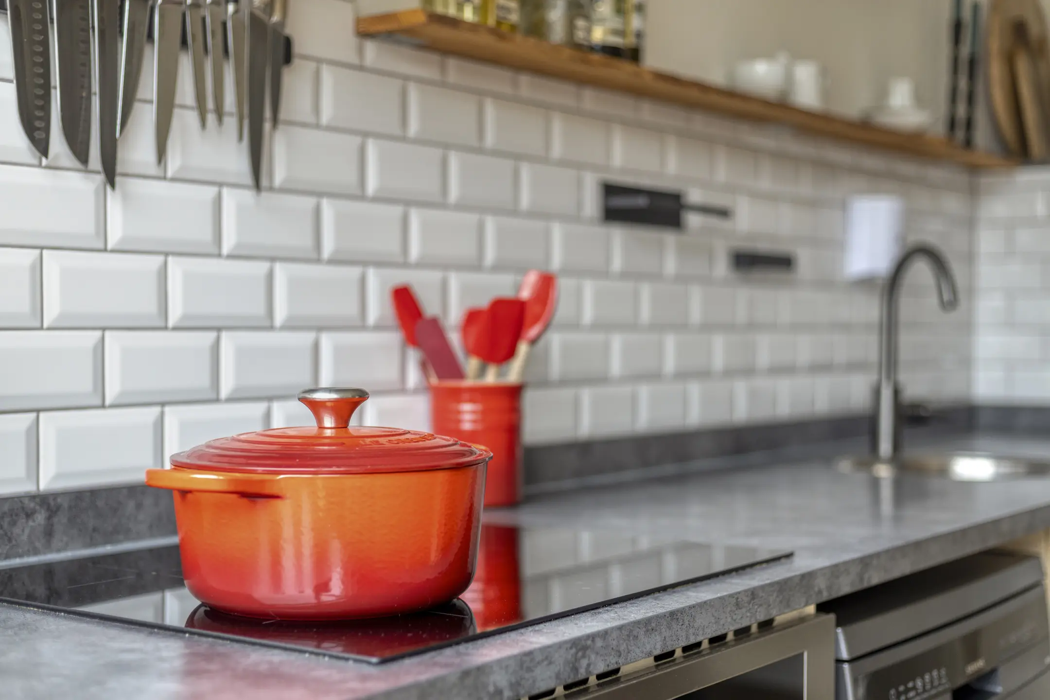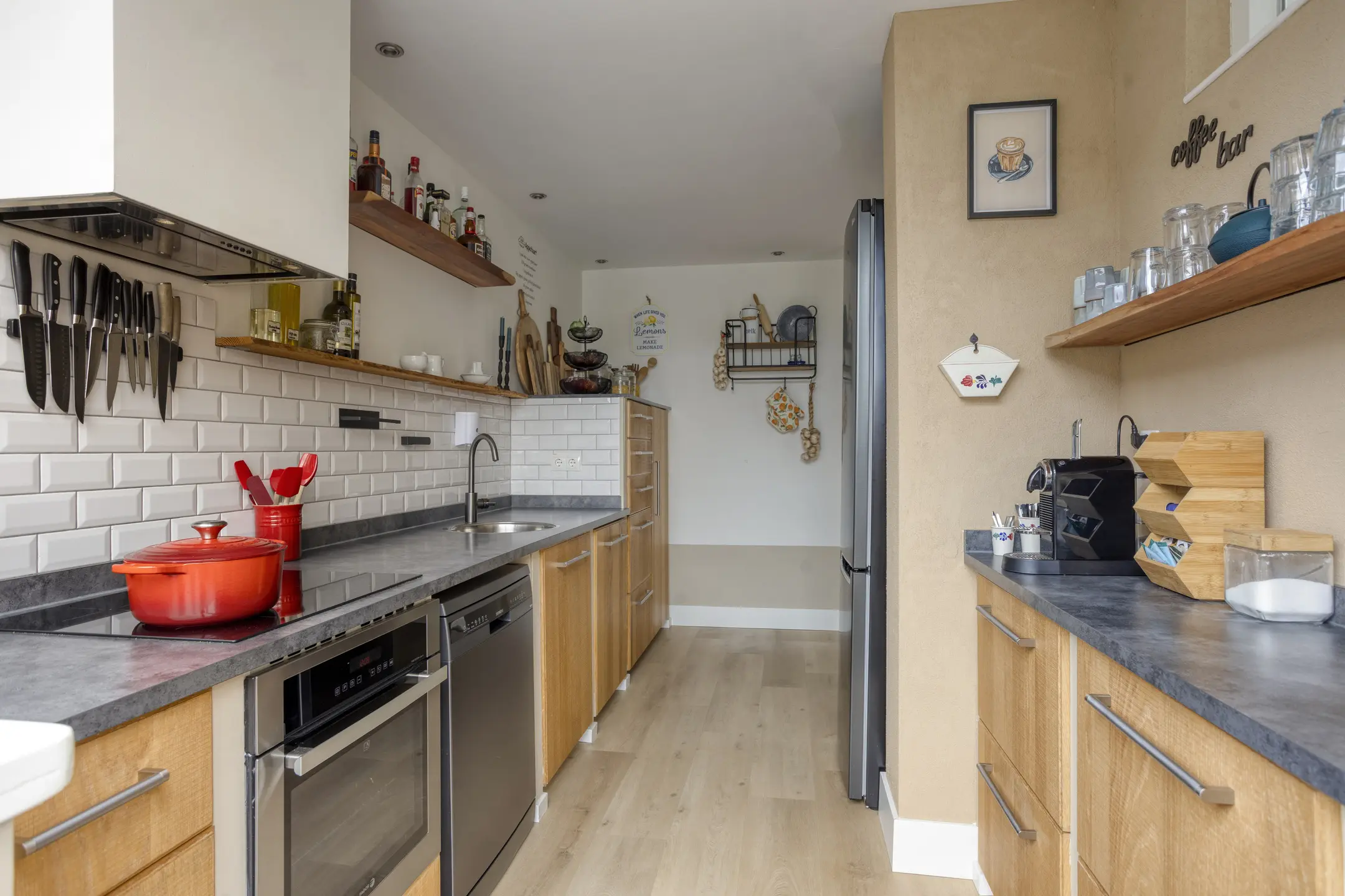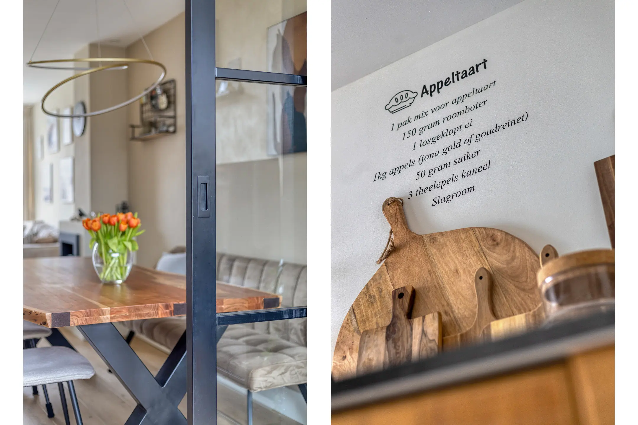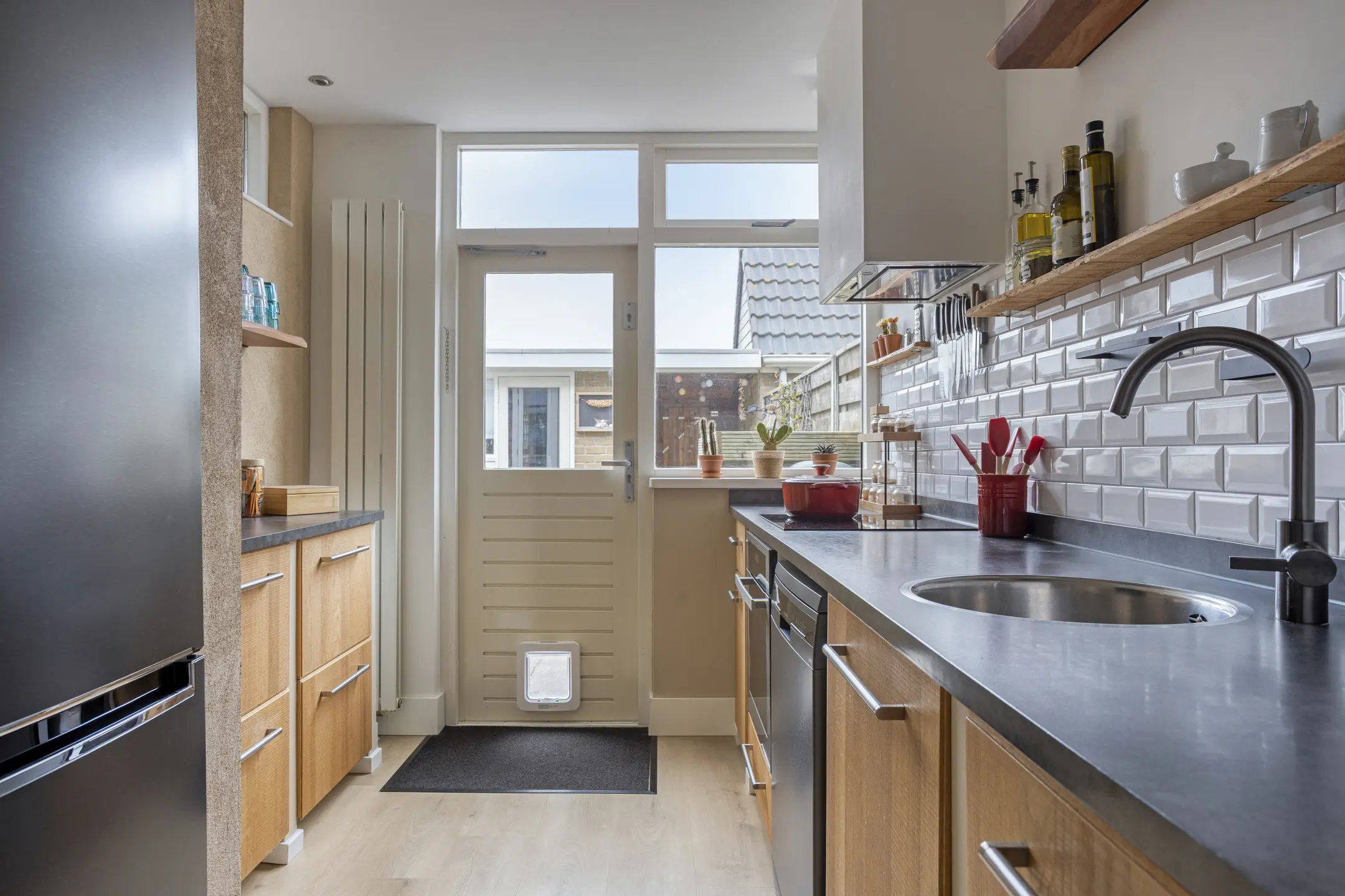 De moderne keuken is van alle gemakken voorzien en uitgerust met o.a. een koffie hoekje, (inbouw)apparatuur, waaronder een elektrische kookplaat, losse vaatwasser, oven en een losse koel-vriescombinatie. Vanuit de keuken is eveneens de achtertuin bereikbaar, wat bijdraagt aan het praktische gebruik van de ruimte.