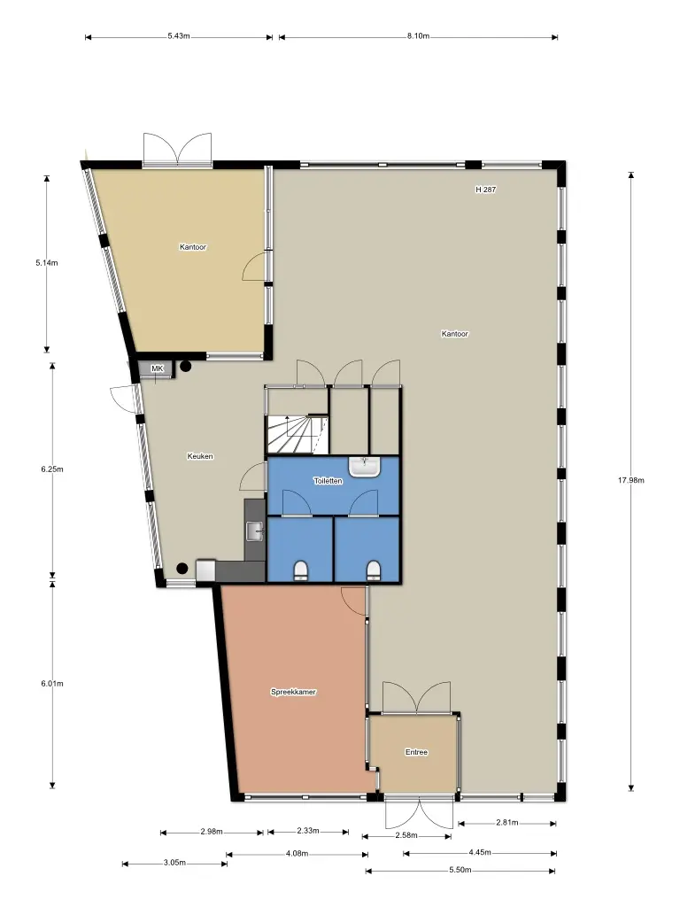 • Afgesloten kantoorruimte aan de achterzijde, keuken met inbouwapparatuur en twee toiletten