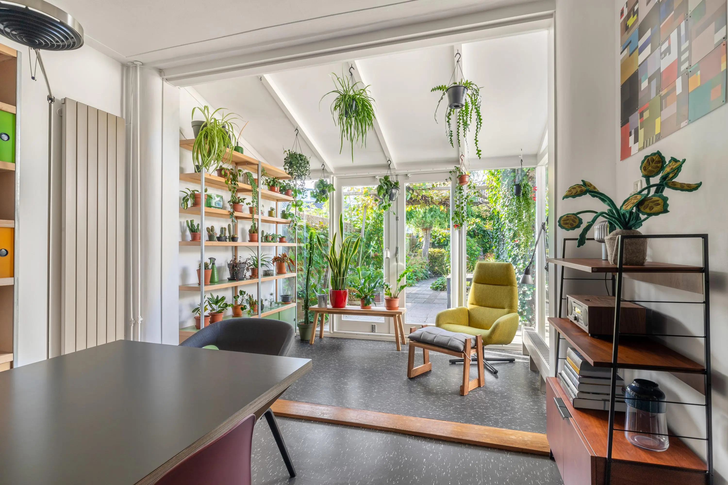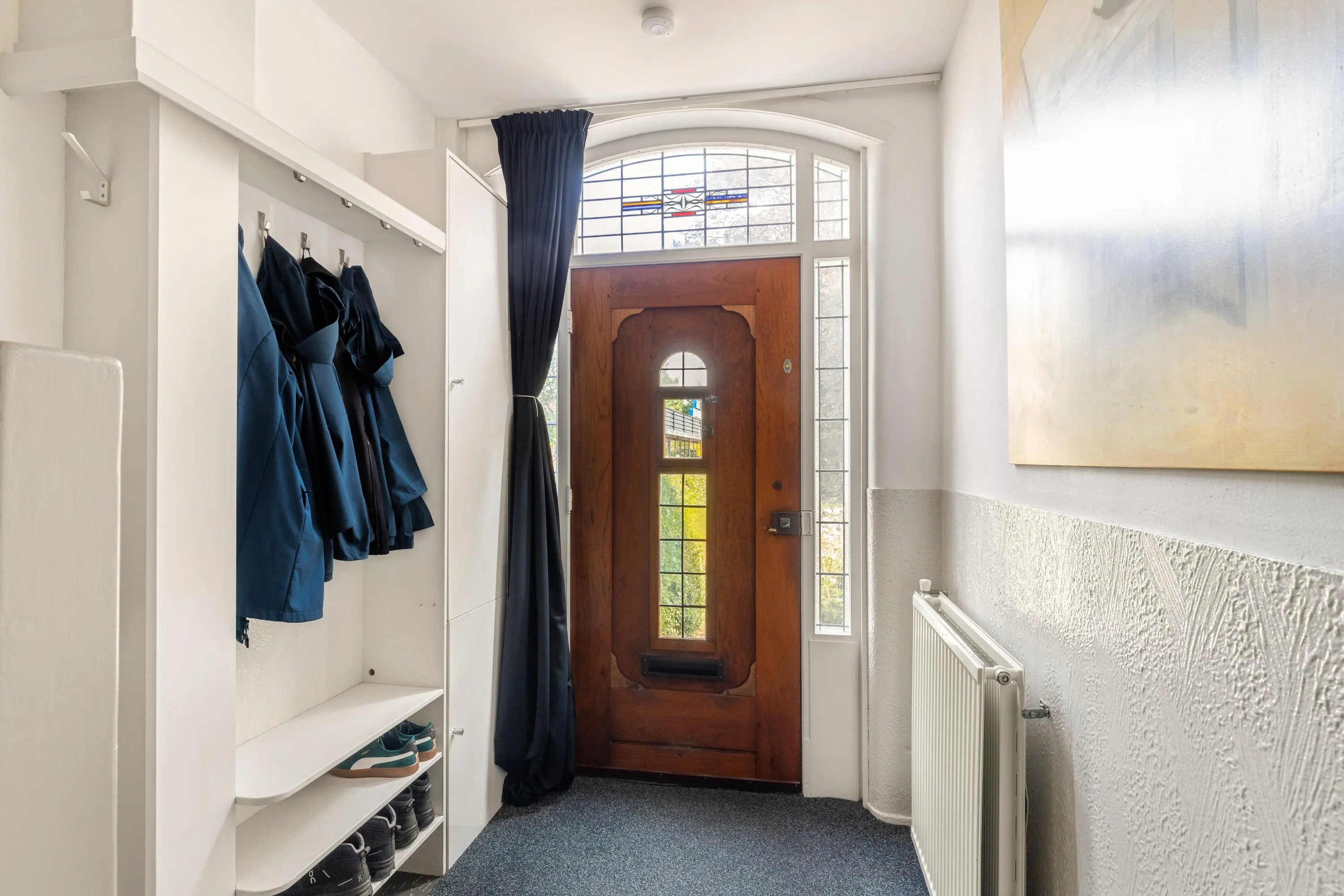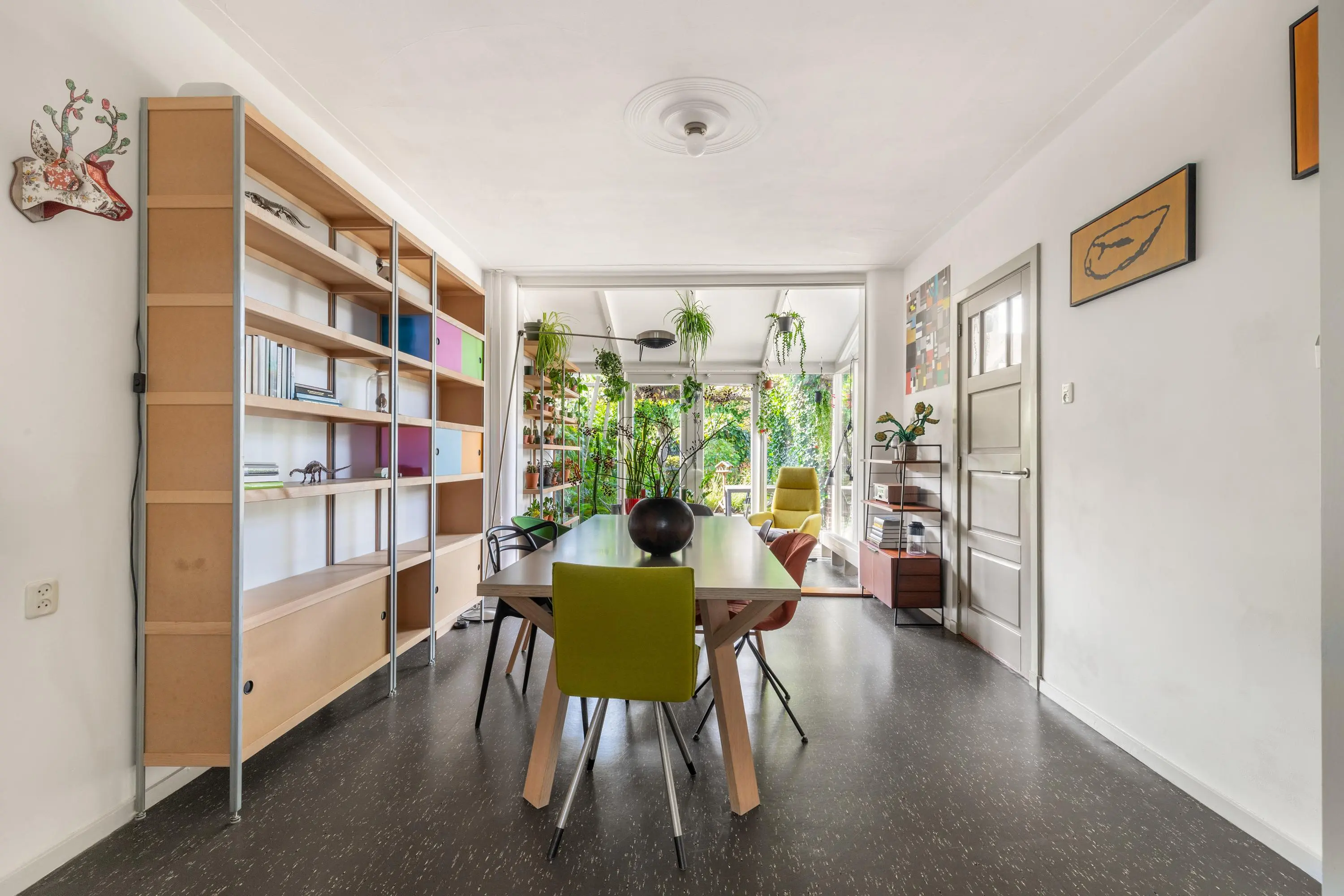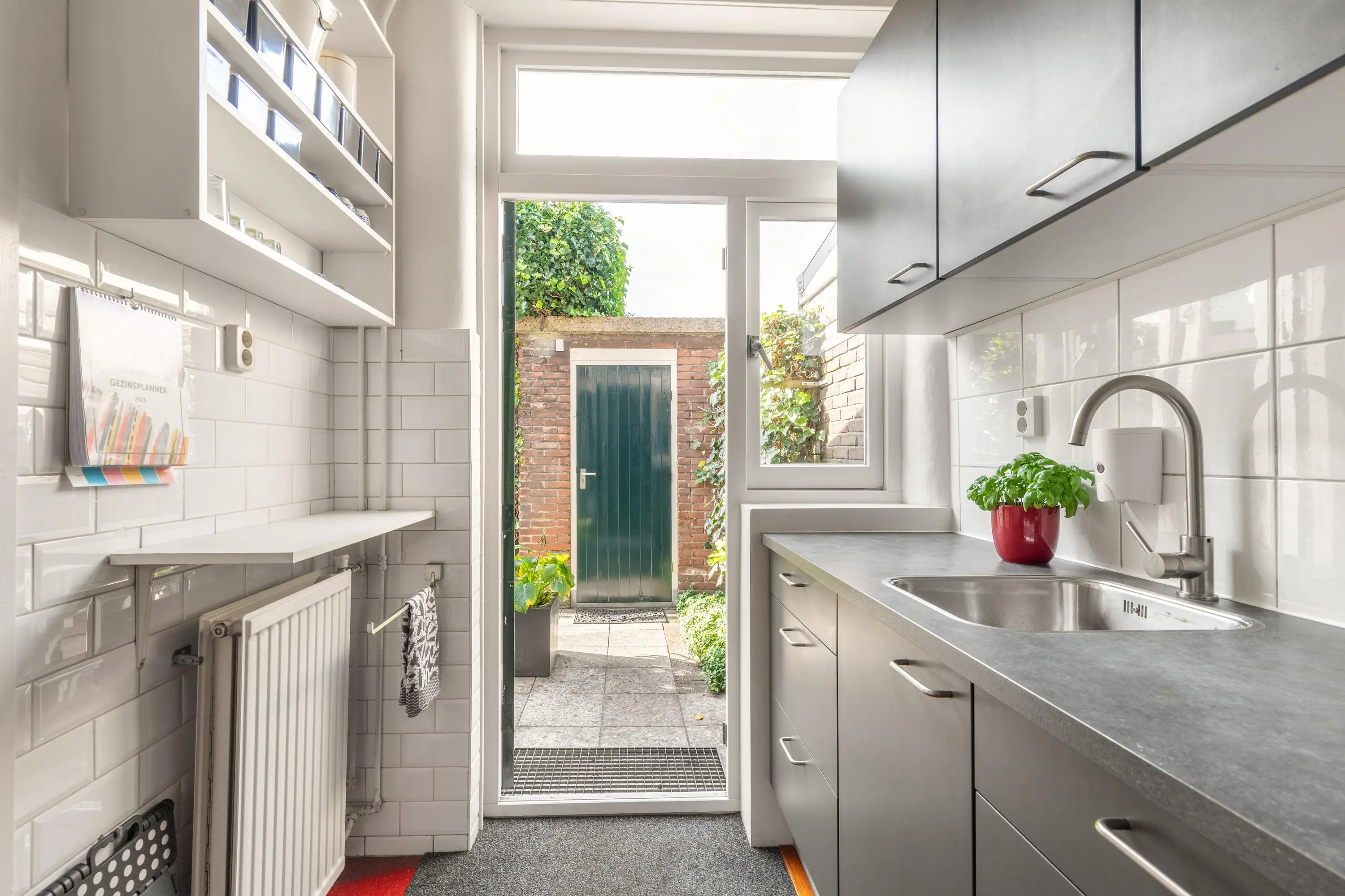 Bij binnenkomst valt direct op hoe open en licht de woning aanvoelt. De prachtige glas-in-looddeuren geven de ruimte extra karakter en de woonkamer biedt bovendien een prettige doorloop naar de zonnige tuinkamer en de fraai aangelegde achtertuin. De keuken bevindt zich aan de achterzijde van de woning en is voorzien van diverse inbouwapparatuur, waaronder een inductie kookplaat, afzuigkap, heteluchtoven en koel-vriescombinatie. De keuken biedt daarnaast ook toegang tot de achtertuin.