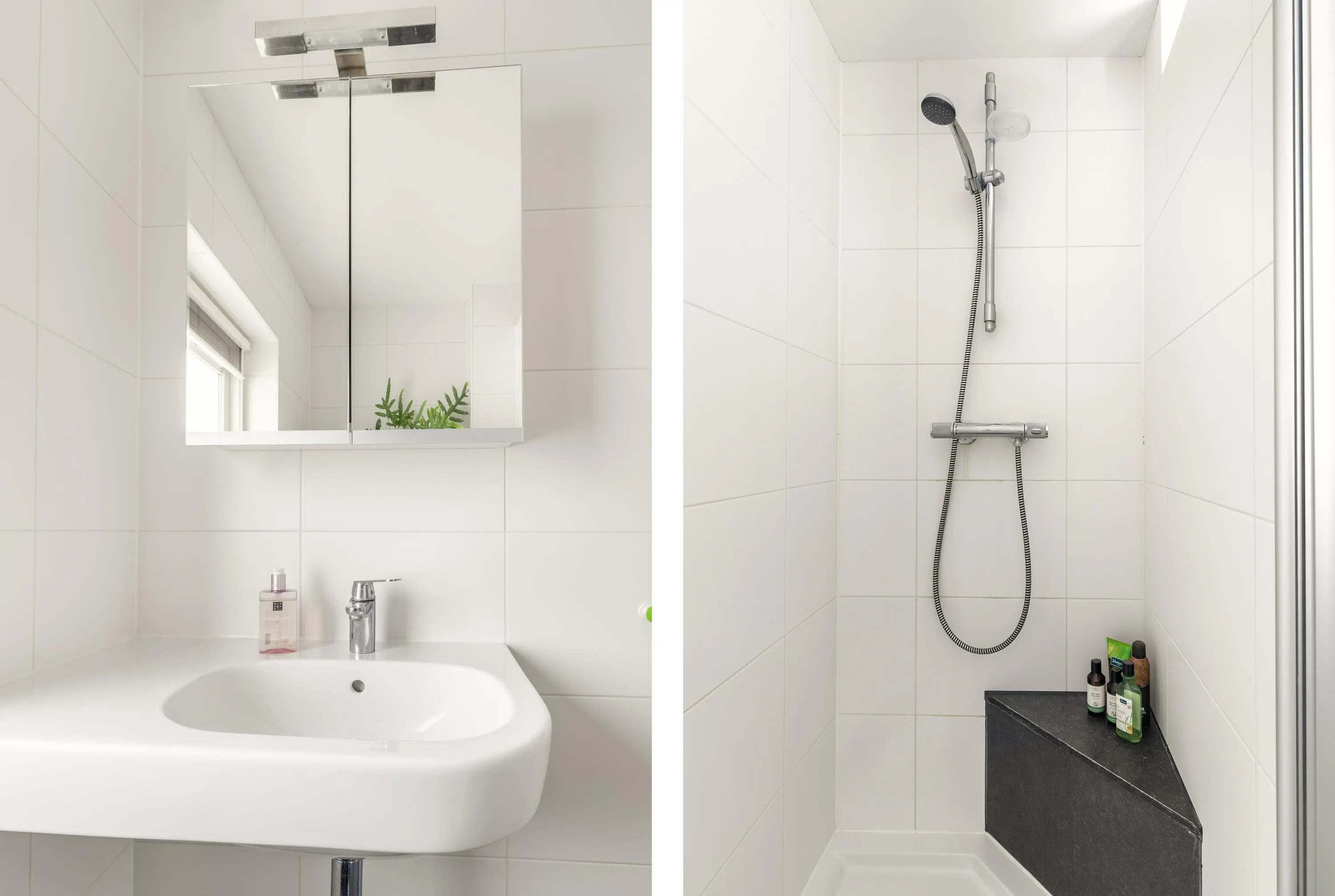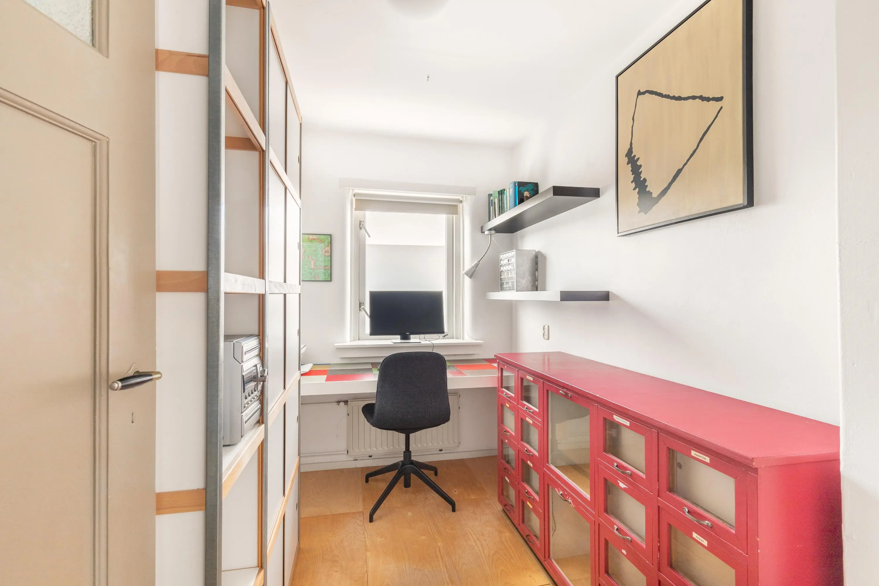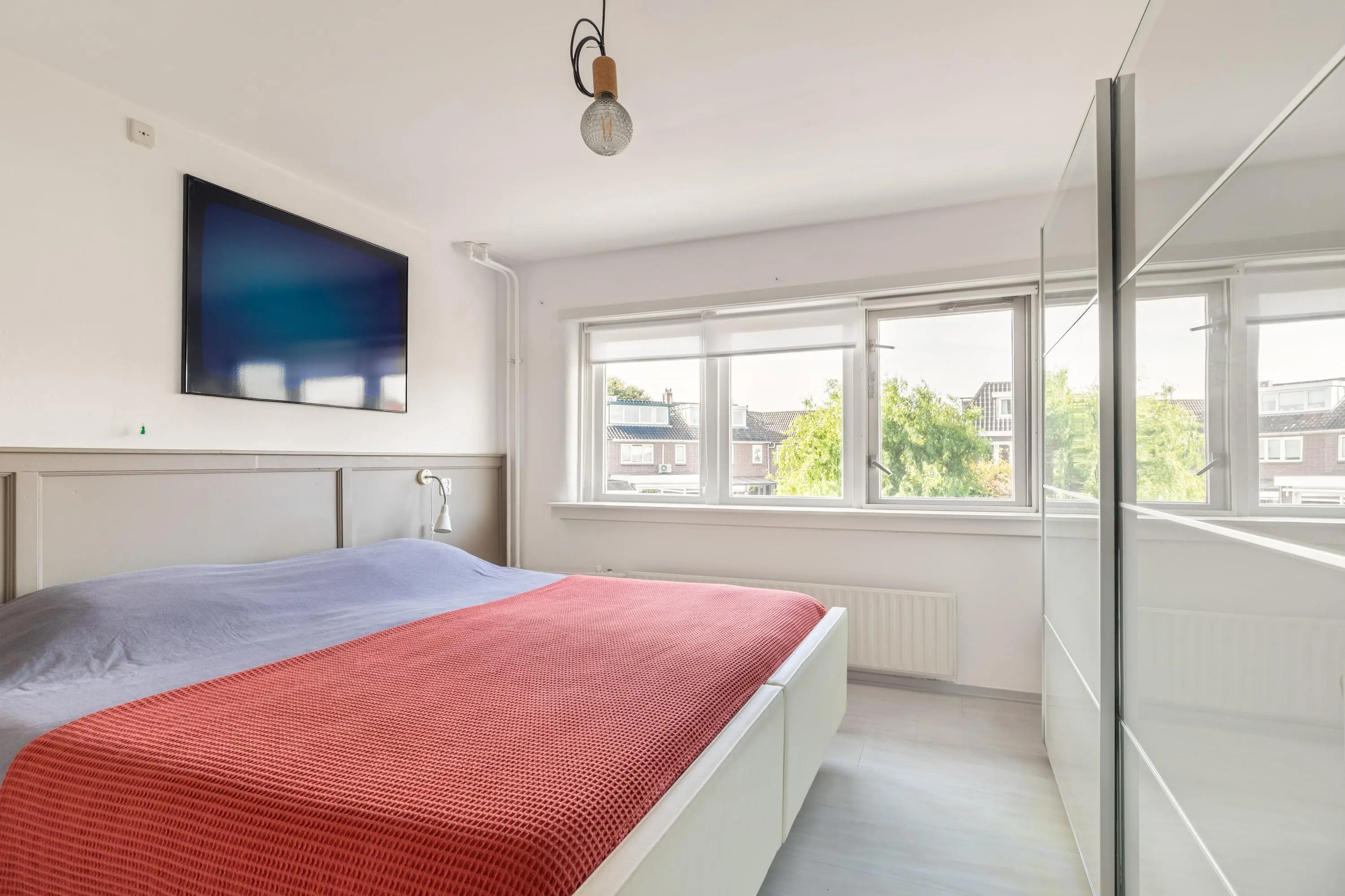 Op de eerste verdieping bevinden zich drie ruime slaapkamers, elk eenvoudig in te richten als slaap-, werk- of studeerkamer. De twee slaapkamers aan de linkerzijde van de woning zijn tevens voorzien van een handige inbouwkast. De nette badkamer is voorzien van een wastafel, douche en toilet. Op de overloop vind je tevens nog een kast voor extra opbergruimte.